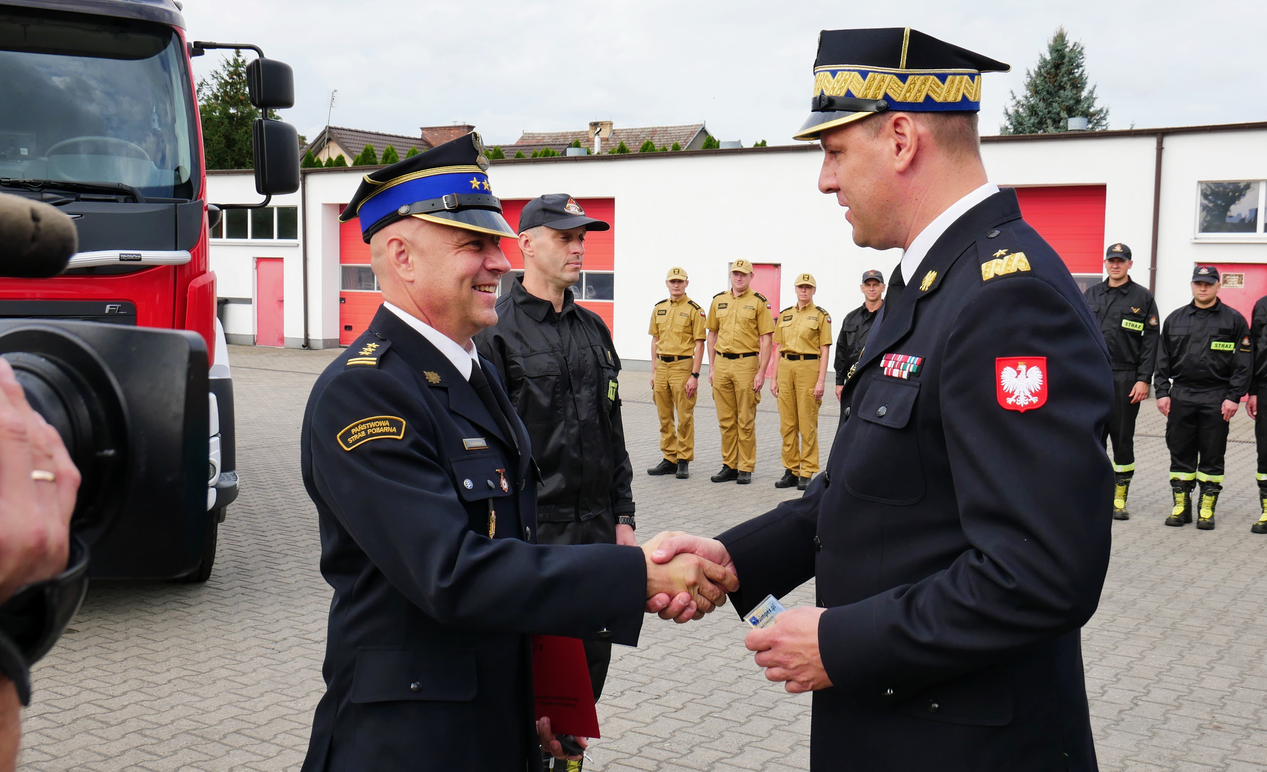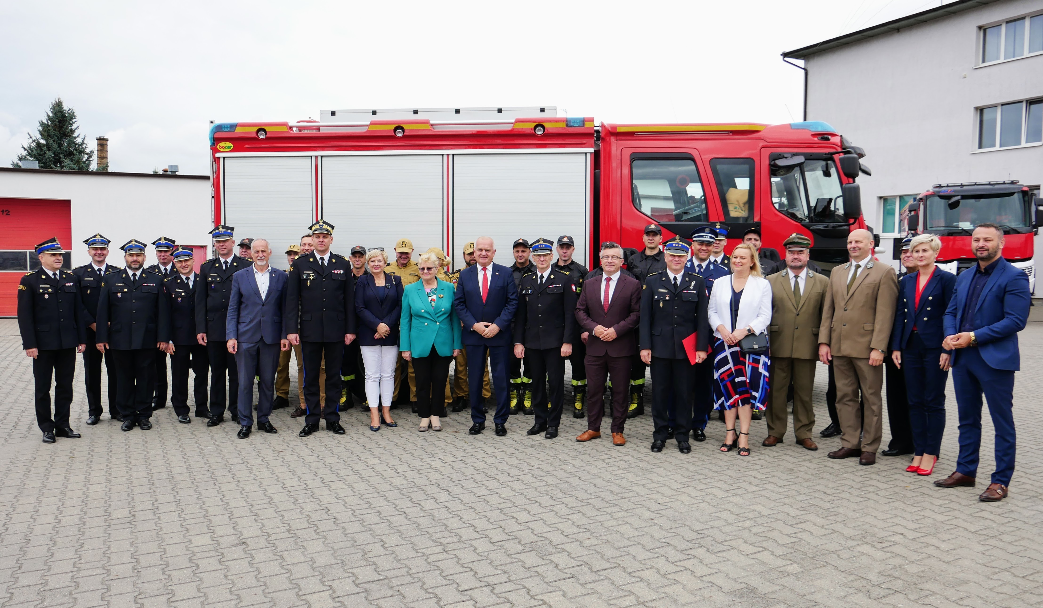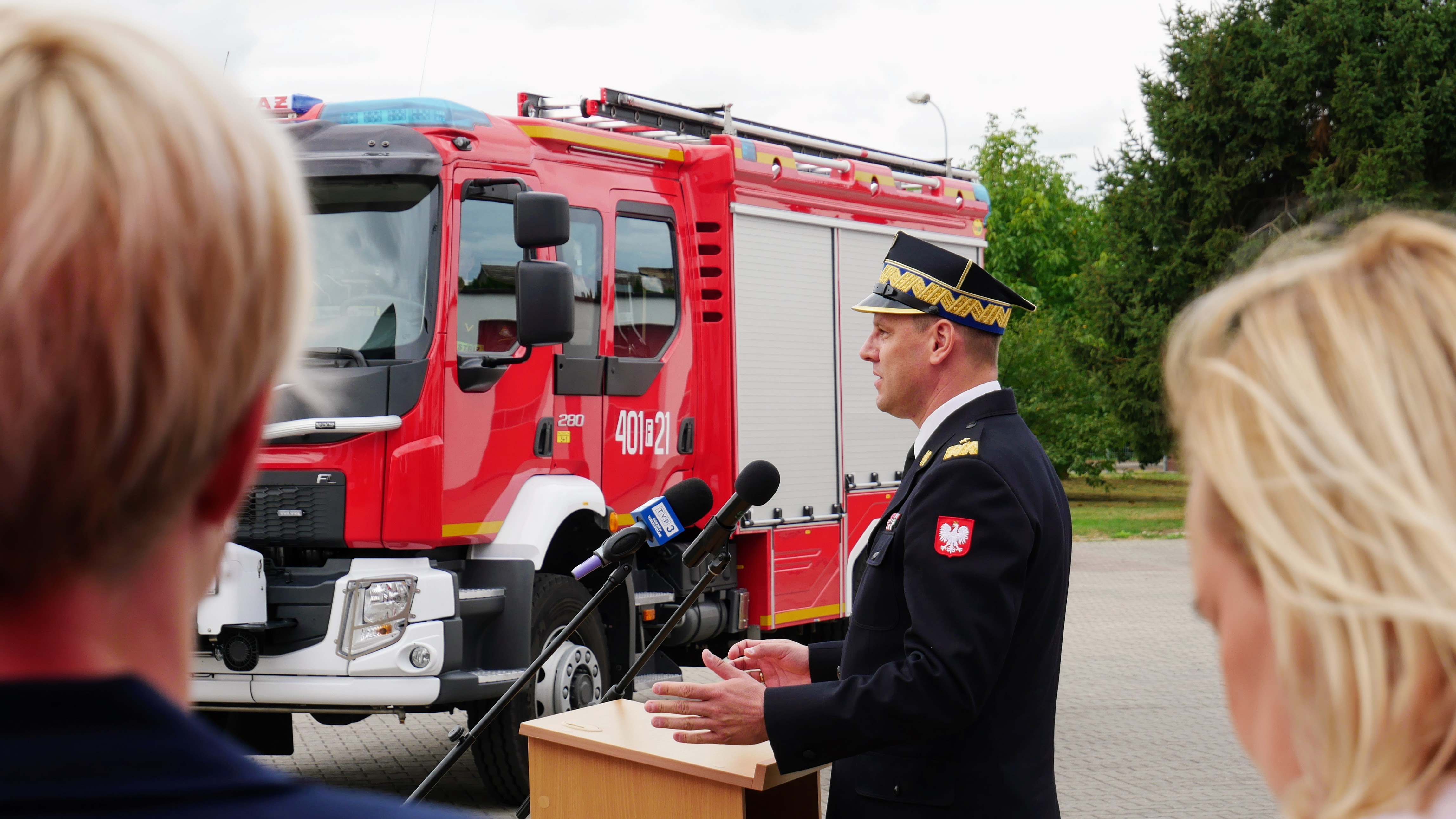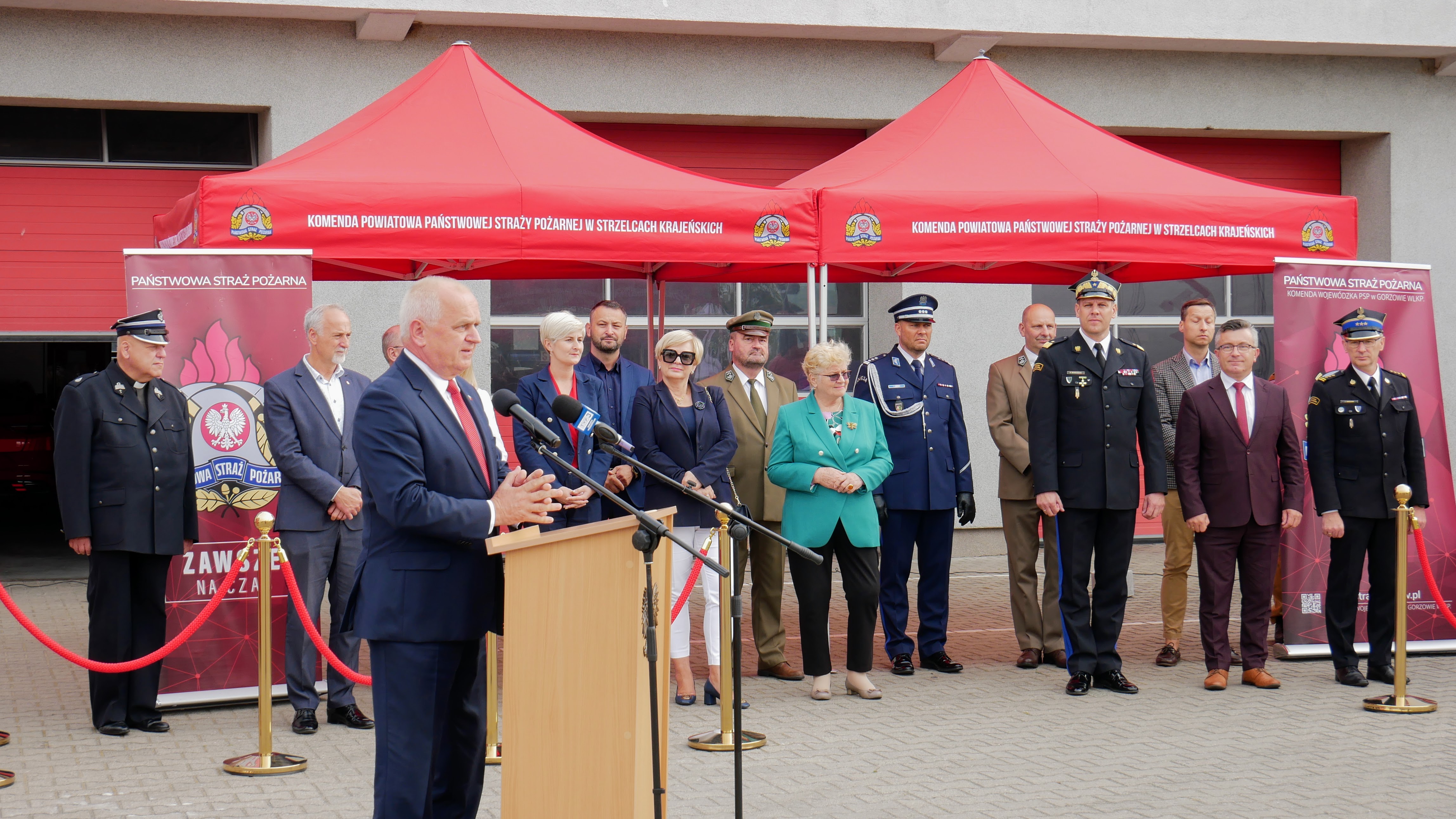 Na placu przed Komendą Powiatową Państwowej Straży Pożarnej, Lubuski Komendant Wojewódzki PSP nadbryg. Patryk Maruszak wraz z Wojewodą Lubuskim Władysławem Dajczakiem oraz Posłem na Sejm RP Elżbietą Płonką, wręczył akt przekazania pojazdu Komendantowi Powiatowemu PSP w Strzelcach Krajeńskich st. bryg. Tomaszowi Górniakowi.