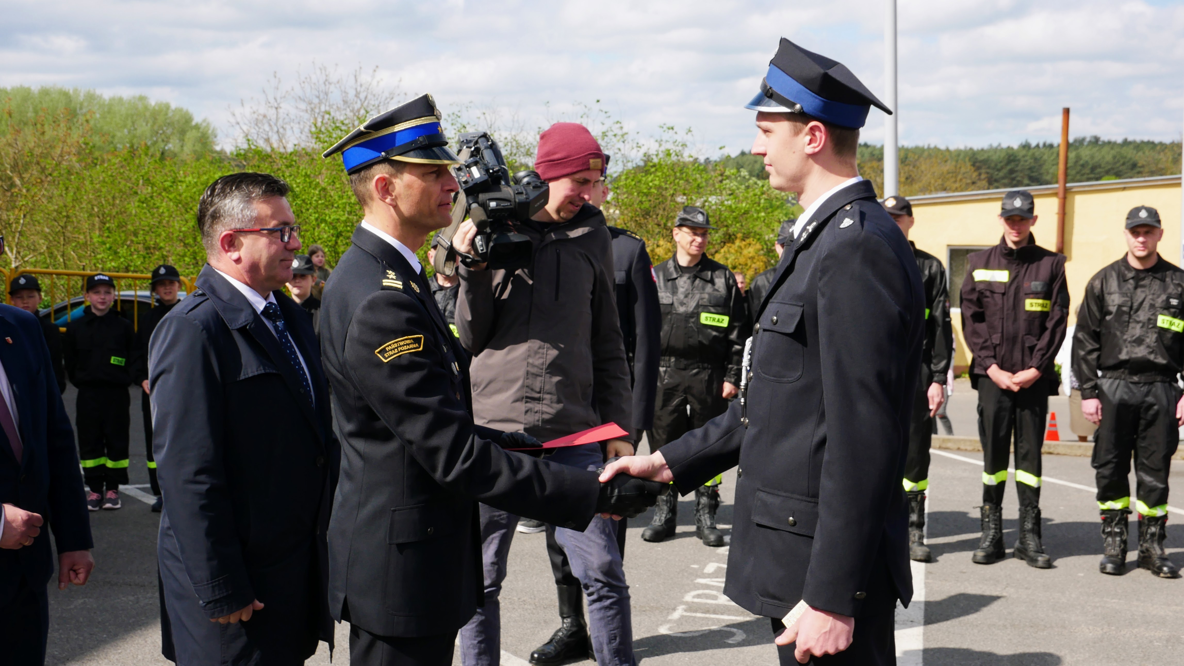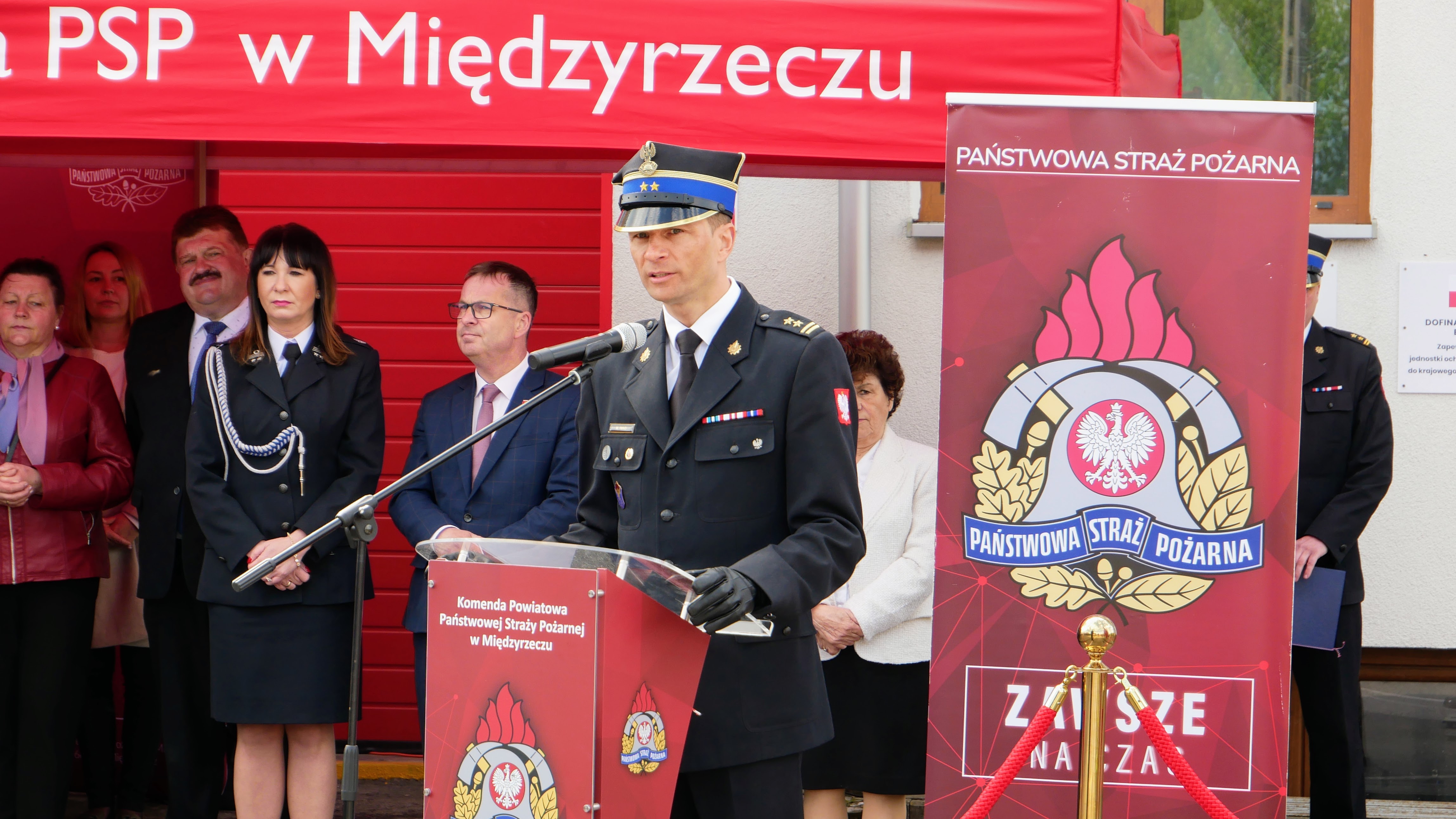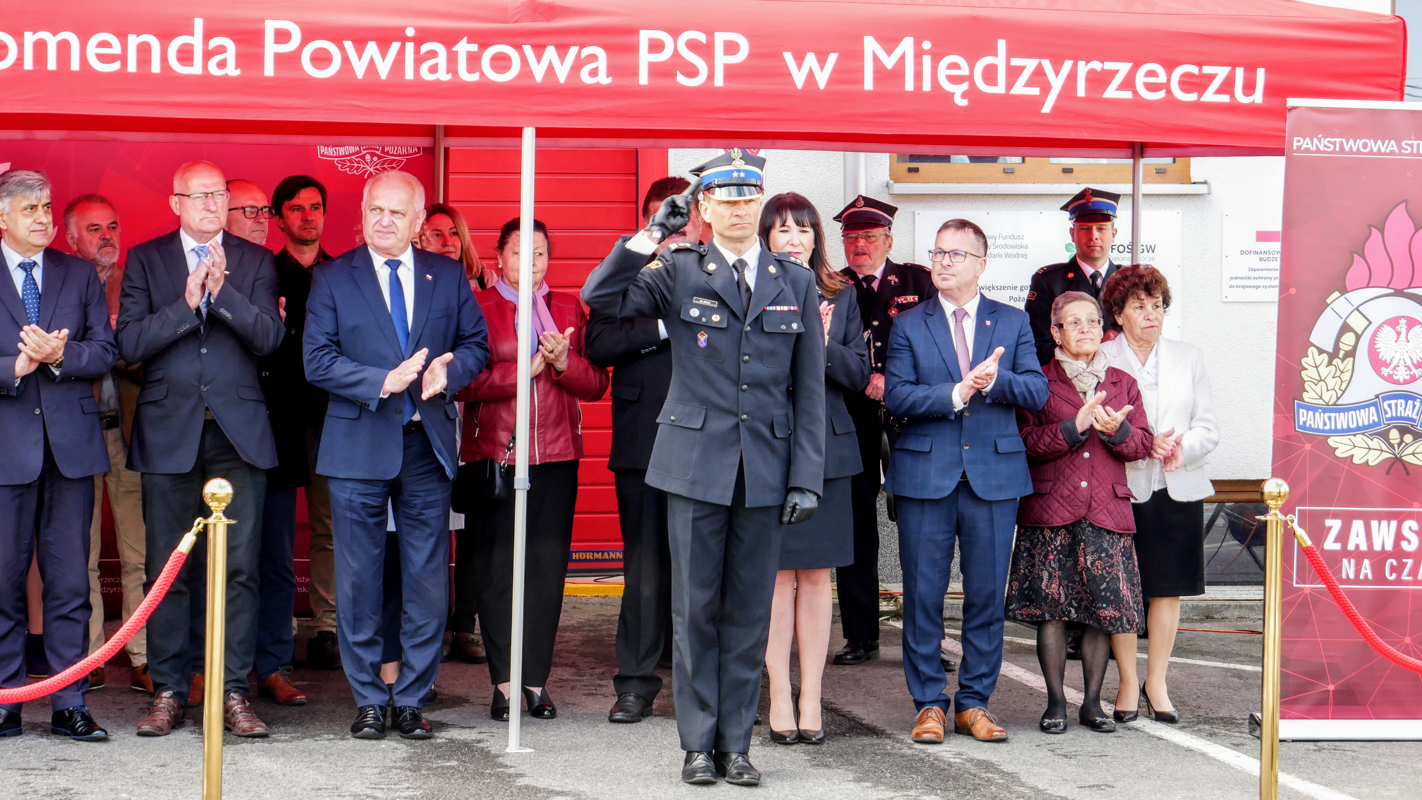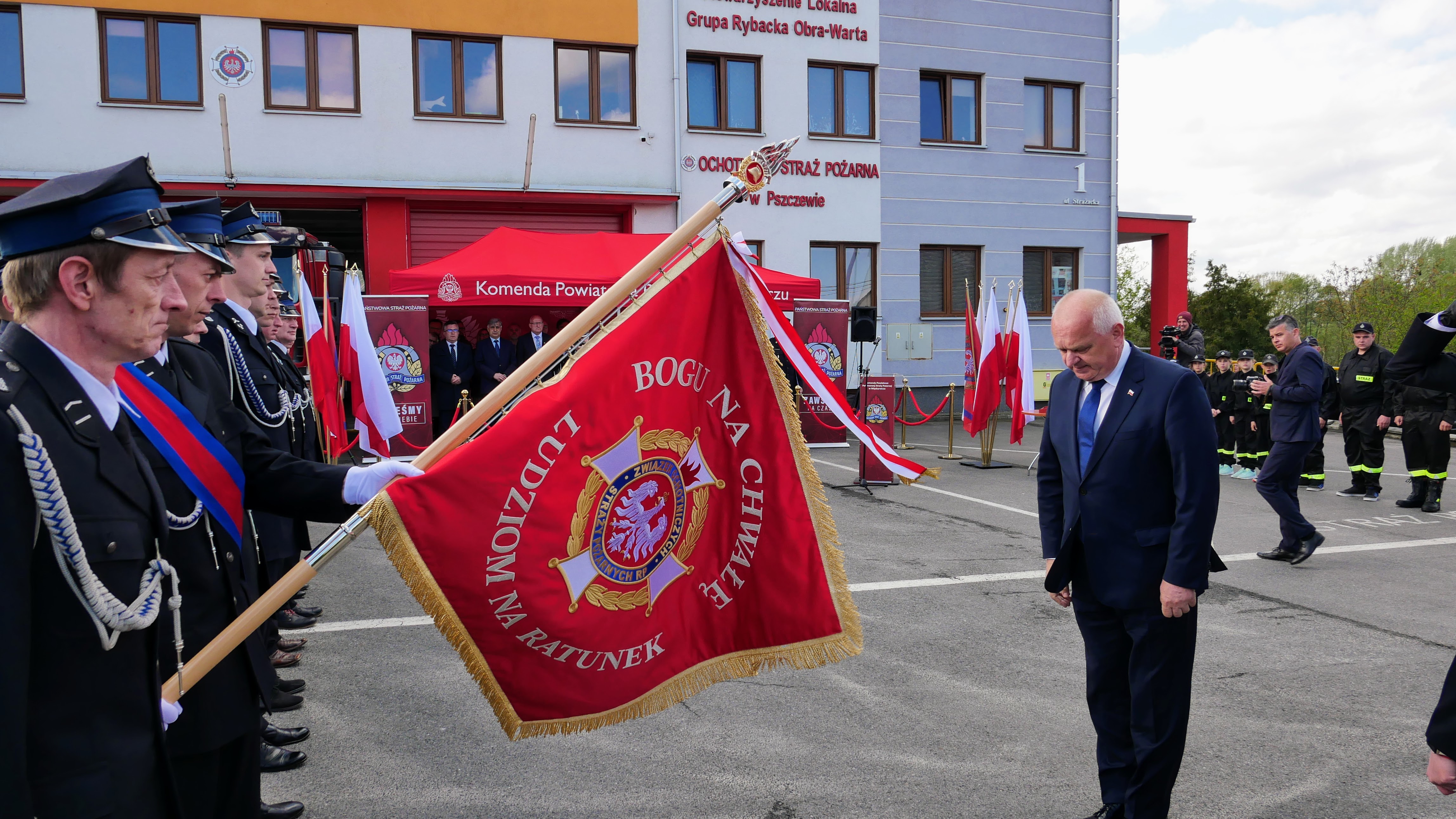 Zastępca Lubuskiego Komendanta Wojewódzkiego bryg. Maciej Iwko wraz z Wojewodą Lubuskim Władysławem Dajczakiem, Posłem na Sejm RP Jackiem Kurzepą, Prezesem Zarządu Wojewódzkiego Funduszu Ochrony Środowiska i Gospodarki Wodnej w Zielonej Górze Mariuszem Herbutem oraz Wójtem Gminy Pszczew Józefem Piotrowskim, wręczył akt przekazania pojazdu Wiceprezesowi OSP Pszczew dh Danielowi Suszczyńskiemu.