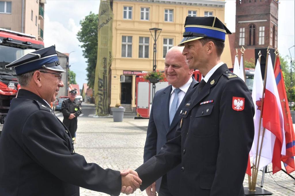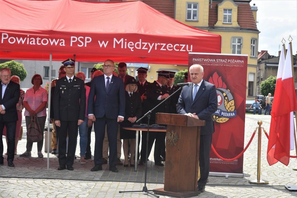 Zastępca Lubuskiego Komendanta Wojewódzkiego bryg. Maciej Iwko wraz z Wojewodą Lubuskim Władysławem Dajczakiem i Prezesem Zarządu Wojewódzkiego Funduszu Ochrony Środowiska i Gospodarki Wodnej w Zielonej Górze Mariuszem Herbutem, wręczył akt przekazania pojazdu Wiceprezesowi OSP Skwierzyna dh Waldemarowi Kowalewskiemu.