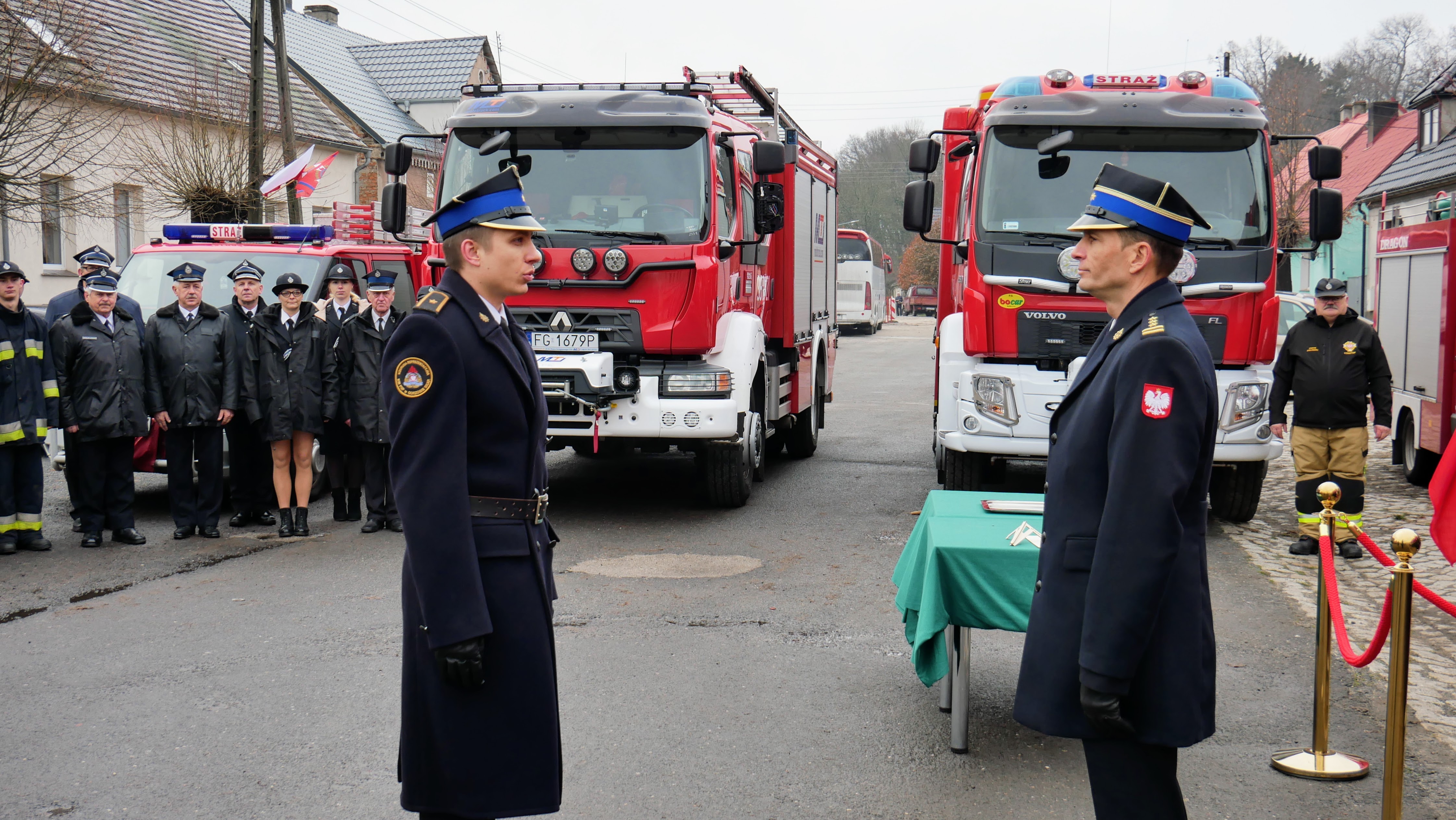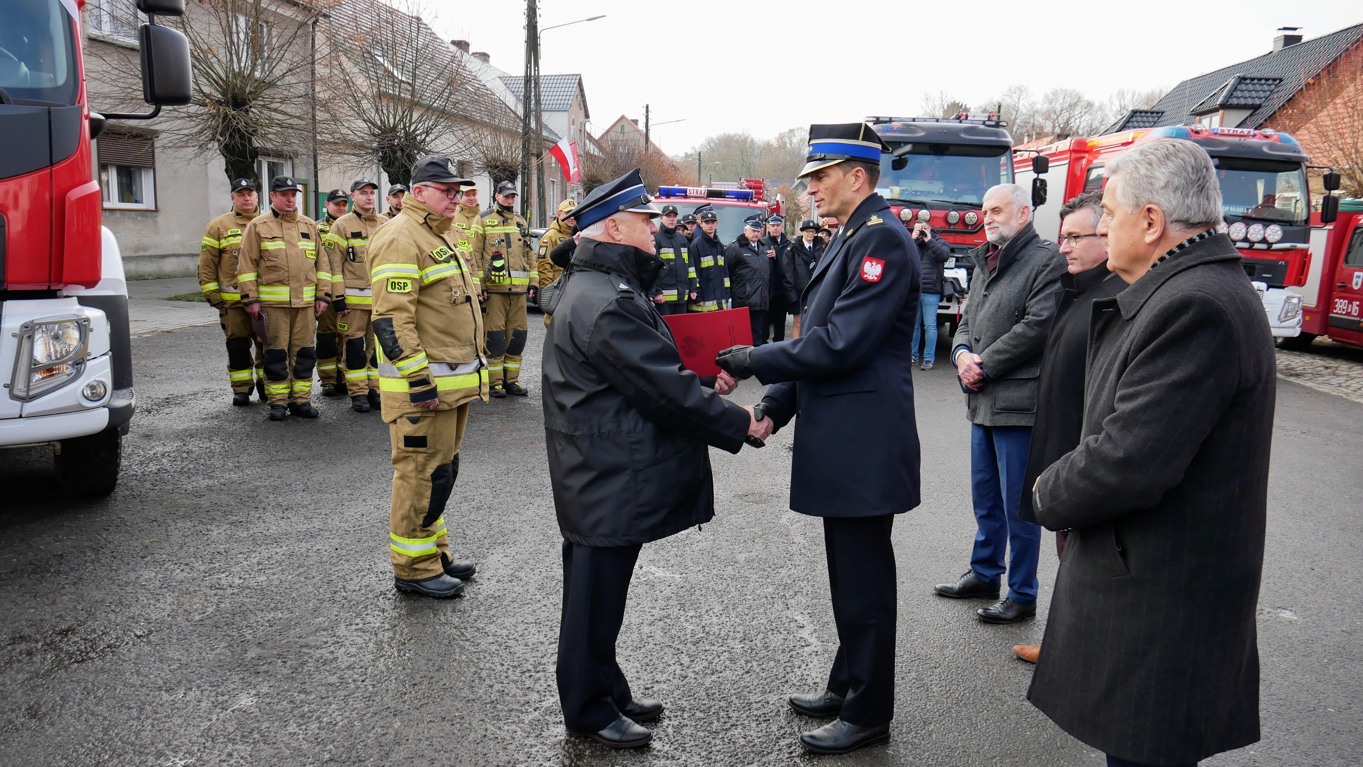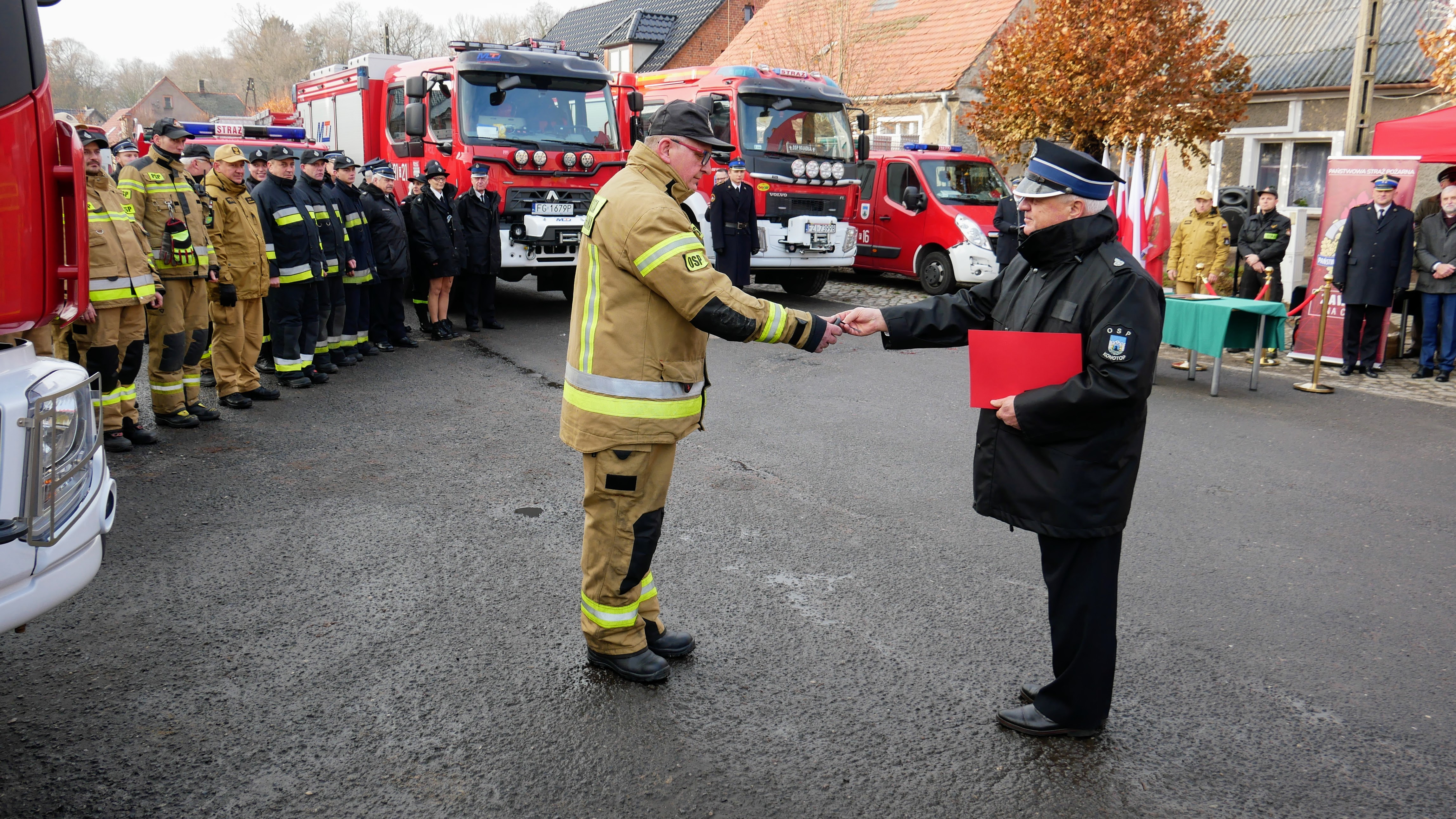 Zastępca Lubuskiego Komendanta Wojewódzkiego Państwowej Straży Pożarnej st.bryg. Maciej Iwko wraz z Wicewojewodą Lubuskim Wojciechem Perczakiem, Prezesem Zarządu Wojewódzkiego Funduszu Ochrony Środowiska i Gospodarki Wodnej w Zielonej Górze Mariuszem Herbutem oraz Wójtem Gminy Kolsko Henrykiem Matysikiem, wręczył akt przekazania pojazdu Prezesowi OSP Konotop dh Zdzisławowi Łukaszewskiemu.
