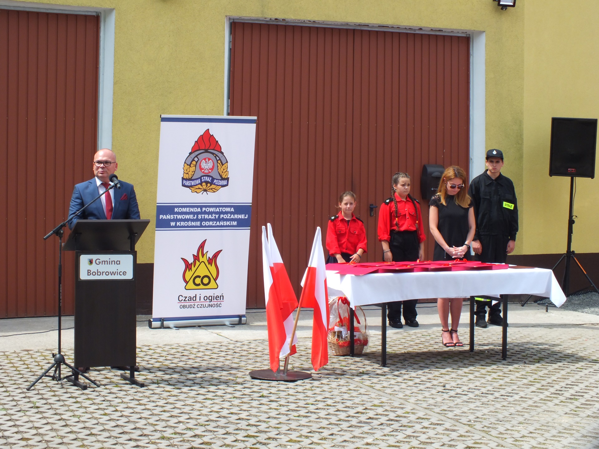 Uroczystość rozpoczęła się od złożenia meldunku dowódcy uroczystości dla Zastępcy Lubuskiego Komendanta Wojewódzkiego Państwowej Straży Pożarnej st. bryg. Janusza Drozdy, po czym nastąpiło podniesienie flagi państwowej i odegranie hymnu państwowego.