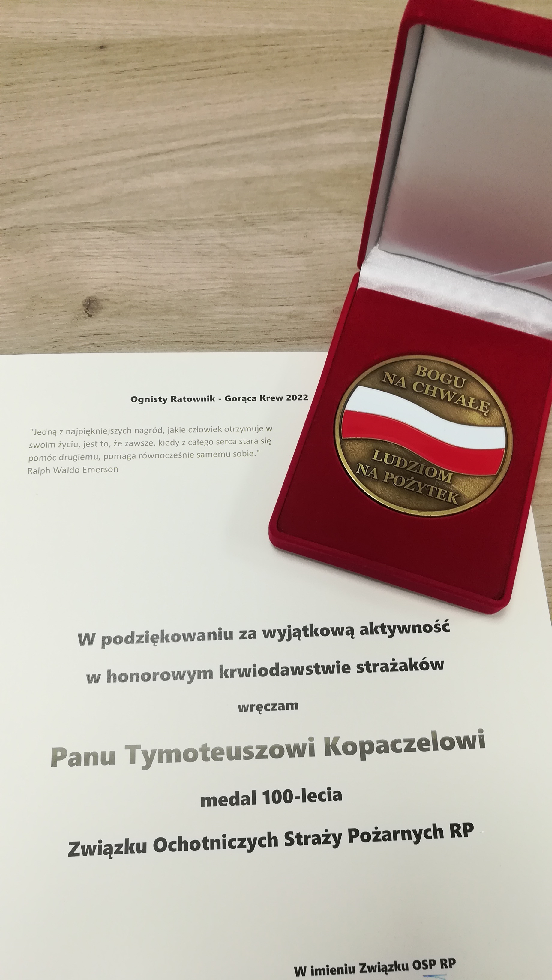 Prezes Klubu HDK Ognista Kropla st. sekc. Tymoteusz Kopaczel w podziękowaniu za wyjątkową aktywność w honorowym krwiodawstwie strażaków odebrał z rąk Prezesa Zarządu Oddziału Wojewódzkiego ZOSP RP woj. lubuskiego druha Edwarda Fedko -