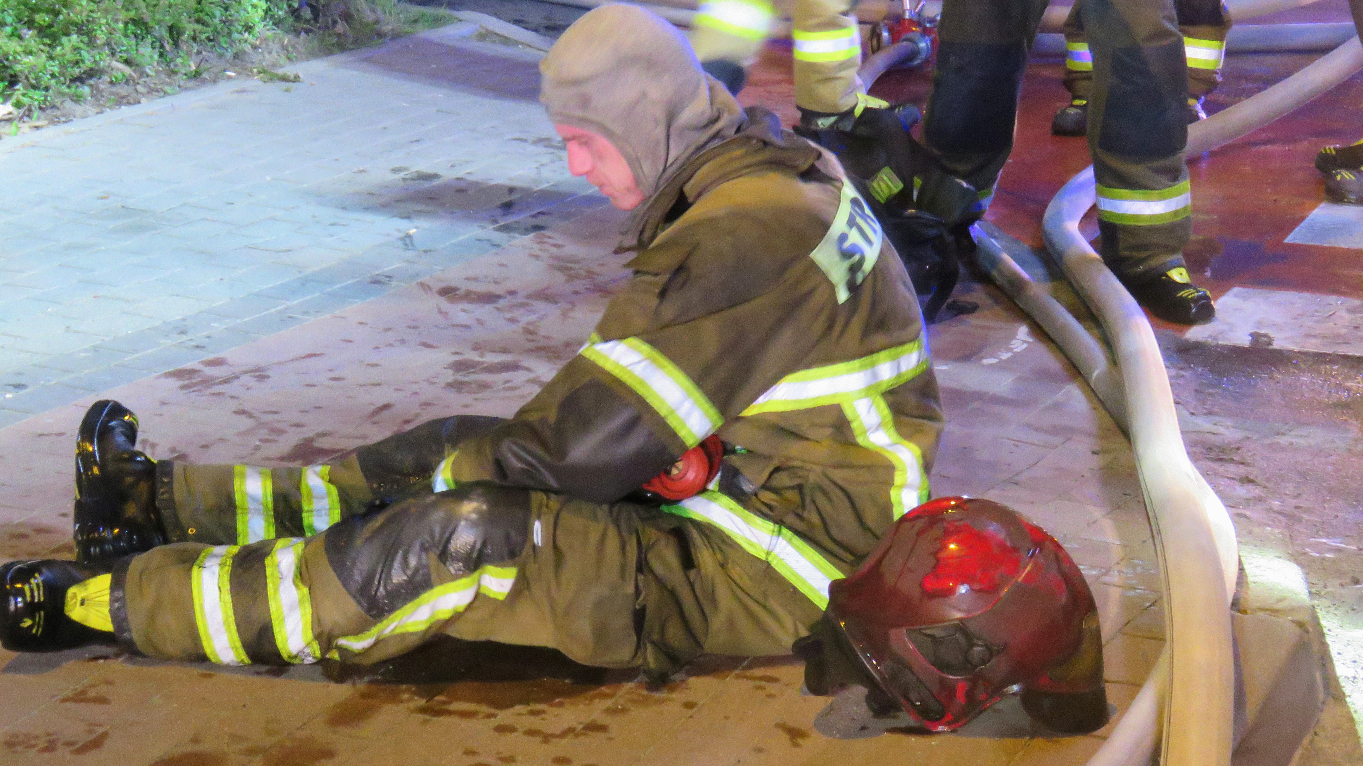 Dym wydobywający się z całej przestrzeni podziemnego parkingu wskazywał na to, że pożar rozwija się w tej części budynku. Natychmiast przystąpiono do rozwijania linii gaśniczych.