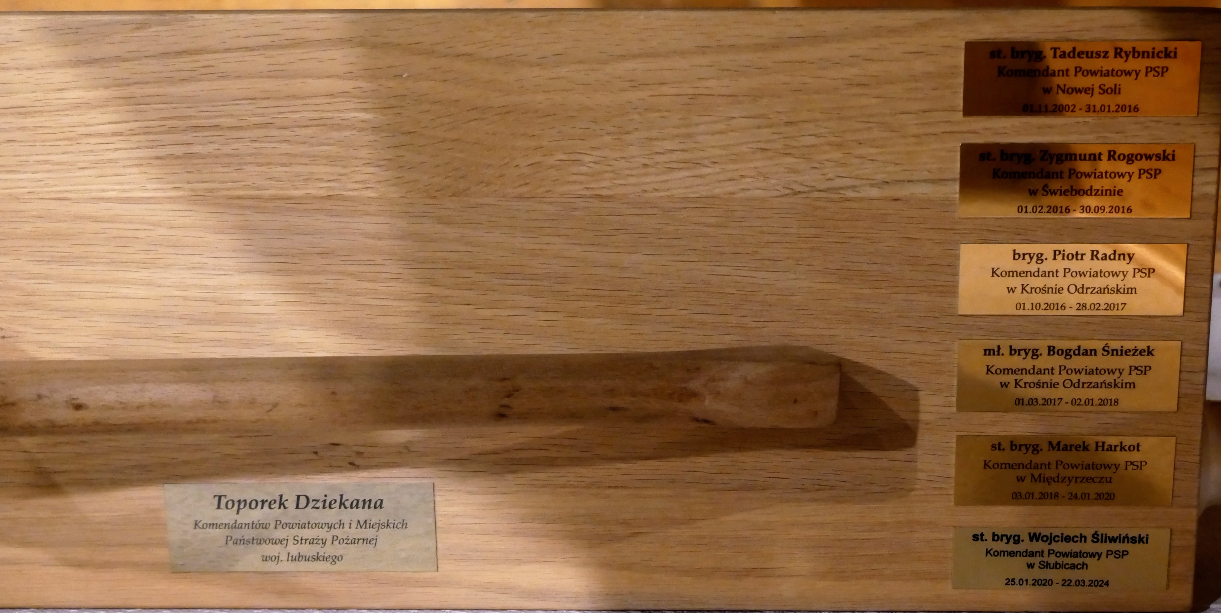 Uroczystość zakończyło przekazanie „Toporka Dziekana Komendantów Miejskich i Powiatowych Państwowej Straży Pożarnej woj. lubuskiego” bryg. Mariuszowi Wójcikowi – Komendantowi Powiatowemu PSP w Świebodzinie. Statuetka przekazywana jest od wielu lat pozostającemu w służbie Komendantowi PSP woj. lubuskiego, który posiada najdłuższy staż na stanowisku Komendanta powiatowego lub miejskiego.