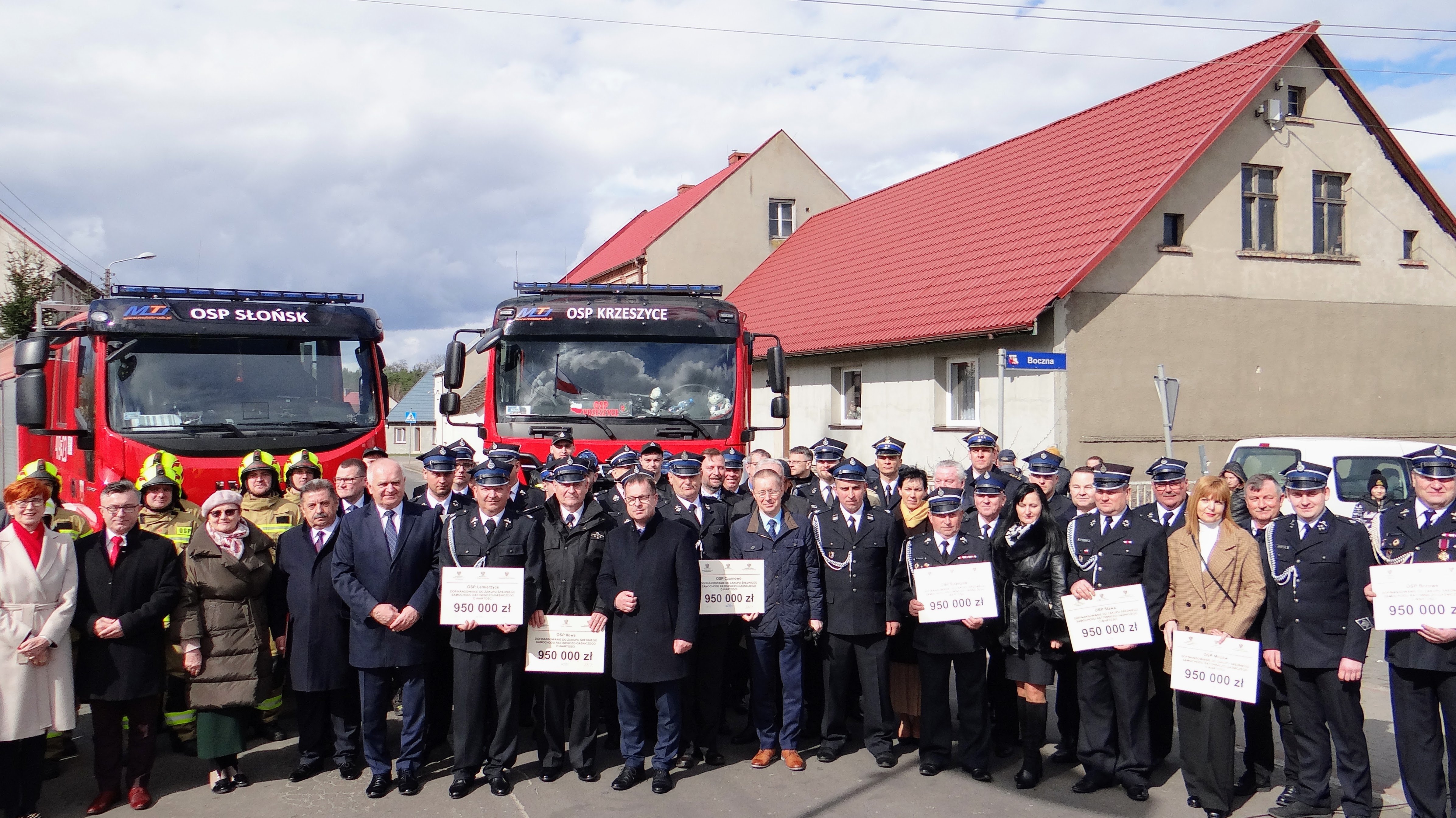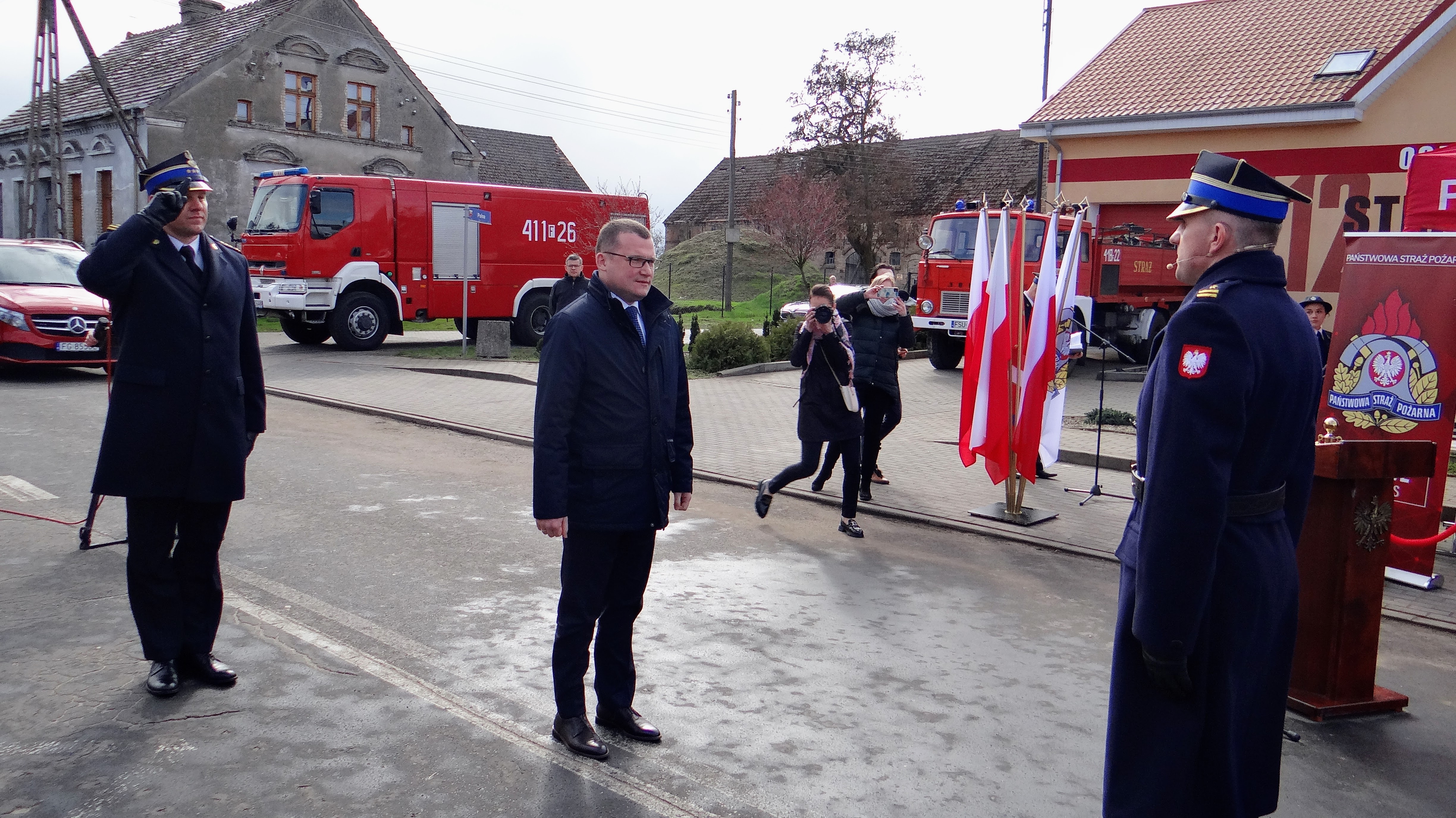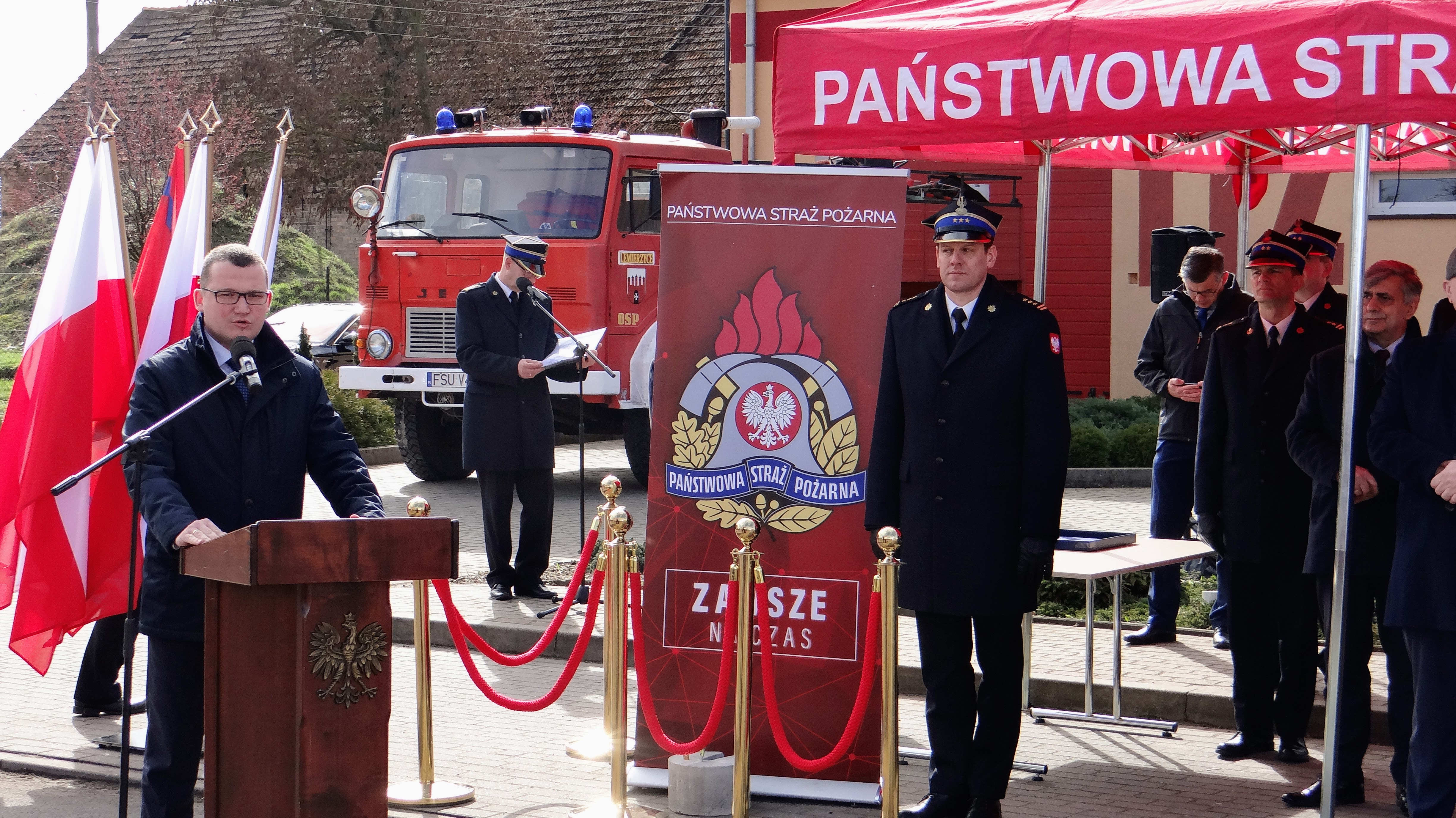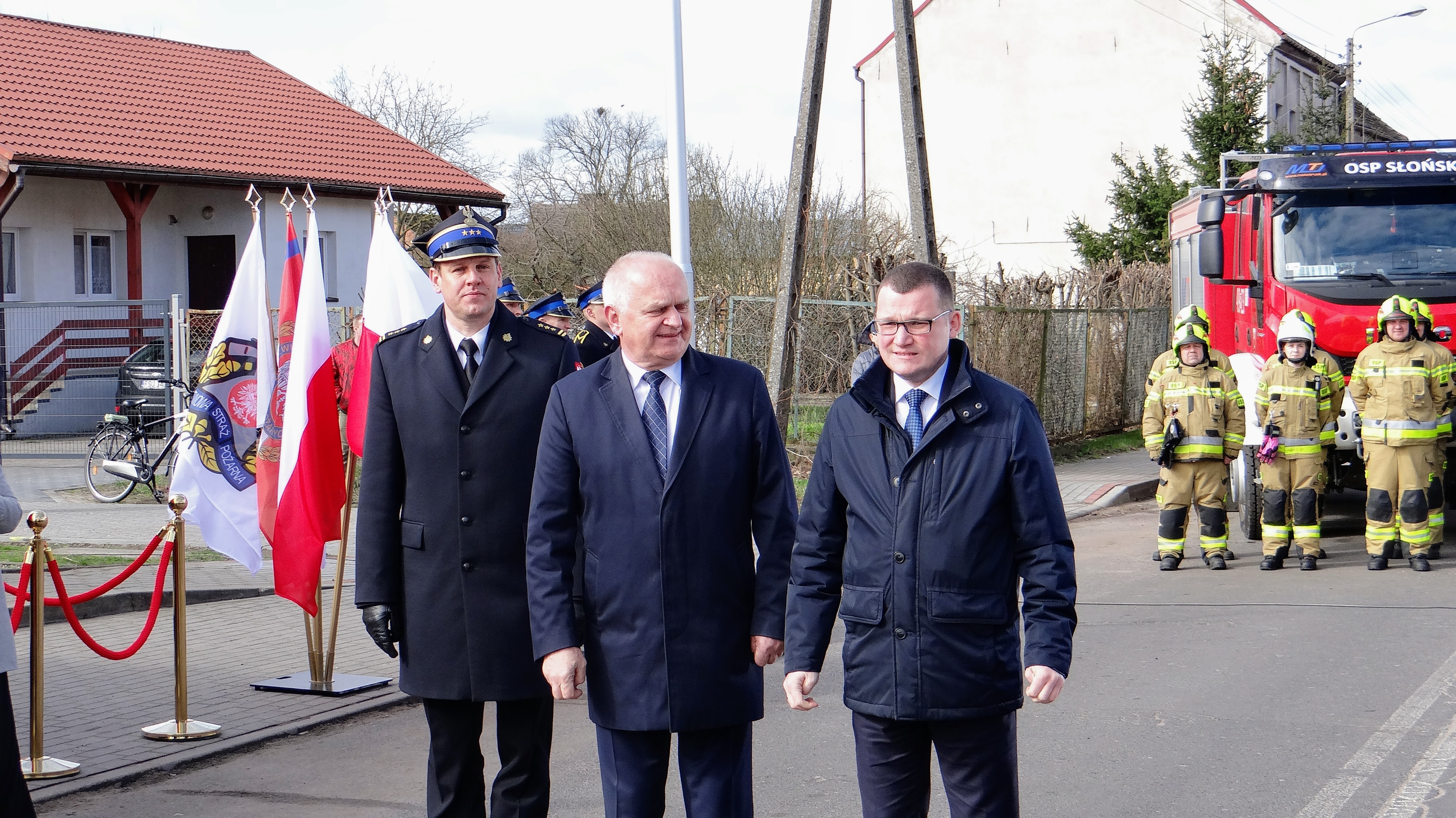 Lubuski Komendant Wojewódzki Państwowej Straży Pożarnej st. bryg. Patryk Maruszak wraz z Wojewodą Lubuskim Władysławem Dajczakiem, powitali przybyłych gości przed remizą OSP Lemierzyce, która jako jedna z 20 lubuskich jednostek OSP otrzymała deklarację wsparcia finansowego.