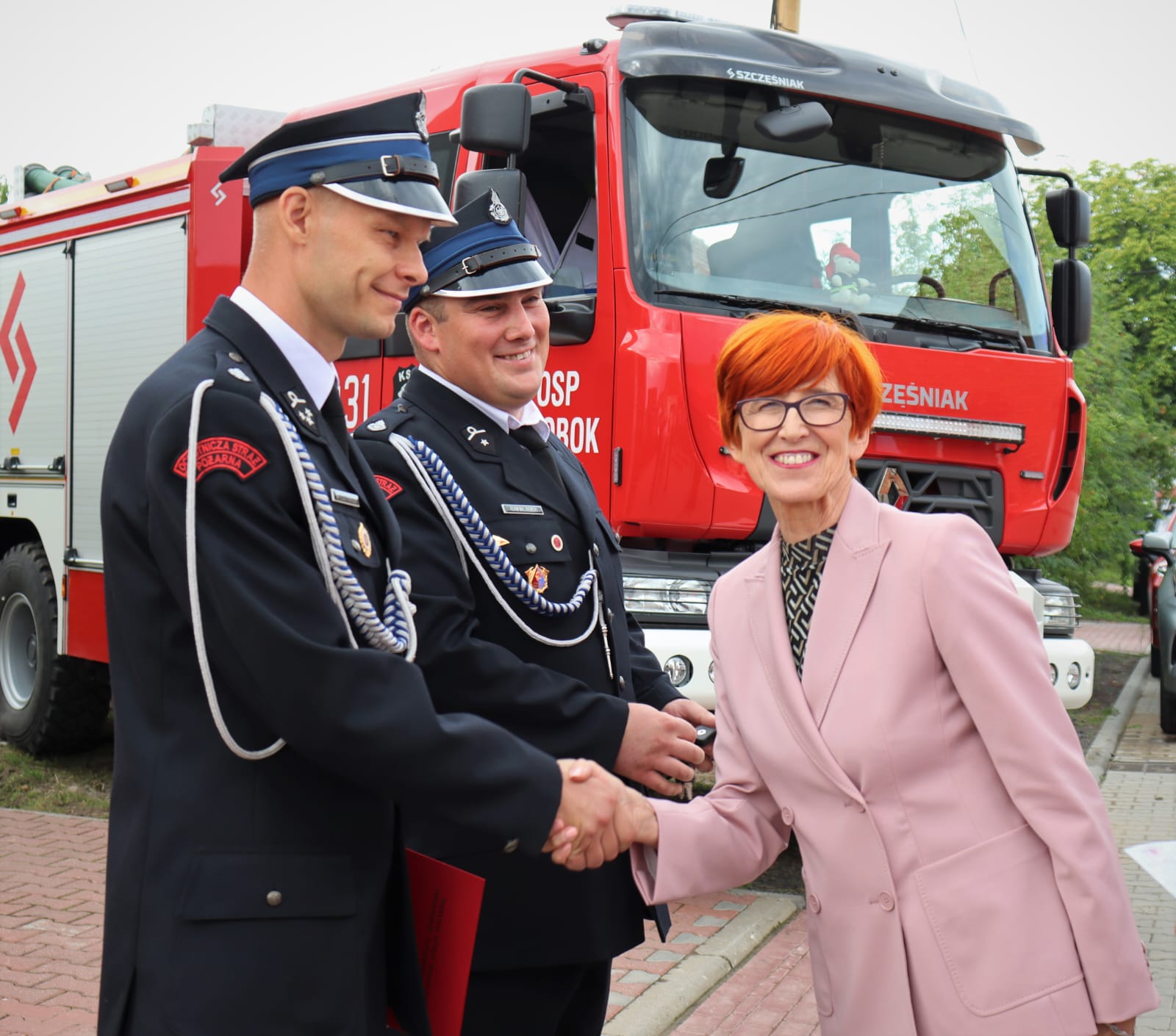 Zastępca Lubuskiego Komendanta Wojewódzkiego PSP bryg. Maciej Iwko wraz z panią Elżbietą Rafalską - Posłem do Parlamentu Europejskiego oraz panem Zbigniewem Wochem - Wójtem Gminy Skąpe wręczyli akt przekazania pojazdu Naczelnikowi OSP Ołobok dh Mateuszowi Kołaczek.