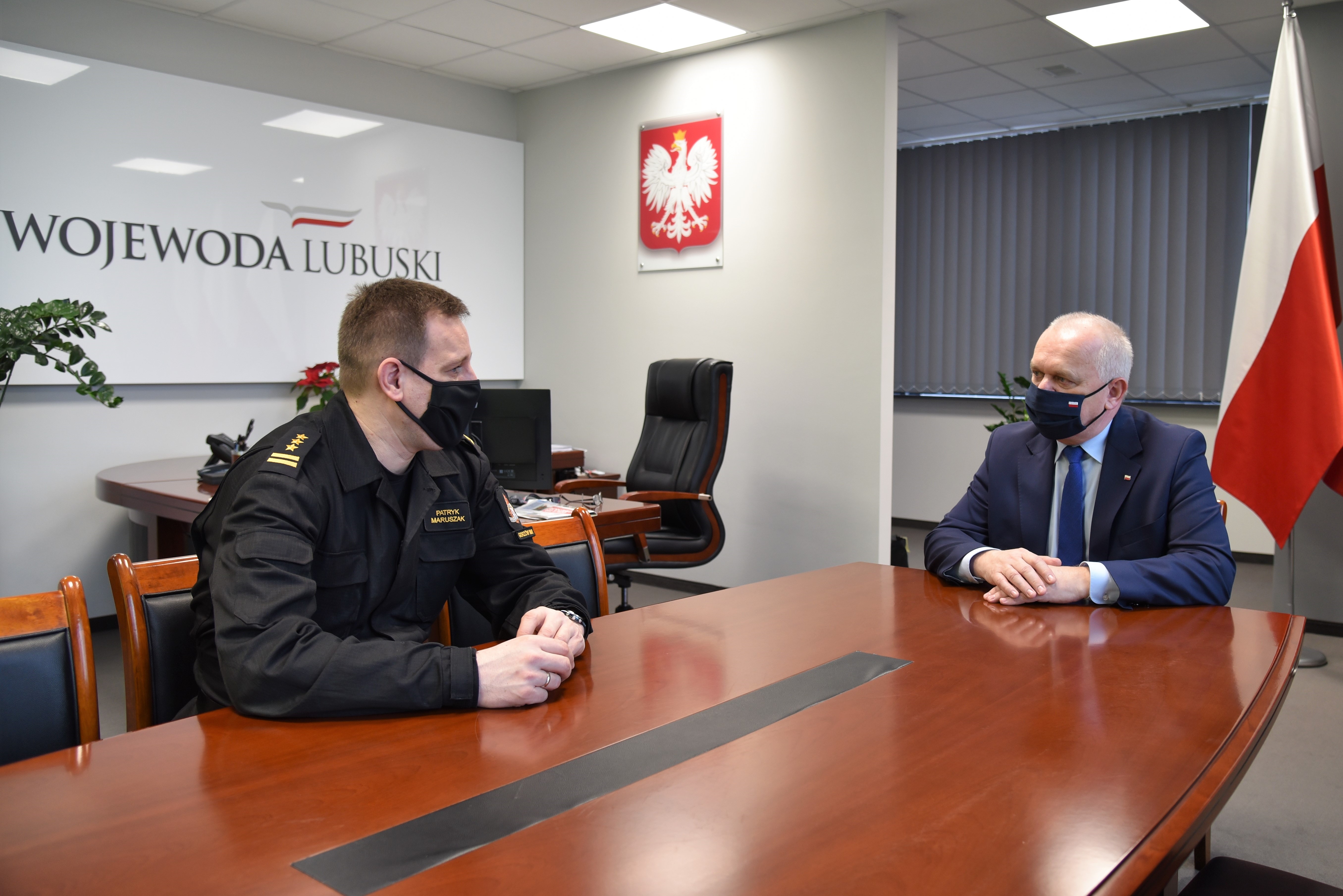 Spotkanie Lubuskiego Komendanta Państwowej Straży Pożarnej st. bryg. Patryka Maruszaka z Wojewodą Władysławem Dajczakiem w sprawie gotowości do walki z powodzią.