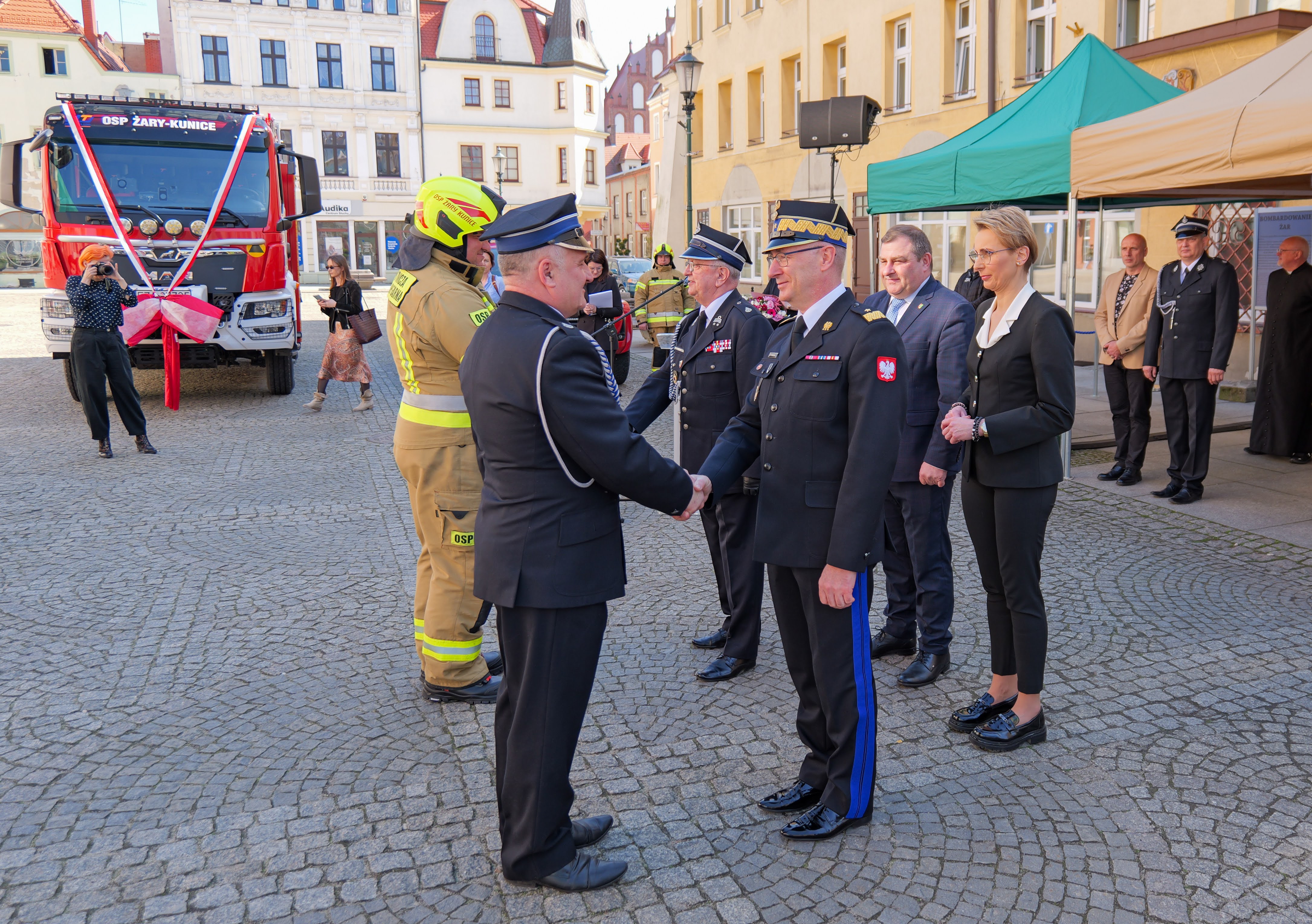 Pierwsza ceremonia odbyła się na rynku w Żarach, gdzie OSP Żary-Kunice odebrała średni samochód ratowniczo-gaśniczy zbudowany na podwoziu MAN z kabiną jednomodułową czterodrzwiową. Pojazd wyposażony jest w zbiornik wody o pojemności 3000 litrów oraz zbiornik na środek pianotwórczy o pojemności 335 litrów. Do podawania wody wykorzystywana jest autopompa dwuzakresowa. Samochód posiada także wyciągarkę elektryczną oraz dodatkowe wyposażenie, m.in. zestaw do gaszenia samochodów elektrycznych oraz gaśnicę do paneli fotowoltaicznych.