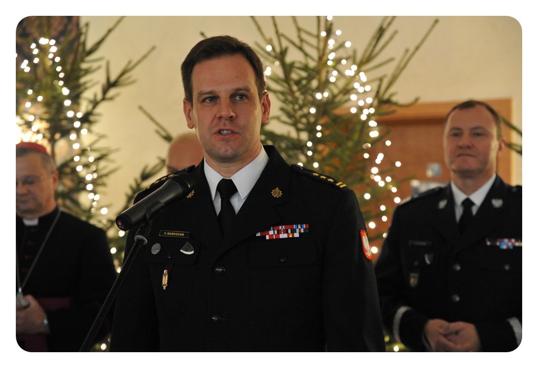 "Z okazji Świąt Bożego Narodzenia składam serdeczne życzenia wszystkim strażakom Państwowej Straży Pożarnej i Ochotniczej Straży Pożarnej, pracownikom cywilnym oraz wszystkim rodzinom i bliskim funkcjonariuszy, druhów i pracowników. Życzę zdrowych, radosnych i spokojnych dni przepełnionych pokojem i życzliwością. Niech ten piękny Świąteczny czas przyniesie odpoczynek od codziennych trosk oraz spokój i będzie czasem spełnienia osobistych oczekiwań. Przede wszystkim życzę też bezpiecznej służby, a za tę dotychczasową służbę serdecznie dziękuję"