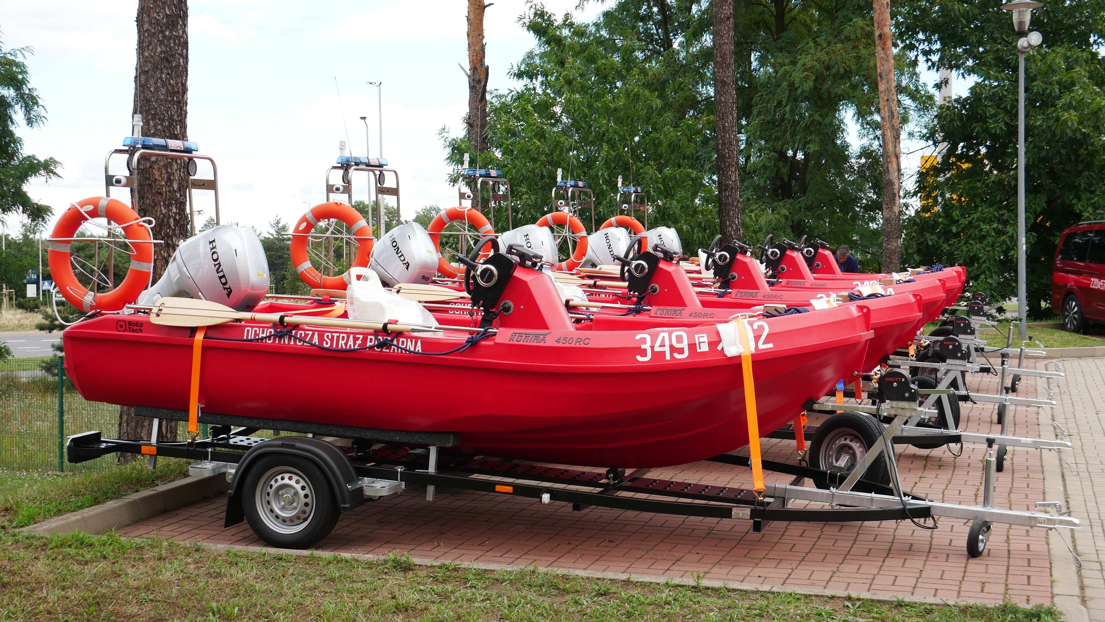 Każda jednostka pływająca to polietylenowa łódź KONTRA 450 RC, silnikiem zaburtowym HONDA BF50D o mocy 50 KM z przyczepą transportową K.T.S. SUSKI 0750RV.