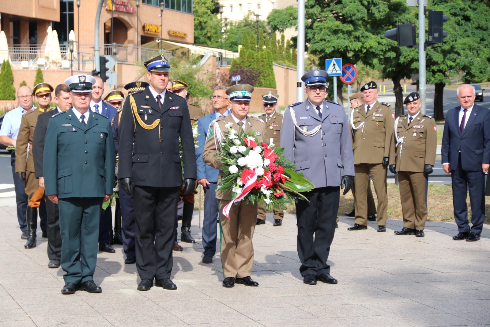 Następnie Lubuski Komendant Wojewódzki Państwowej Straży Pożarnej st. bryg. Patryk Maruszak wraz z innymi przedstawicielami służb mundurowych upamiętnił marszałka Józefa Piłsudskiego składając kwiaty i znicze pod jego pomnikiem.