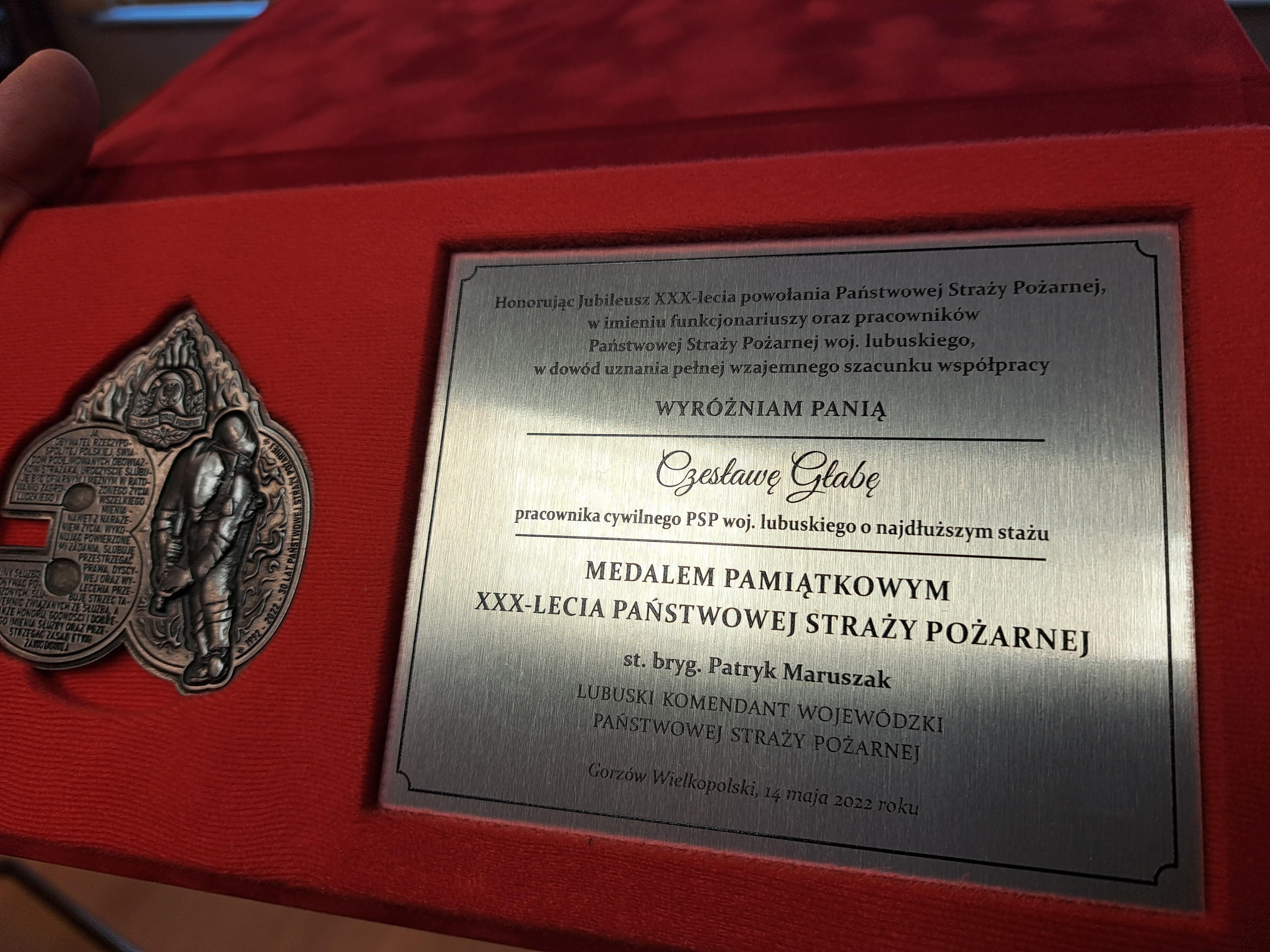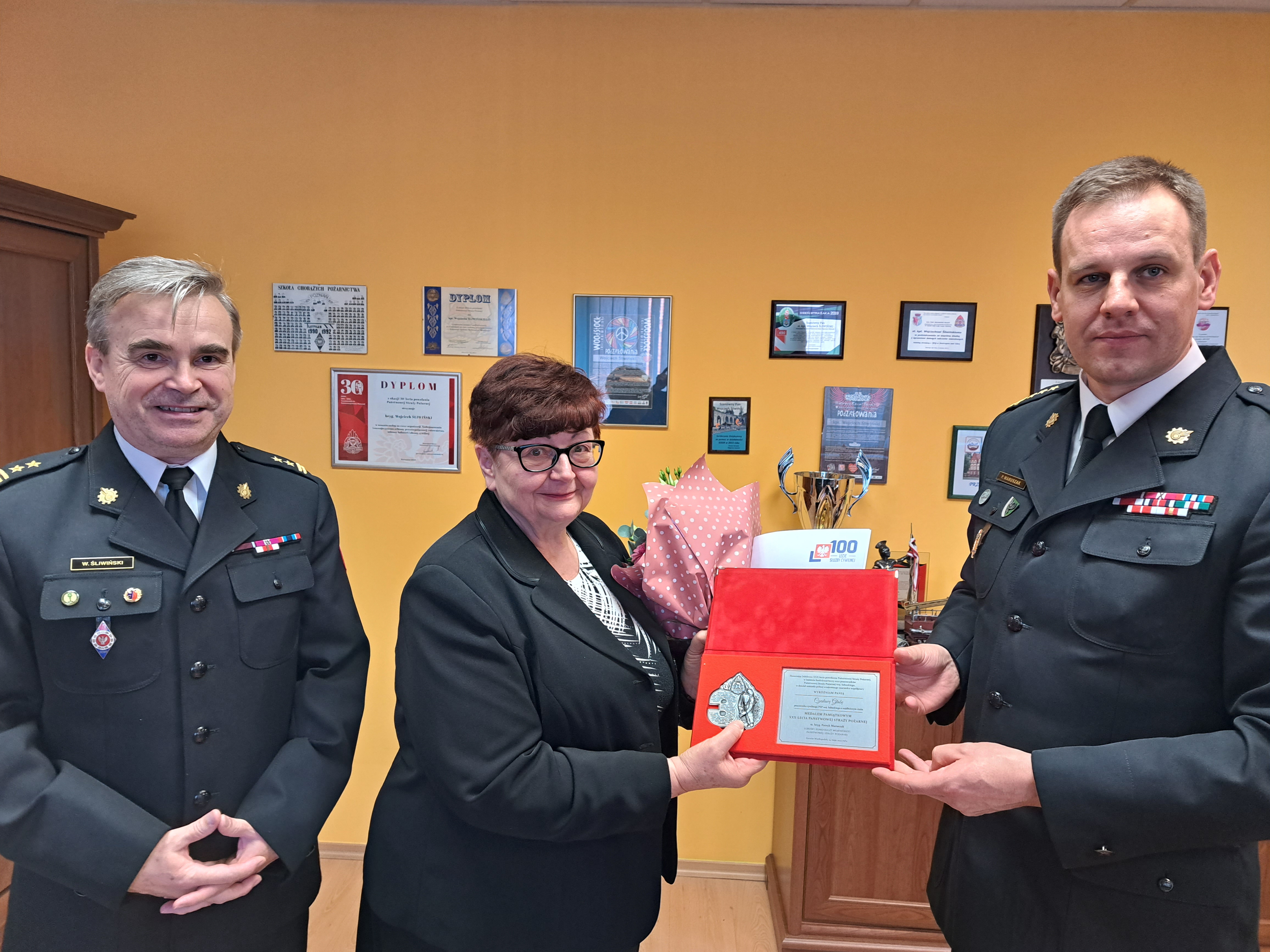 Wyrazem uznania dla tak znakomitego stażu pracy i zasług dla administracji publicznej było wręczenie pamiątkowego medalu z okazji 100. rocznicy uchwalenia ustawy o służbie cywilnej. Ponadto, honorując jubileusz XXX-lecia powołania Państwowej Straży Pożarnej, w imieniu funkcjonariuszy oraz pracowników Państwowej Straży Pożarnej woj. lubuskiego, w dowód uznania pełnej wzajemnego szacunku współpracy, lubuski komendant wojewódzki Państwowej Straży Pożarnej st. bryg. Patryk Maruszak wręczył również pamiątkowy medal, który otrzymały tylko osoby i instytucje wyjątkowo zasłużone dla Państwowej Straży Pożarnej województwa lubuskiego.