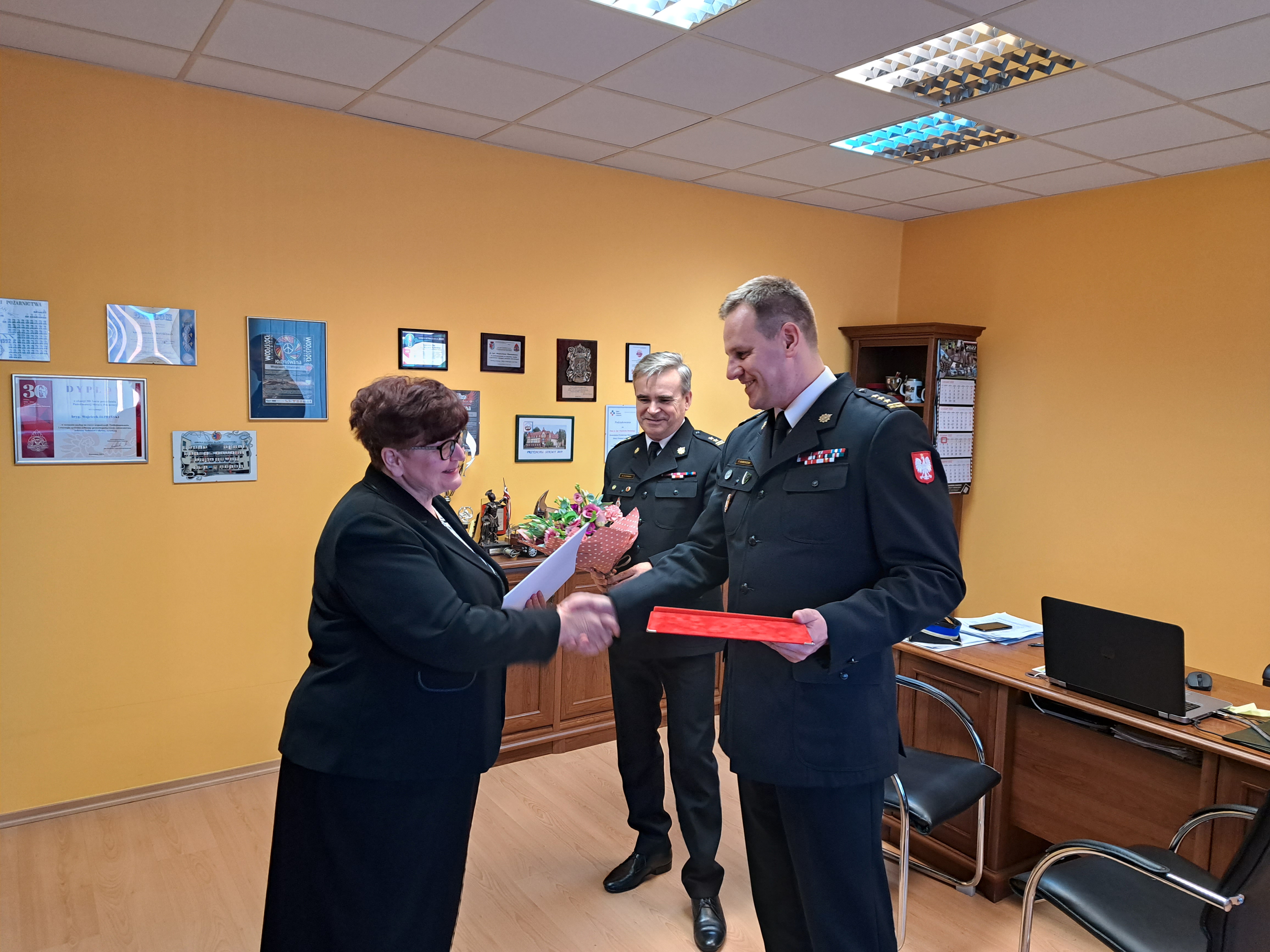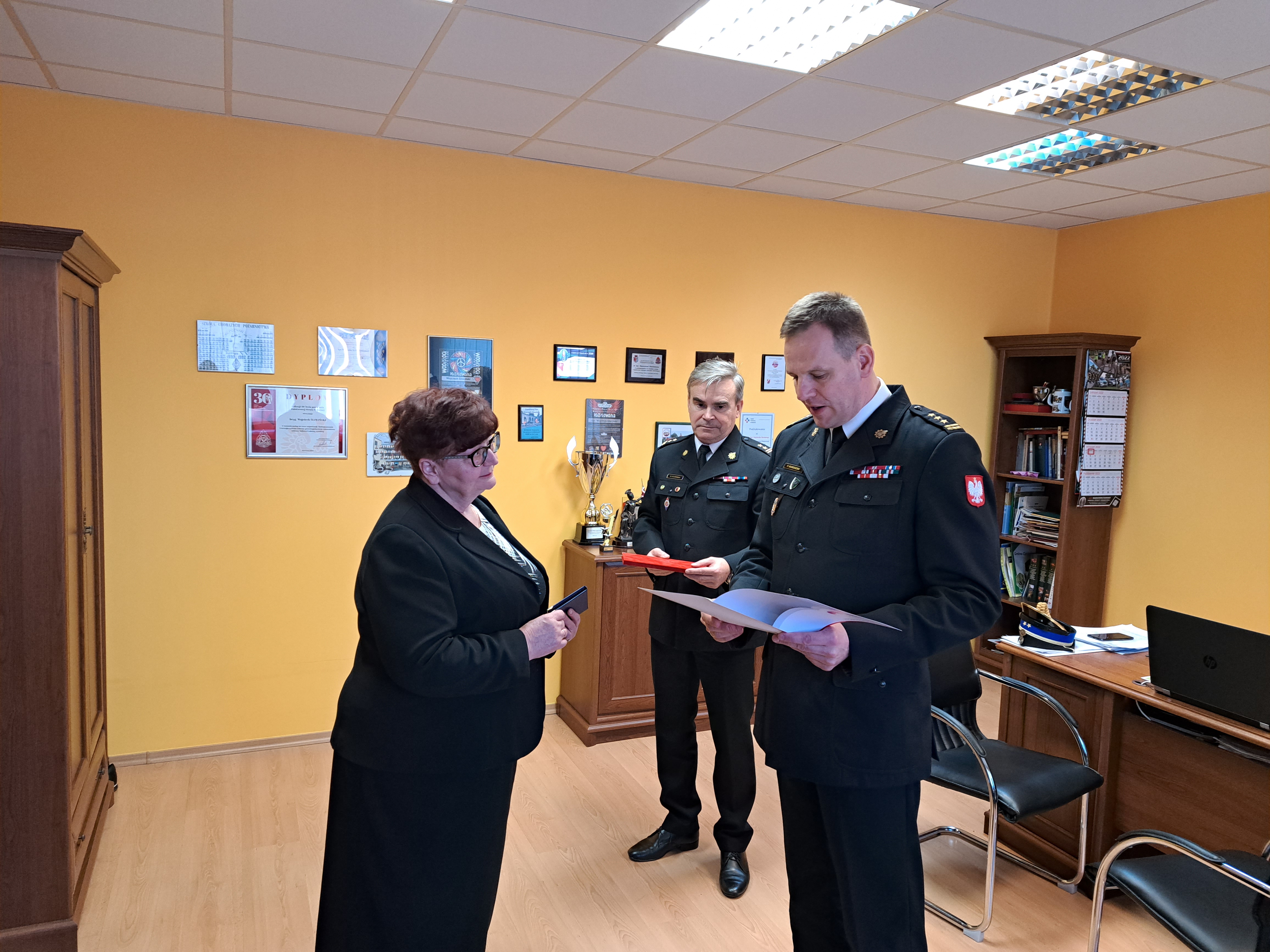 Dnia 15 listopada br. lubuski komendant wojewódzki Państwowej Straży Pożarnej st. bryg. Patryk Maruszak, wspólnie z komendantem powiatowym Państwowej Straży Pożarnej w Słubicach bryg. Wojciechem Śliwińskim dokonał wręczenia wyróżnień Pani Czesławie Głabie - wyjątkowo zasłużonemu pracownikowi KP PSP w Słubicach.