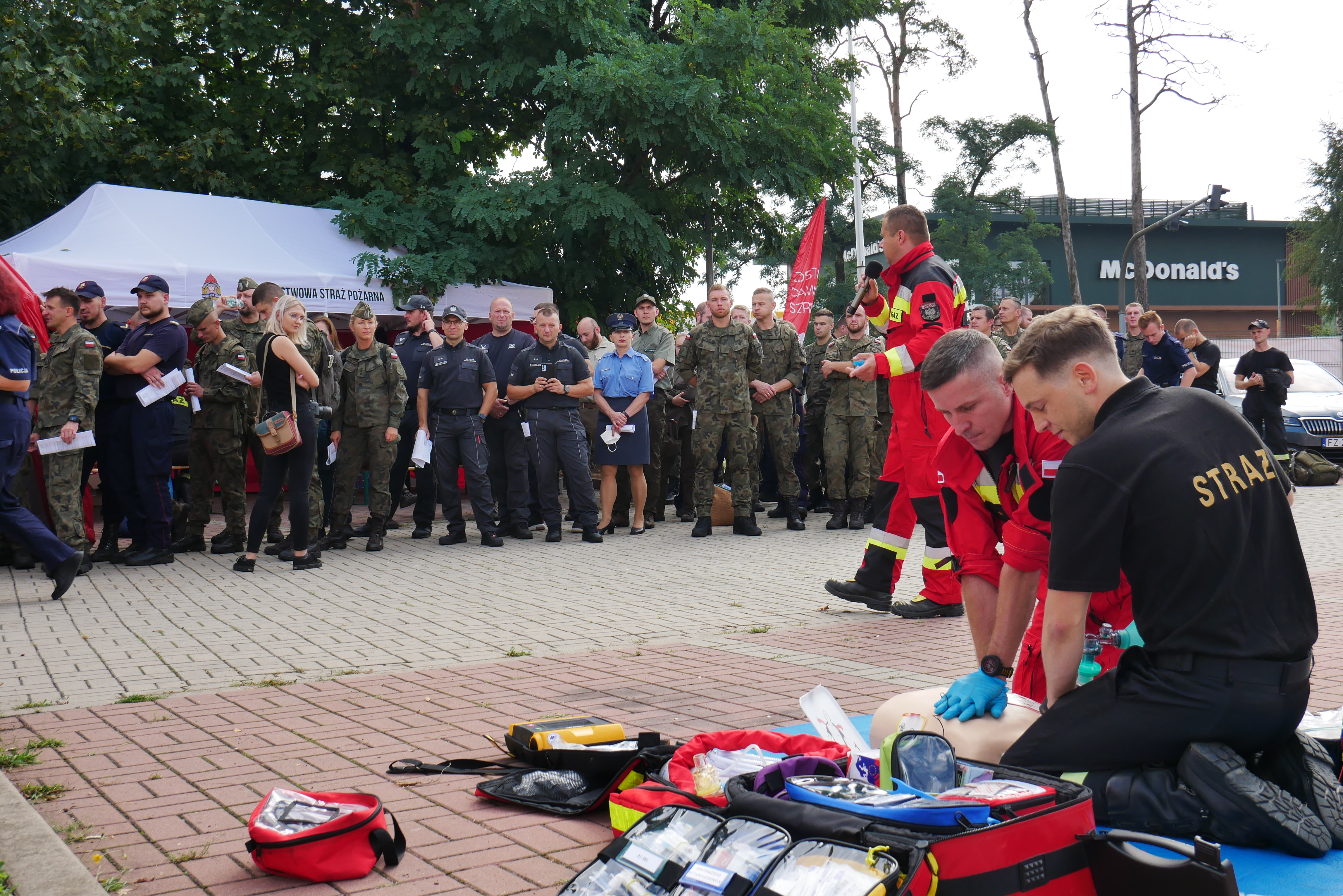 Stanowisko Ratownictwa Medycznego wraz z ambulansem PSP w pełnej obsadzie ratowników medycznych.