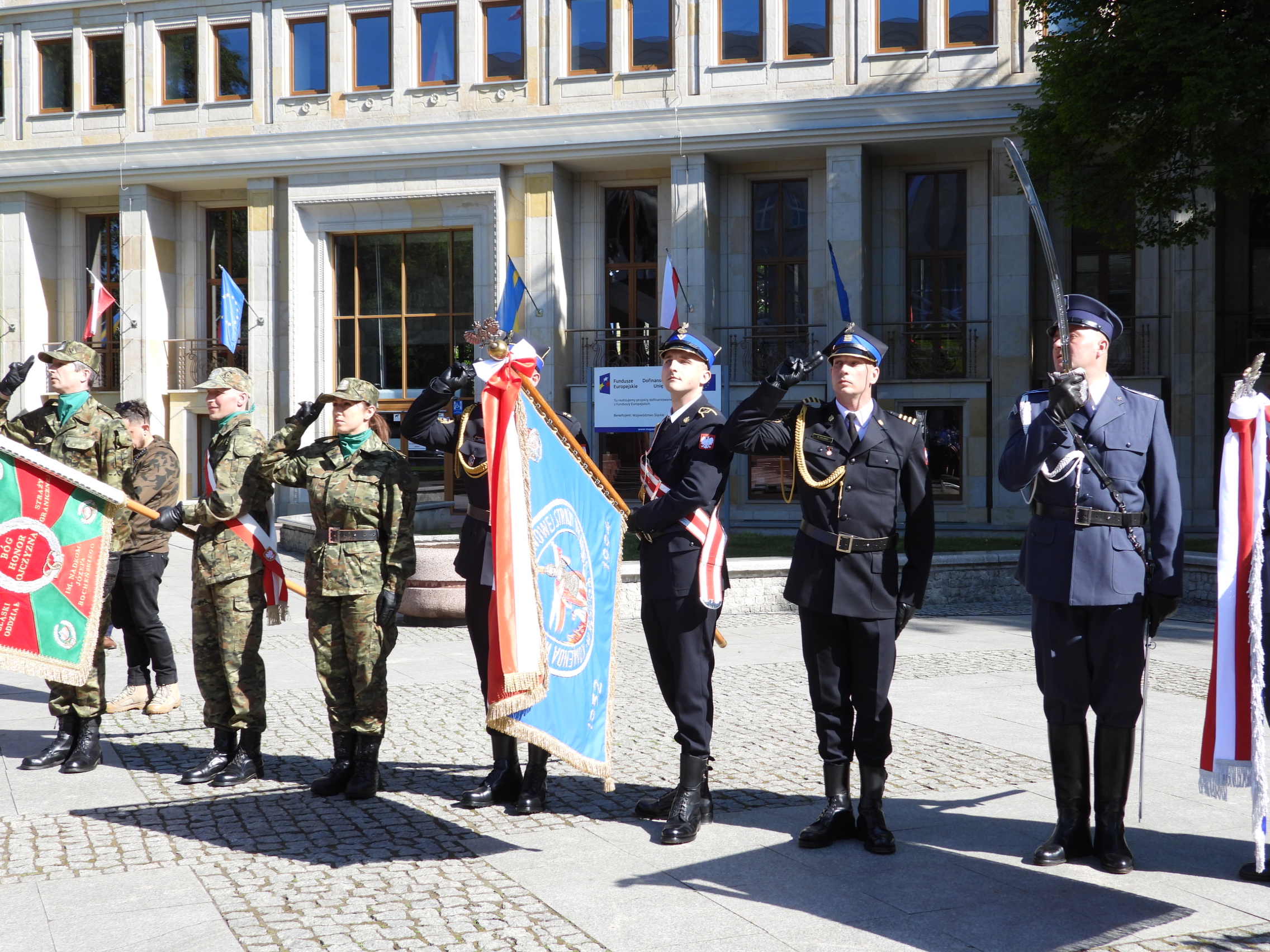 Następnie mł. bryg. Zbigniew Dyk - pełniący obowiązki Zastępcy Śląskiego Komendanta Wojewódzkiego PSP, na zaproszenie Pana Wojciecha Saługi -Marszałka Województwa Śląskiego, uczestniczył Śląskim Capstrzyku zorganizowanym w ramach Dnia Flagi Rzeczypospolitej Polskiej i 104. rocznicy wybuchu III Powstania Śląskiego.