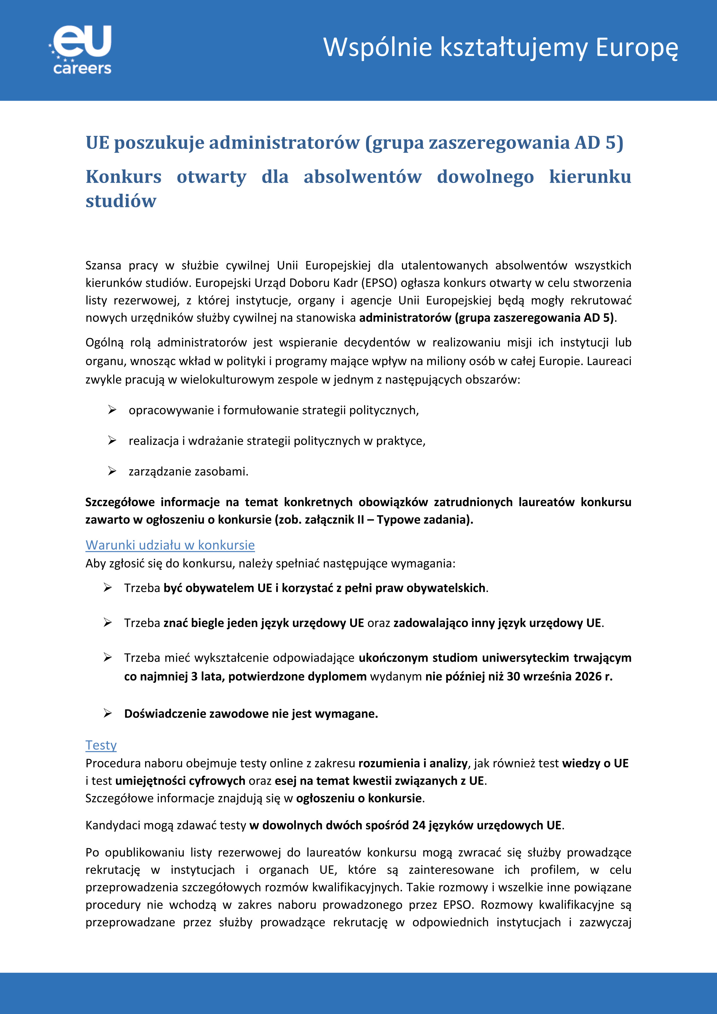 Na prośbę Departamentu Komitetu do Spraw Europejskich w Ministerstwie Spraw Zagranicznych, odpowiedzialnego za działania informacyjne i promocyjne dotyczące możliwości kariery w instytucjach Unii Europejskiej, przekazujemy informacje o aktualnie prowadzonym konkursie otwartym EPSO/AD/427/26 – Administratorzy (AD 5), organizowanym przez Europejski Urząd Doboru Kadr (EPSO) na podstawowe stanowiska urzędnicze (poziom zaszeregowania AD5), stanowiącym jedną z podstawowych ścieżek rozpoczęcia pracy w instytucjach, organach i agencjach UE.