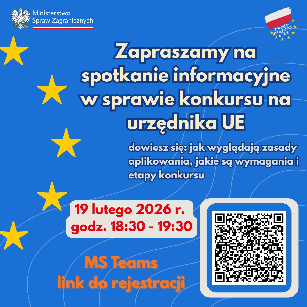 Serdecznie zapraszamy wszystkich zainteresowanych udziałem w konkursie na spotkanie informacyjne w formule online w dniu 19 lutego o godz. 18:30 – link do rejestracji: Spotkanie informacyjne MSZ w sprawie konkursu na Urzędnika UE – Wypełnij formularz.