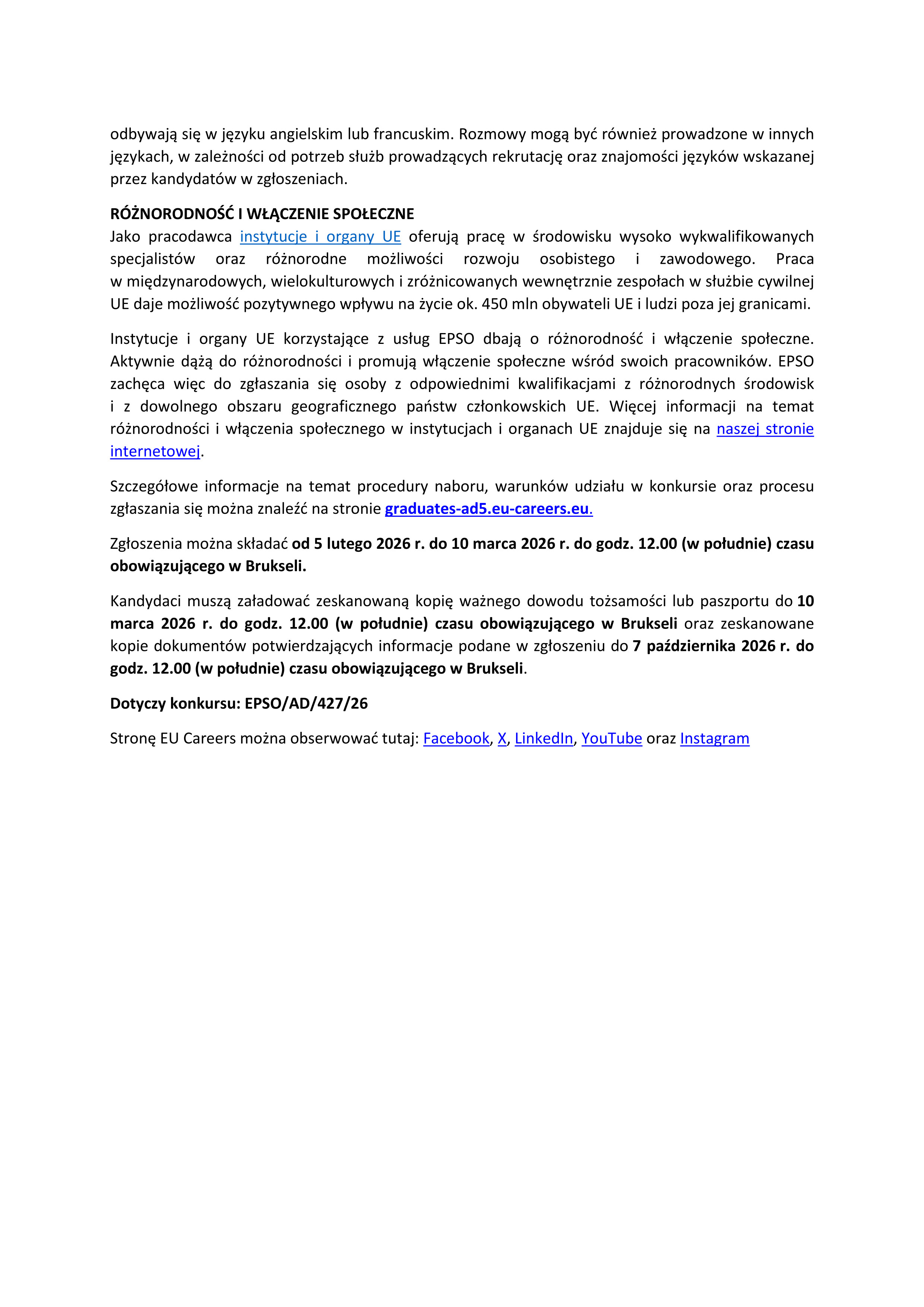 Zachęcamy także do odwiedzenia profilu Twoja kariera w UE na LinkedIn - jest to oficjalny profil MSZ poświęcony zatrudnieniu i ścieżkom kariery w instytucjach Unii Europejskiej, gdzie regularnie publikowane są aktualności i materiały związane z konkursami EPSO oraz innymi możliwościami rozwoju zawodowego w UE: https://www.linkedin.com/showcase/eu-careers-gov-pl/.