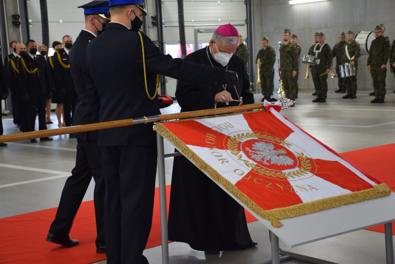Następnie zwrócił się do strażaków - „Pamiętajcie, aby hasło, które nosimy na sztandarze „Bóg, Honor Ojczyzna” zawsze było w Waszych sercach (...), pamiętajcie o tym, że służycie Polsce i jej obywatelom …”.