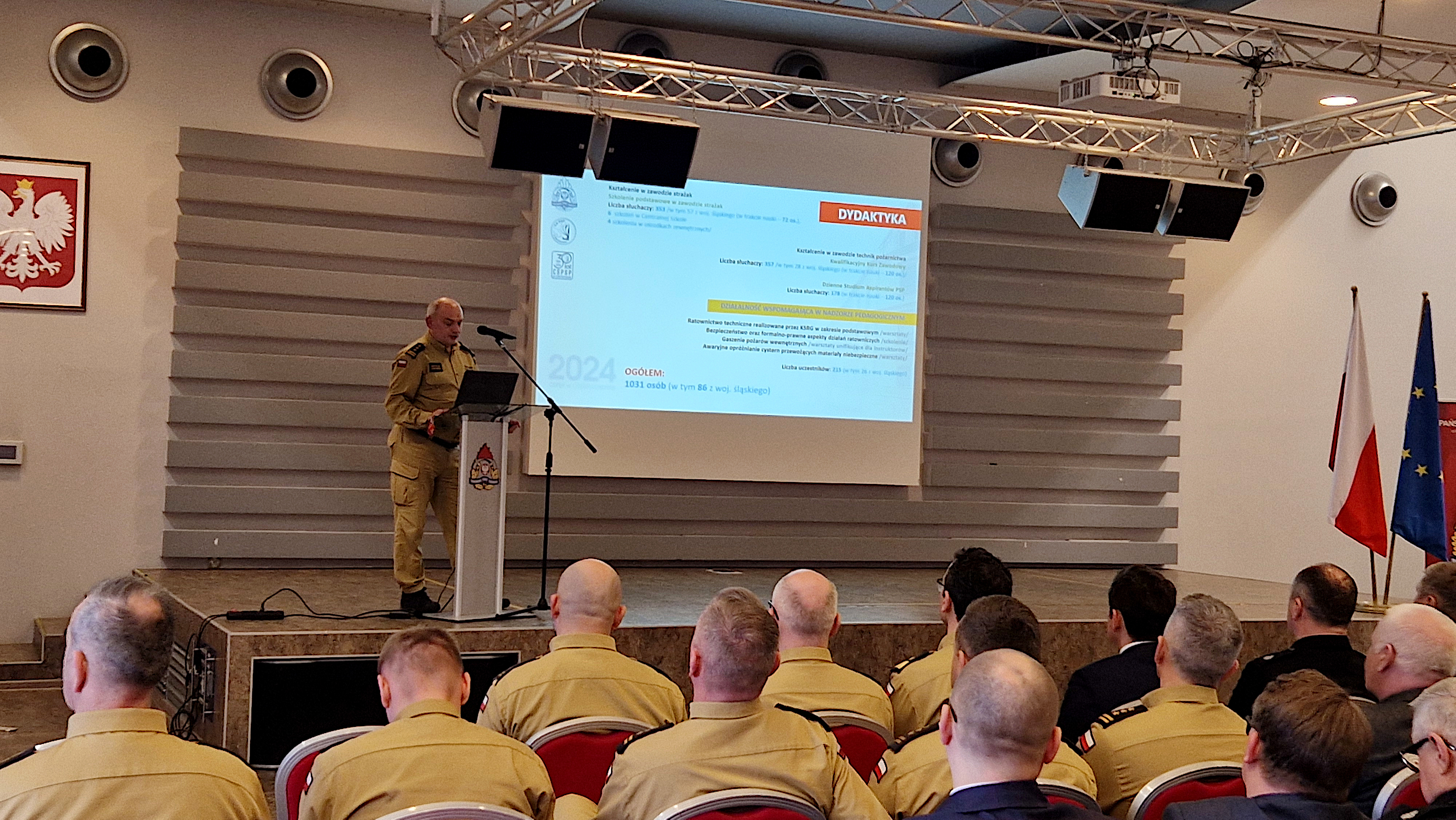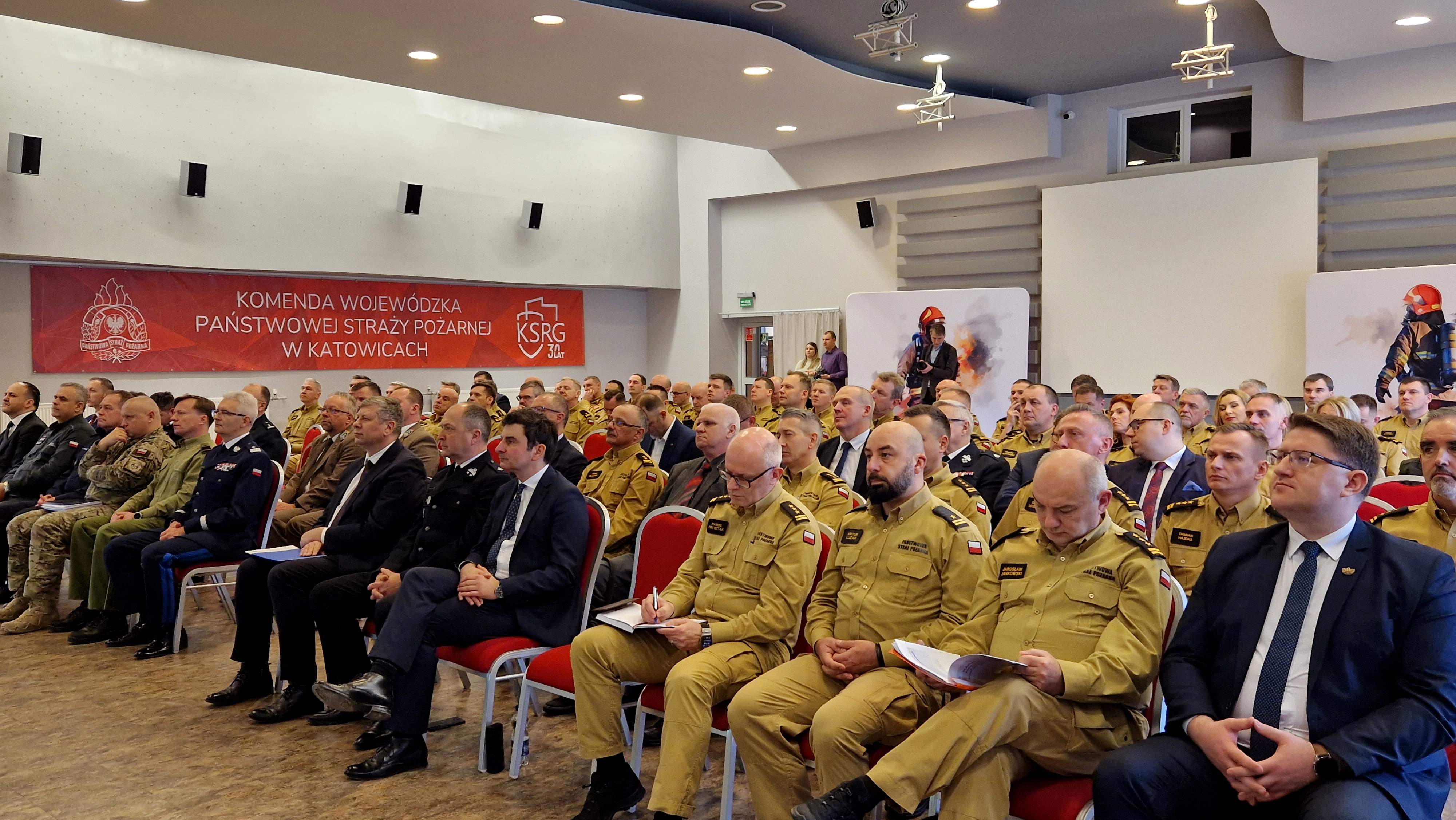 Jako pierwszy głos zabrał Śląski Komendant Wojewódzki PSP - nadbryg. Wojciech Kruczek, który po krótkim wstępie i przywitaniu gości, przedstawił sprawozdanie z funkcjonowania Krajowego Systemu Ratowniczo - Gaśniczego na terenie województwa, podsumował działalność komend powiatowych i miejskich PSP oraz przedstawił zamierzenia na 2025 rok. W swoim wystąpieniu po krótce omówił najtrudniejsze wyzwania, z którymi musieli się mierzyć śląscy strażacy w ubiegłym roku, między innymi pożary nielegalnych wysypisk odpadów oraz działania powodziowe na południu województwa. Zaprezentował również realizację zakupów i inwestycji poczynionych przez jednostki organizacyjne PSP woj. śląskiego. W końcowej części wystąpienia położył nacisk na wdrażanie nowo uchwalonej ustawy o ochronie ludności i obronie cywilnej i wyzwaniach, które stawia ona przed formacją.