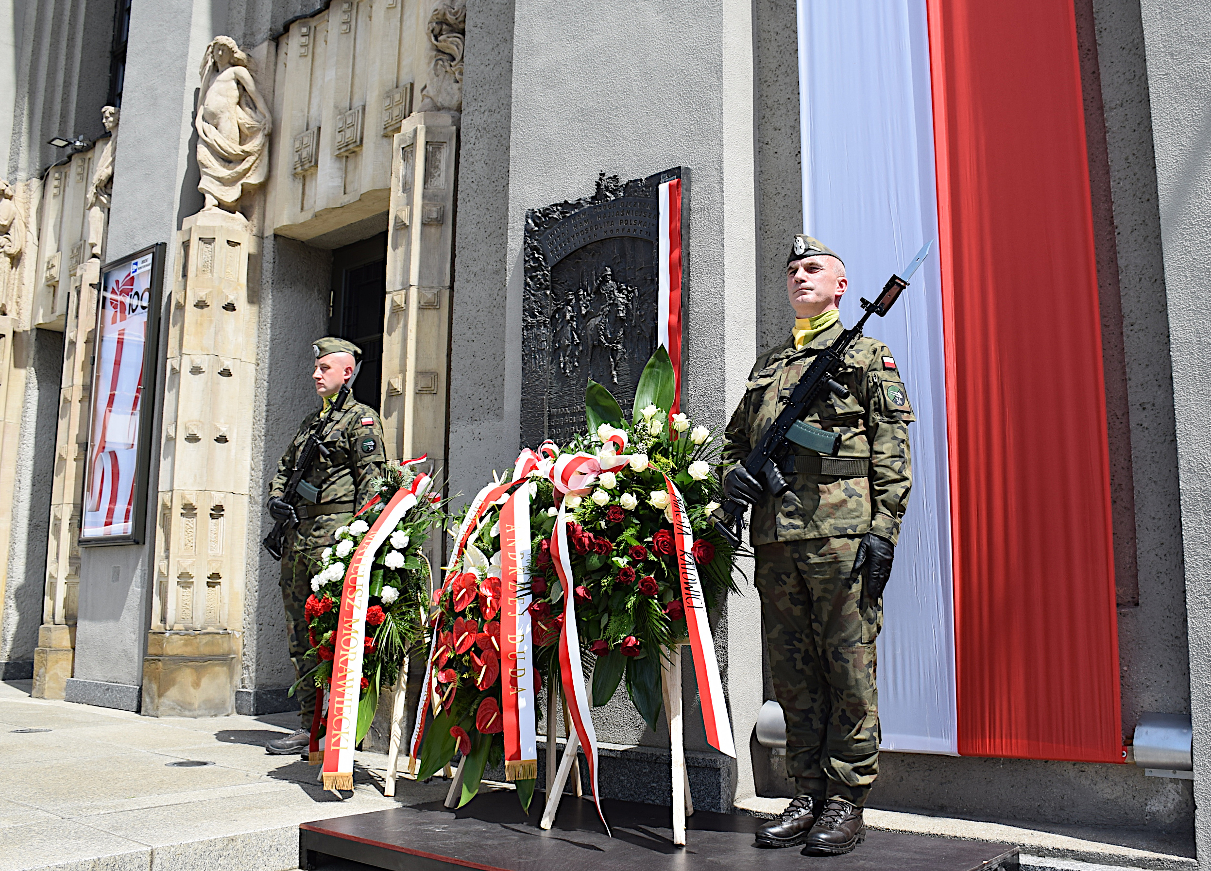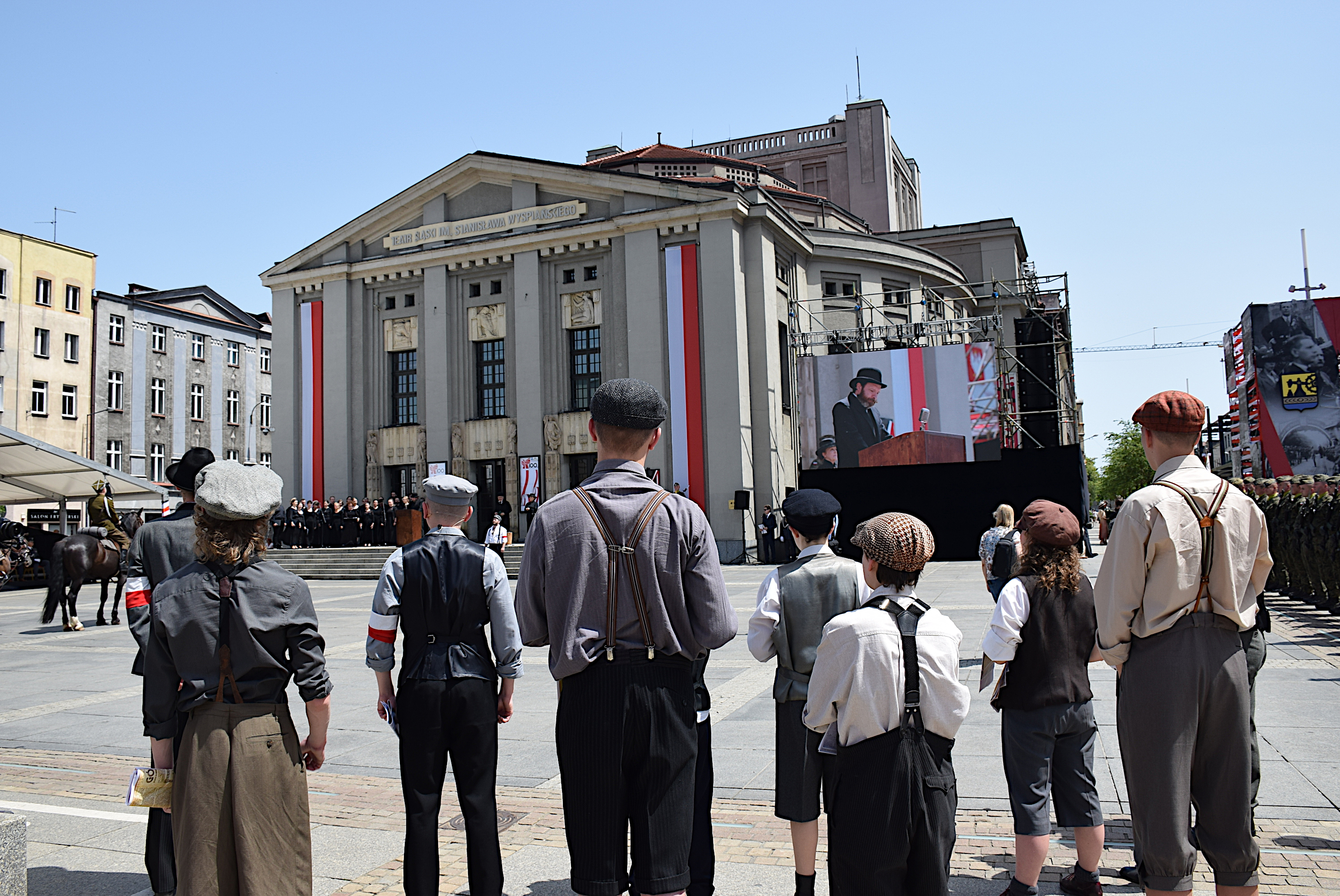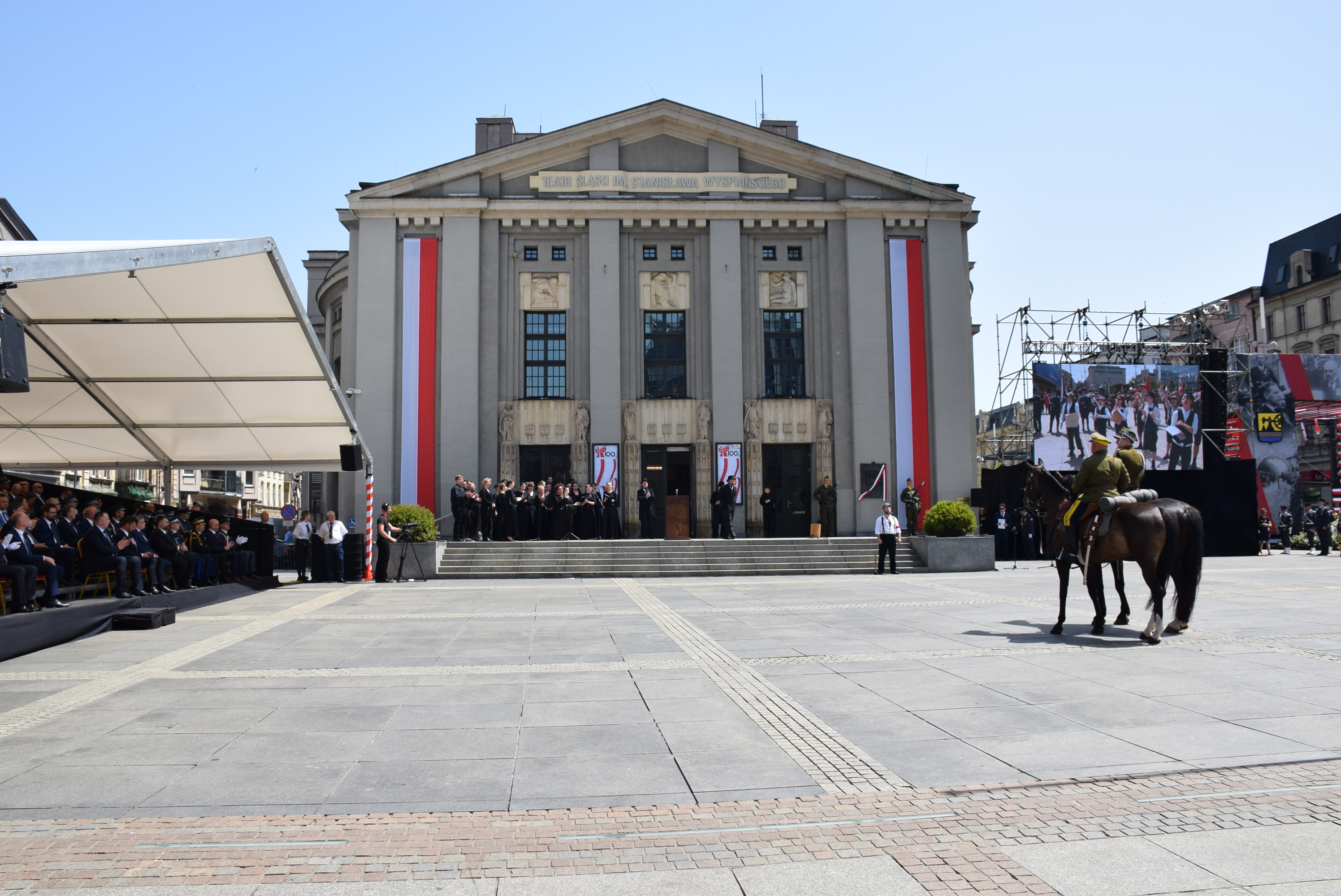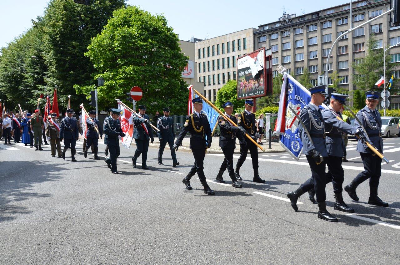 Po mszy, zaproszeni goście i mieszkańcy Katowic przeszli na rynek, gdzie aktorzy Teatru Śląskiego zaprezentowali widowisko historyczne, a następnie przedstawiono rekonstrukcję wkroczenia Wojska Polskiego do Katowic. W dalszej części uroczystości odczytano okolicznościowe listy: Prezydenta RP Pana Andrzeja Dudy oraz Prezesa Rady Ministrów Pana Mateusza Morawickiego. Uroczyste przemówienie wygłosił gospodarz dzisiejszej uroczystości Prezydent Miasta Katowice Pan Marcin Krupa. Następnie odsłonięto pamiątkową tablicę, pod którą złożono wieńce. Na zakończenie tej części uroczystych obchodów odbyła się defilada z udziałem pocztu sztandarowego Komendy Wojewódzkiej PSP w Katowicach.