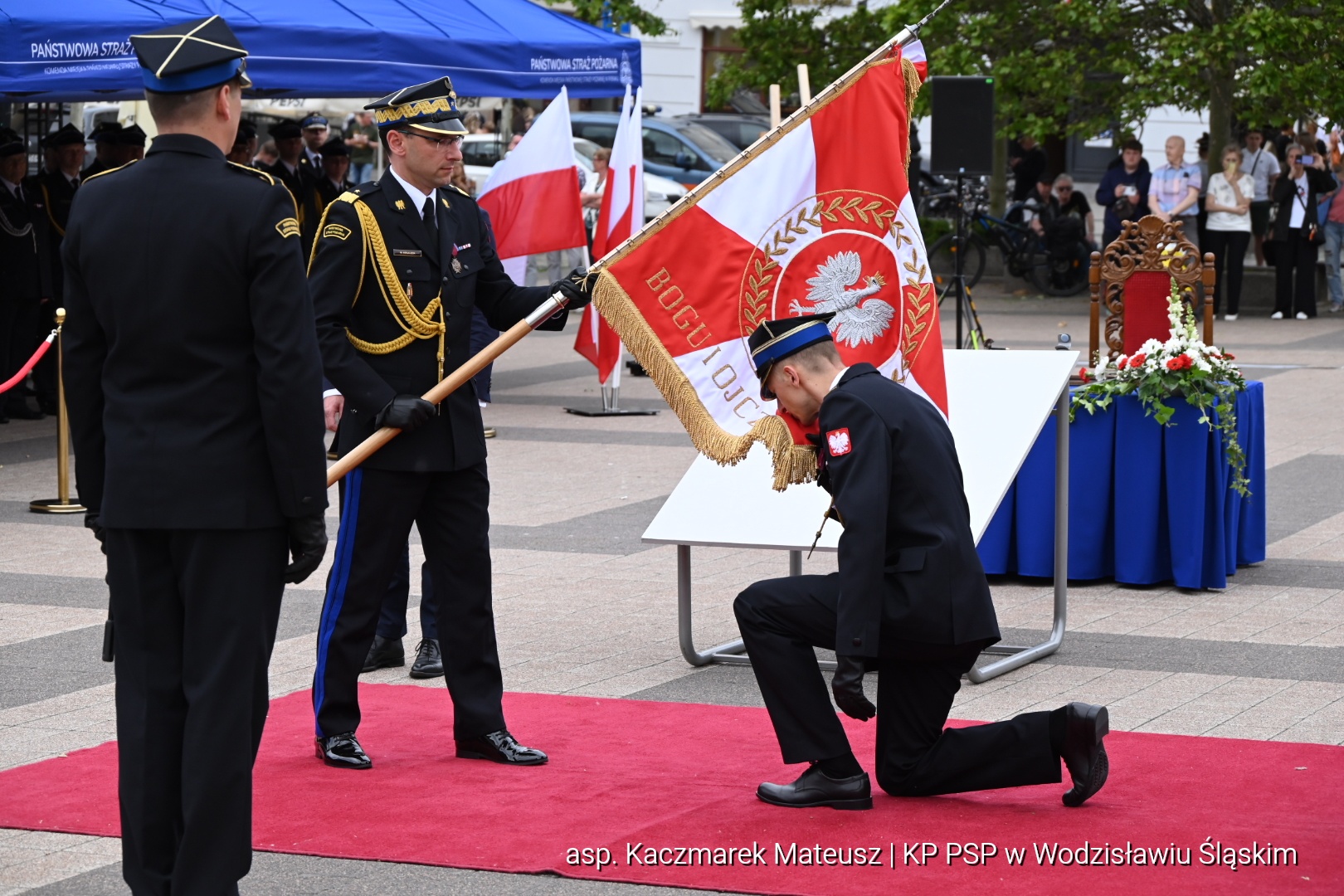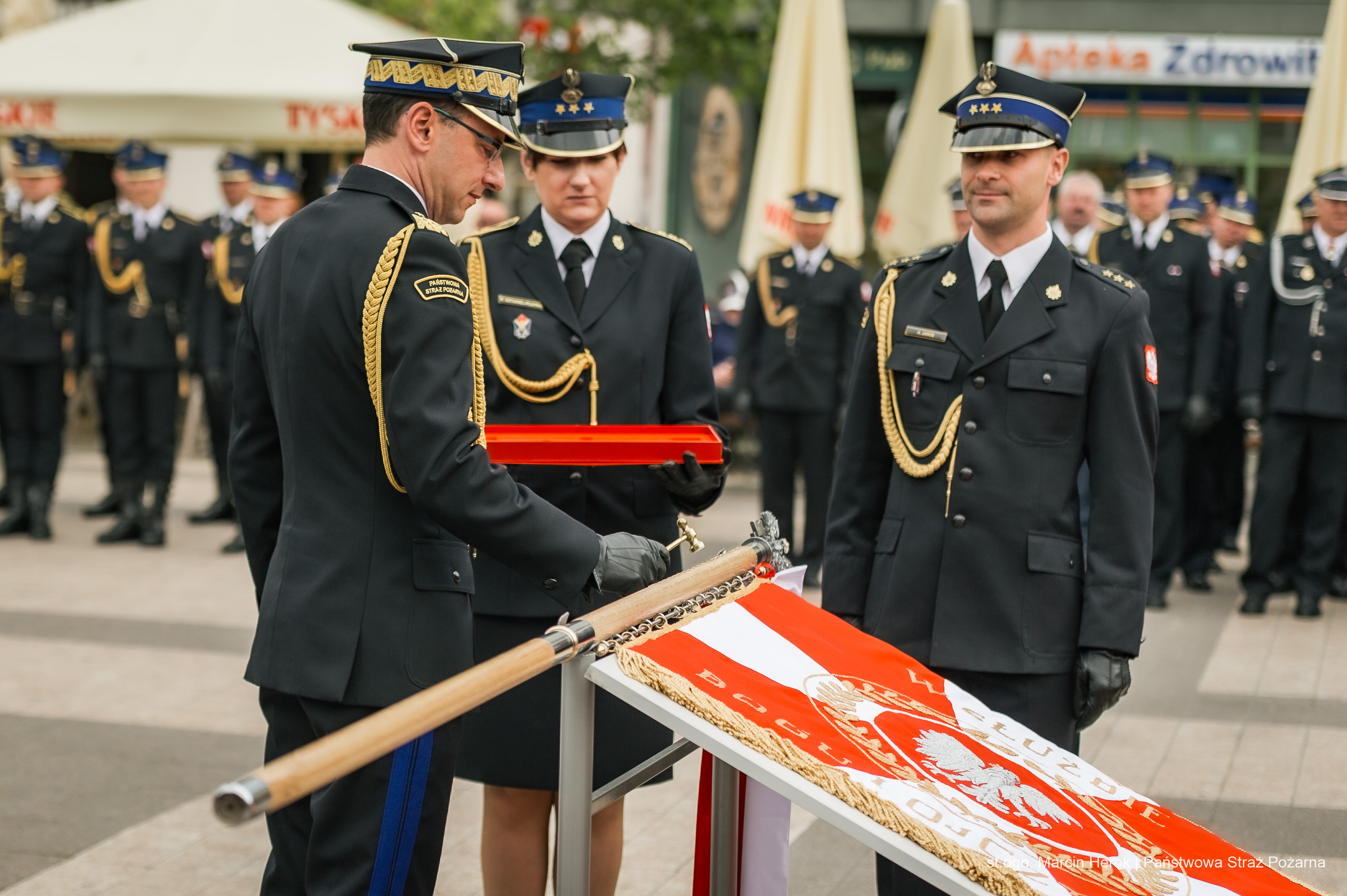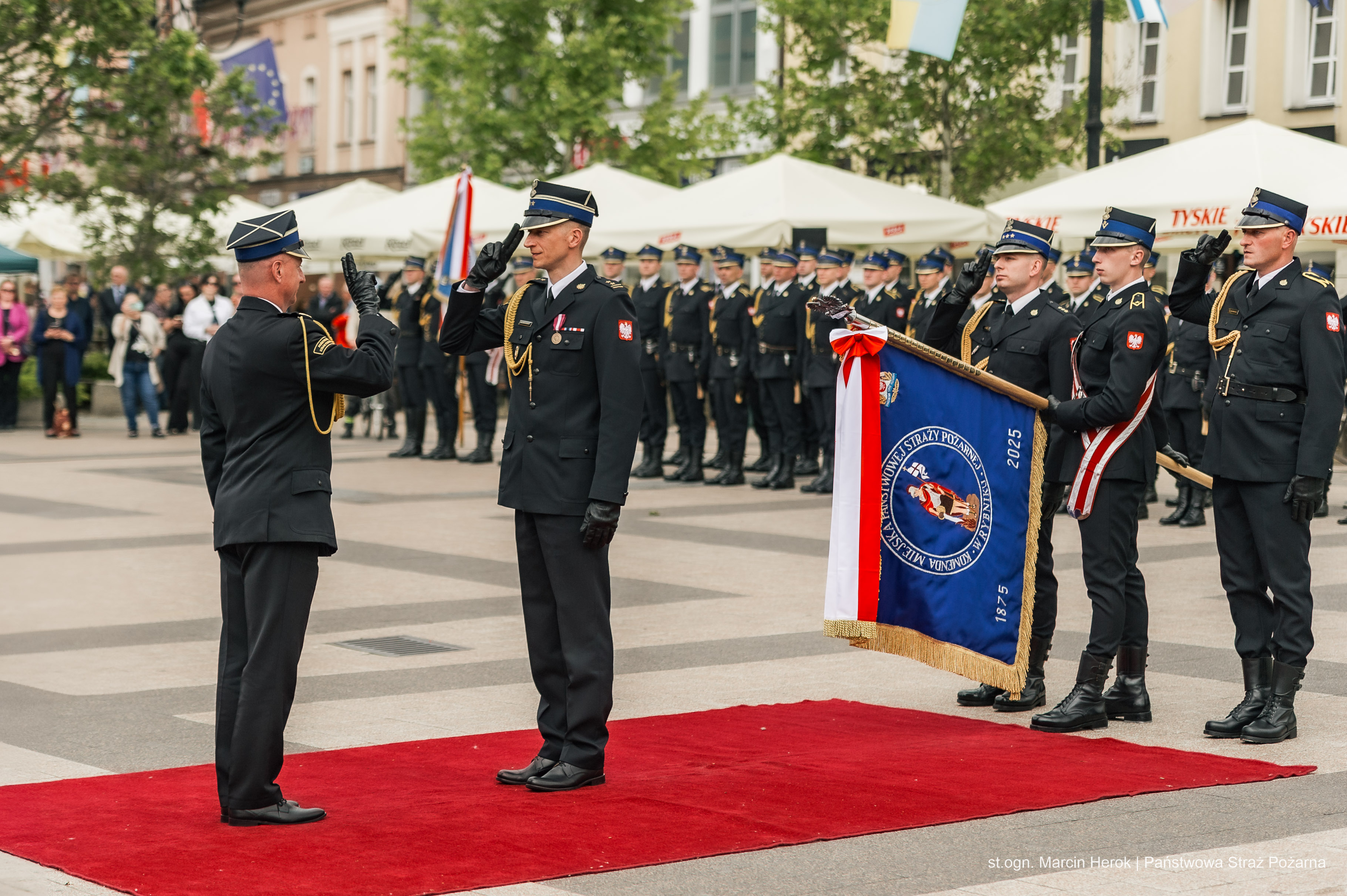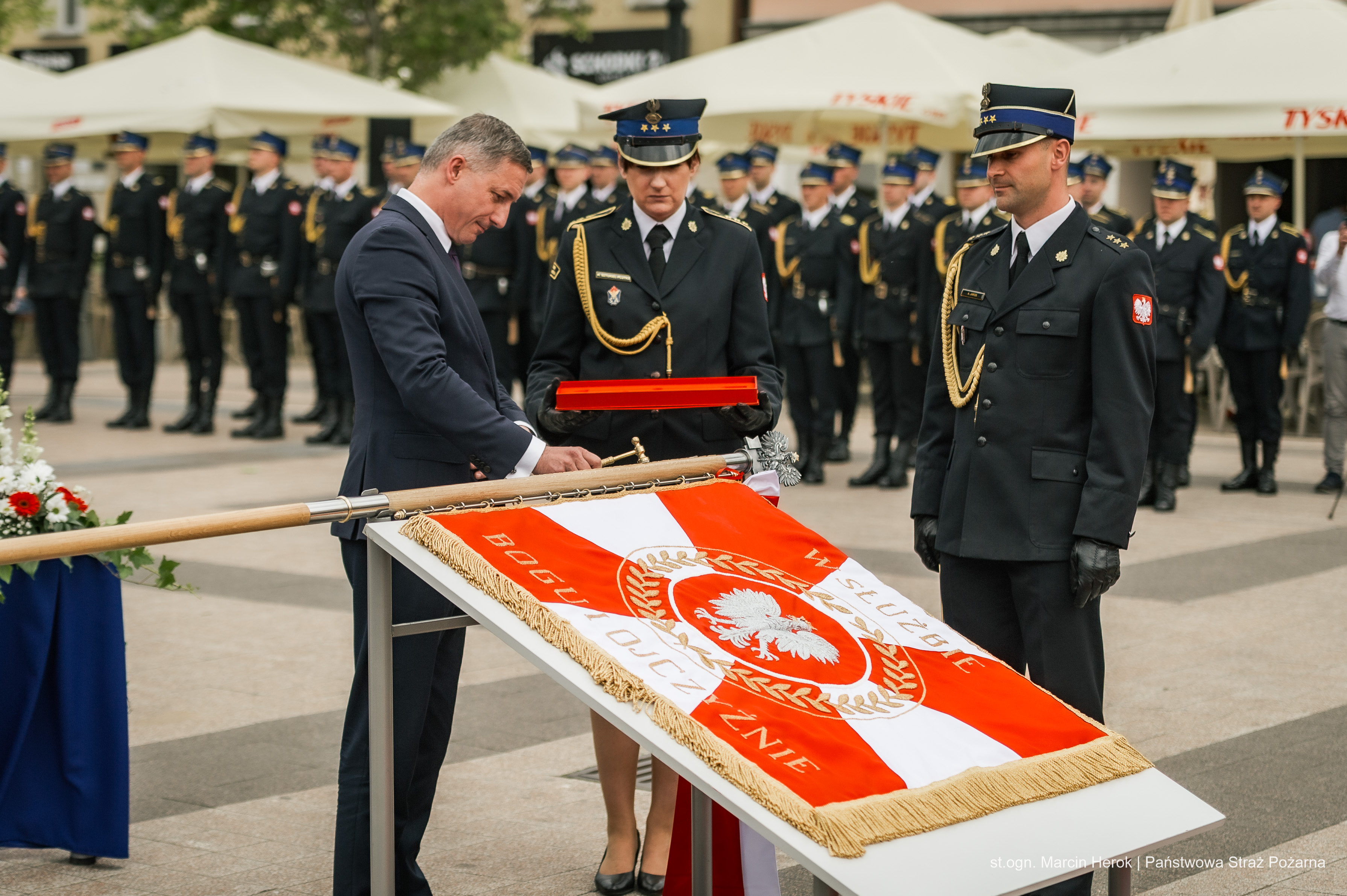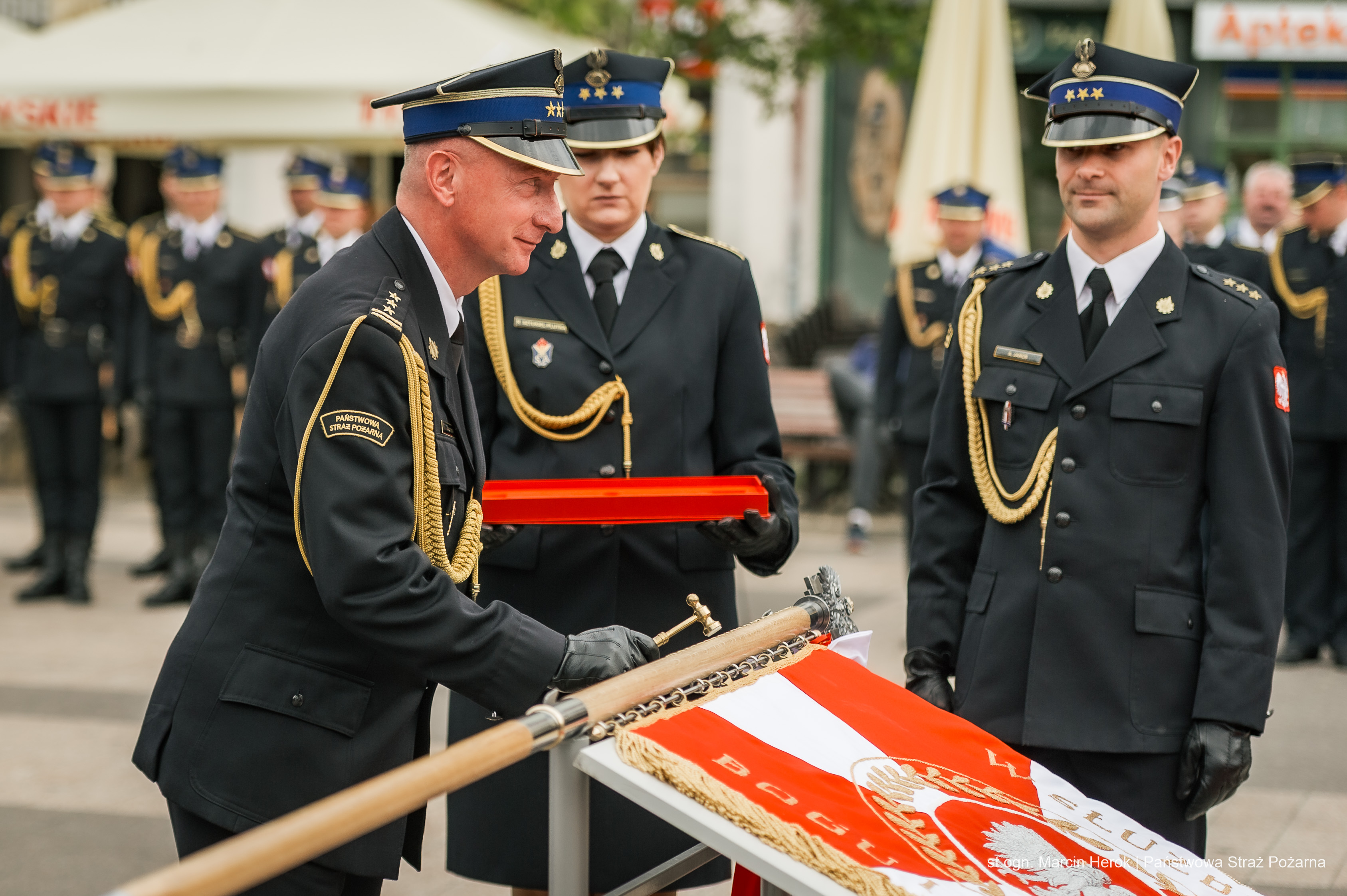 Następnie bryg. Sebastian Dziedzioch oddał honory sztandarowi, po czym złożył meldunek Śląskiemu Komendantowi Wojewódzkiemu PSP st. bryg. Damianowi Legierskiemu o przejęciu obowiązków Komendanta Miejskiego PSP.