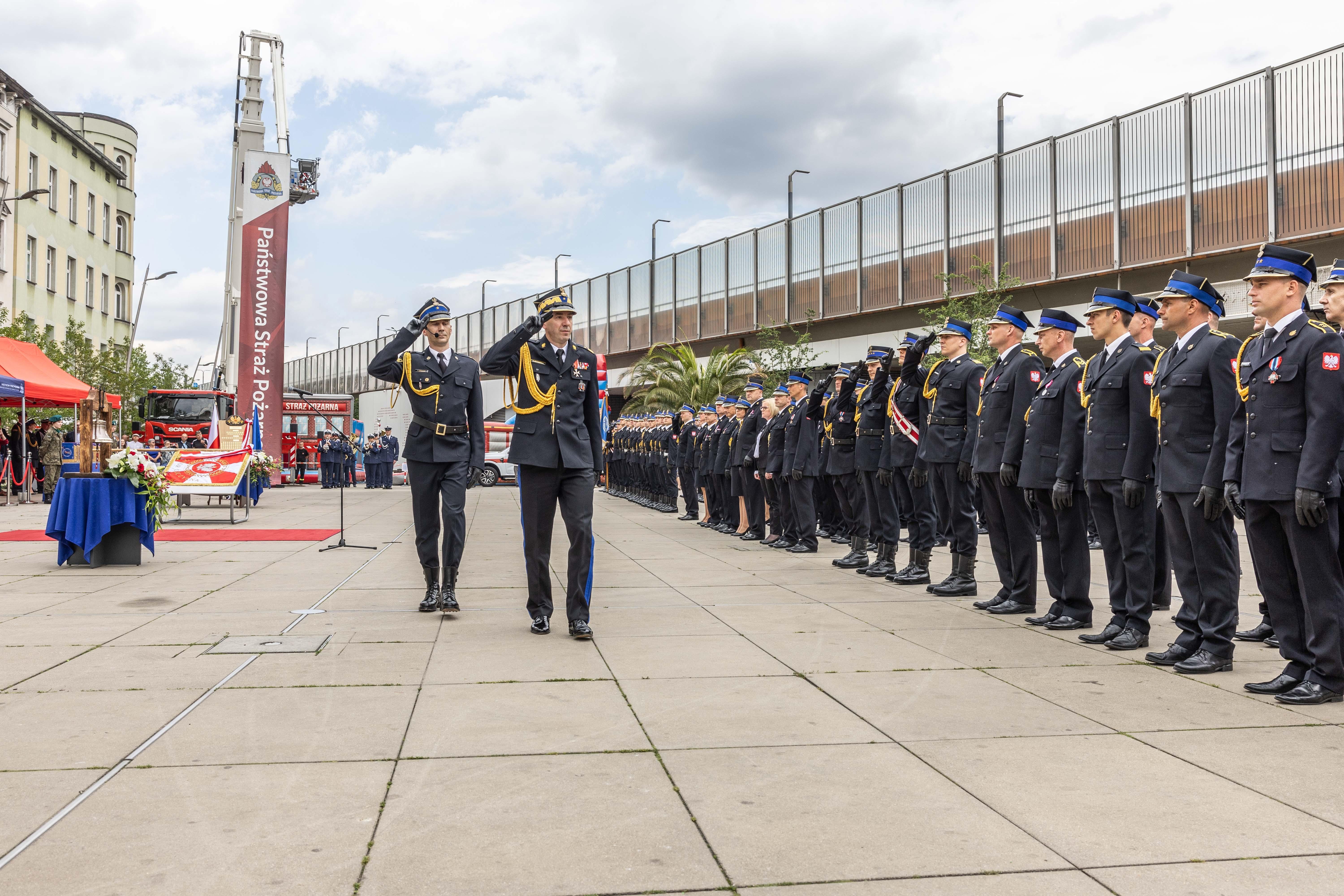 Uroczysty apel rozpoczął się złożeniem meldunku przez dowódcę uroczystości mł. bryg. Pawła Strugacza, Komendantowi Głównemu Państwowej Straży Pożarnej nadbryg. dr. inż. Mariuszowi Feltynowskiemu, który dokonał przeglądu i powitania pododdziałów.