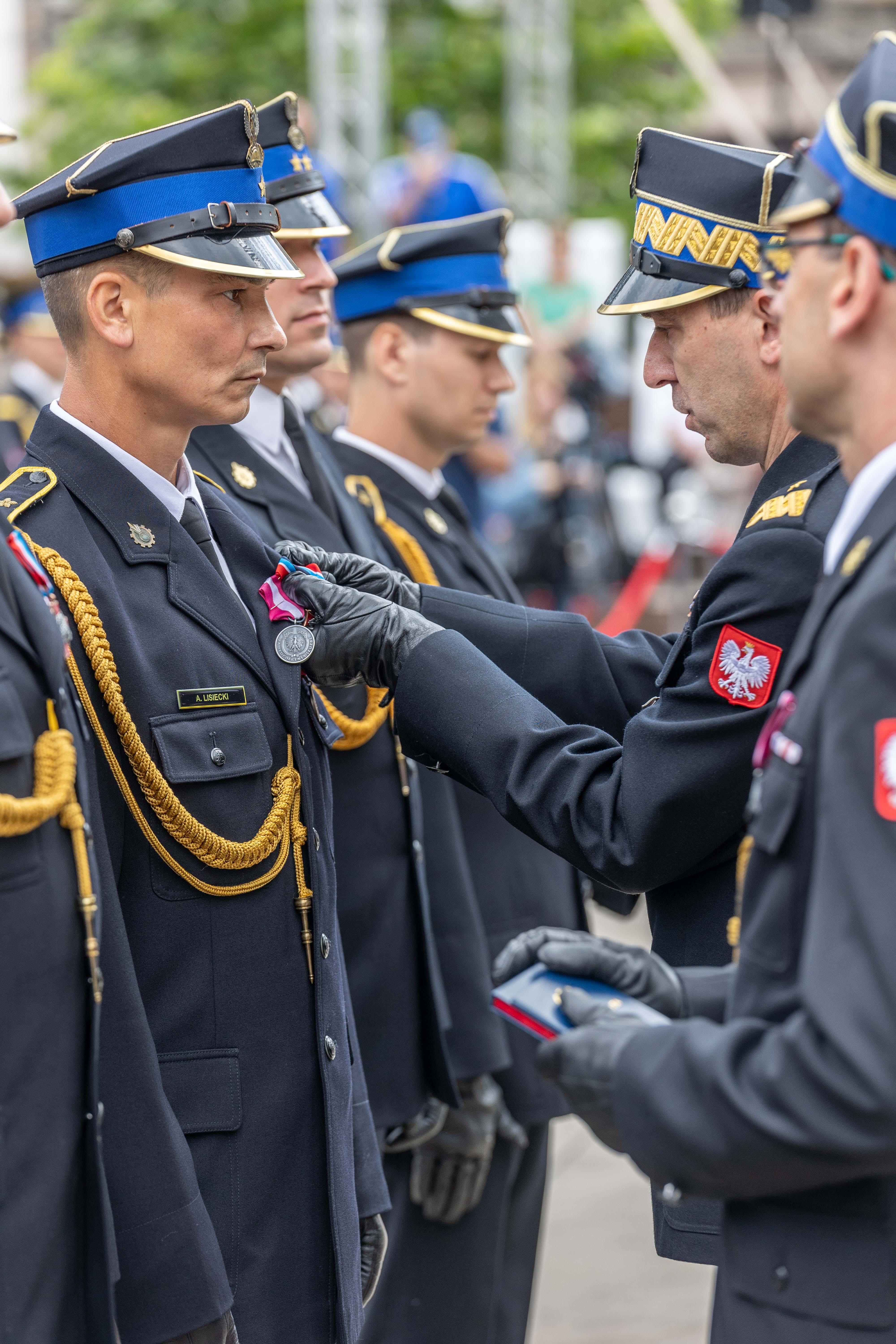 Odznaki wręczył Komendant Główny PSP nadbryg. dr. inż. Mariusz Feltynowski w asyście Śląskiego Komendanta Wojewódzkiego PSP st. bryg. Wojciecha Kruczka.