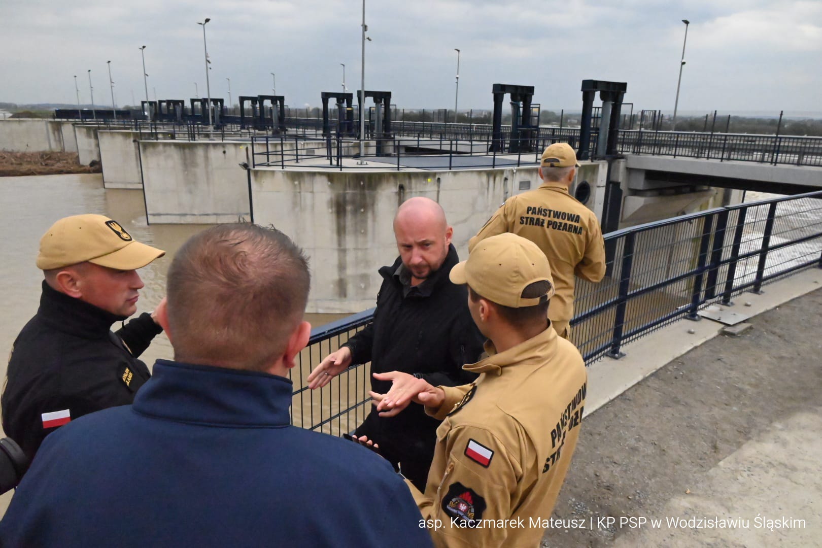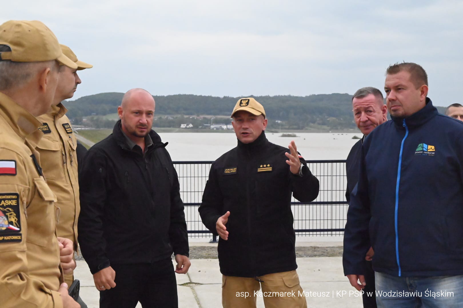 Po naradzie, Zastępca Komendanta Głównego PSP z Szefem BBN udali się na teren zbiornika Racibórz Dolny, gdzie pracownicy Wód Polskich przedstawili aktualną sytuację na rzece Odrze oraz prognozy na najbliższe godziny.