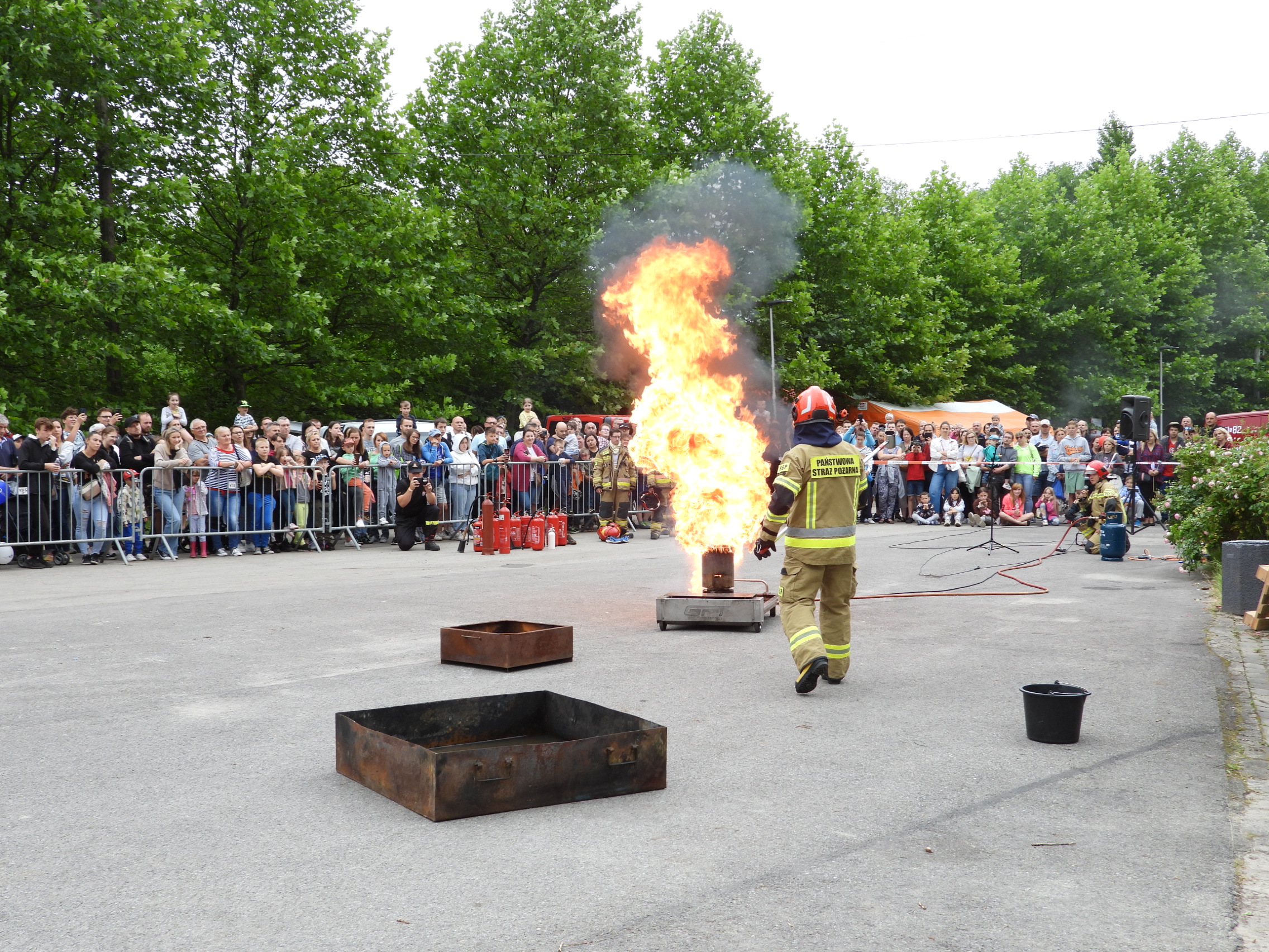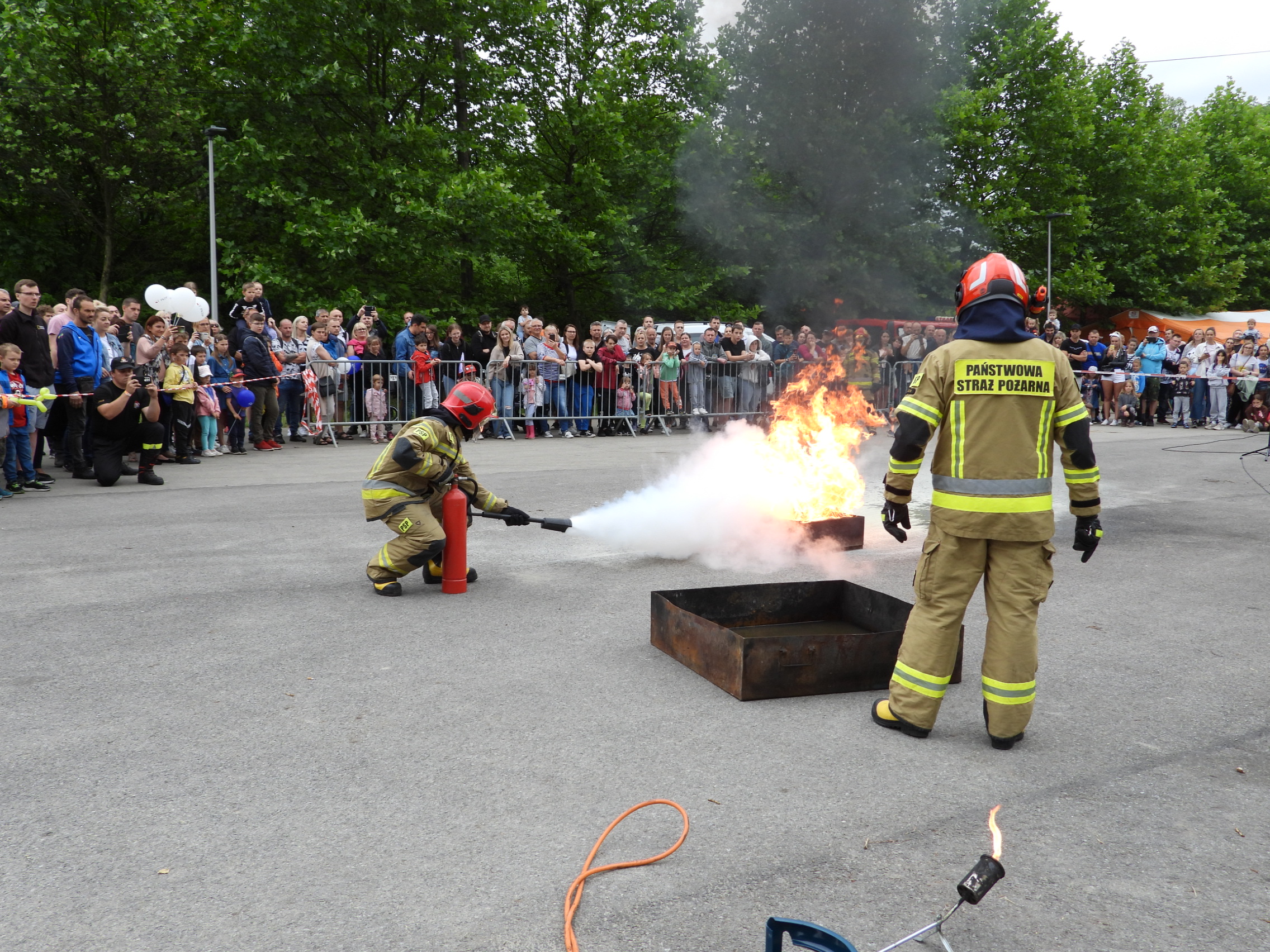 Ostatnim pokazem był przygotowany przez strażaków z Komendy Powiatowej PSP w Będzinie pokaz gaszenia płonącego oleju, instruktaż, jak postępować z palącym się gazem z butli oraz szkolenie z obsługi gaśnic dla ochotników spośród widzów.