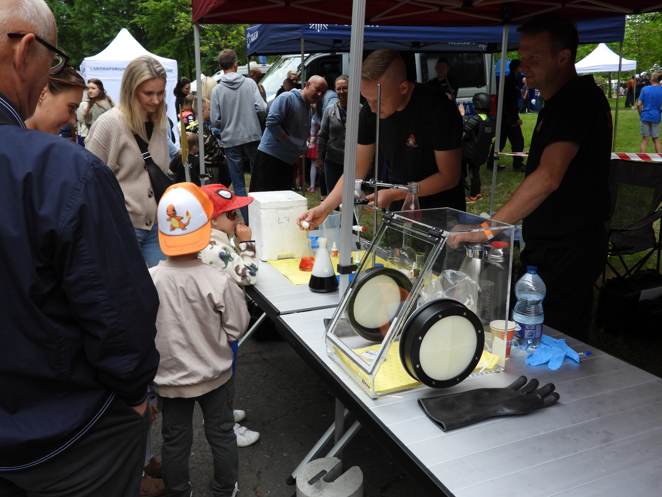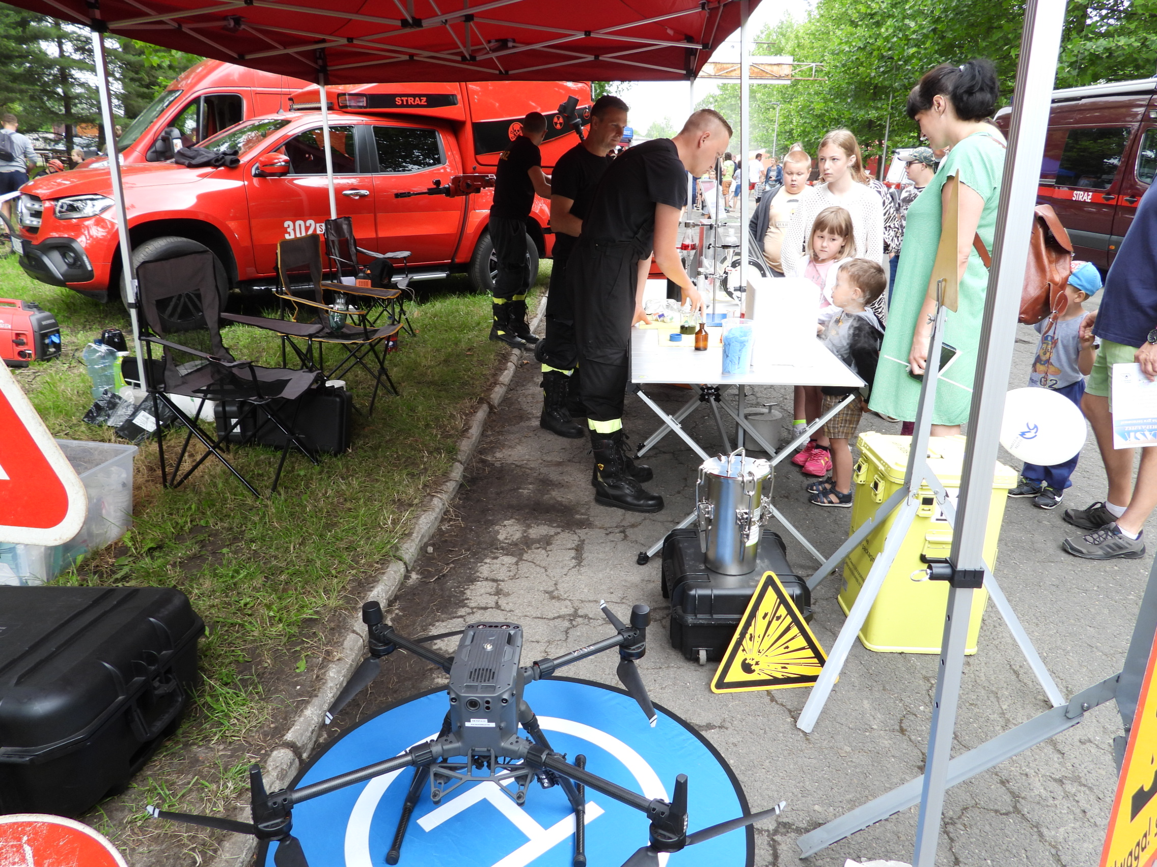 Specjalistyczna grupa ratownictwa chemiczno – ekologicznego z Komendy Miejskiej PSP w Katowicach przygotowała interaktywne stoisko laboratorium, na którym odbywał się pokaz reakcji chemicznych, prezentacje sprzętu pomiarowego będącego na wyposażeniu jednostki w tym drona i robota IBIS, który jest przeznaczony do prowadzenia rozpoznania i poboru próbek.