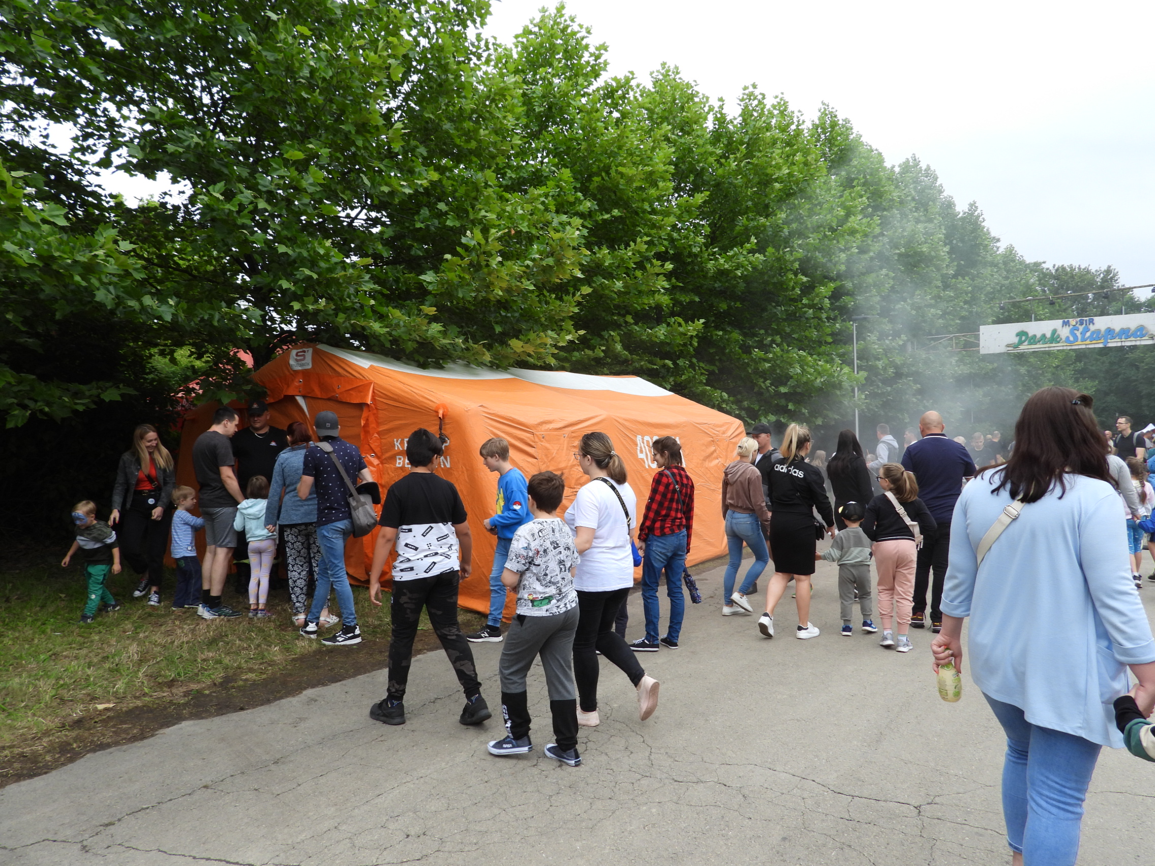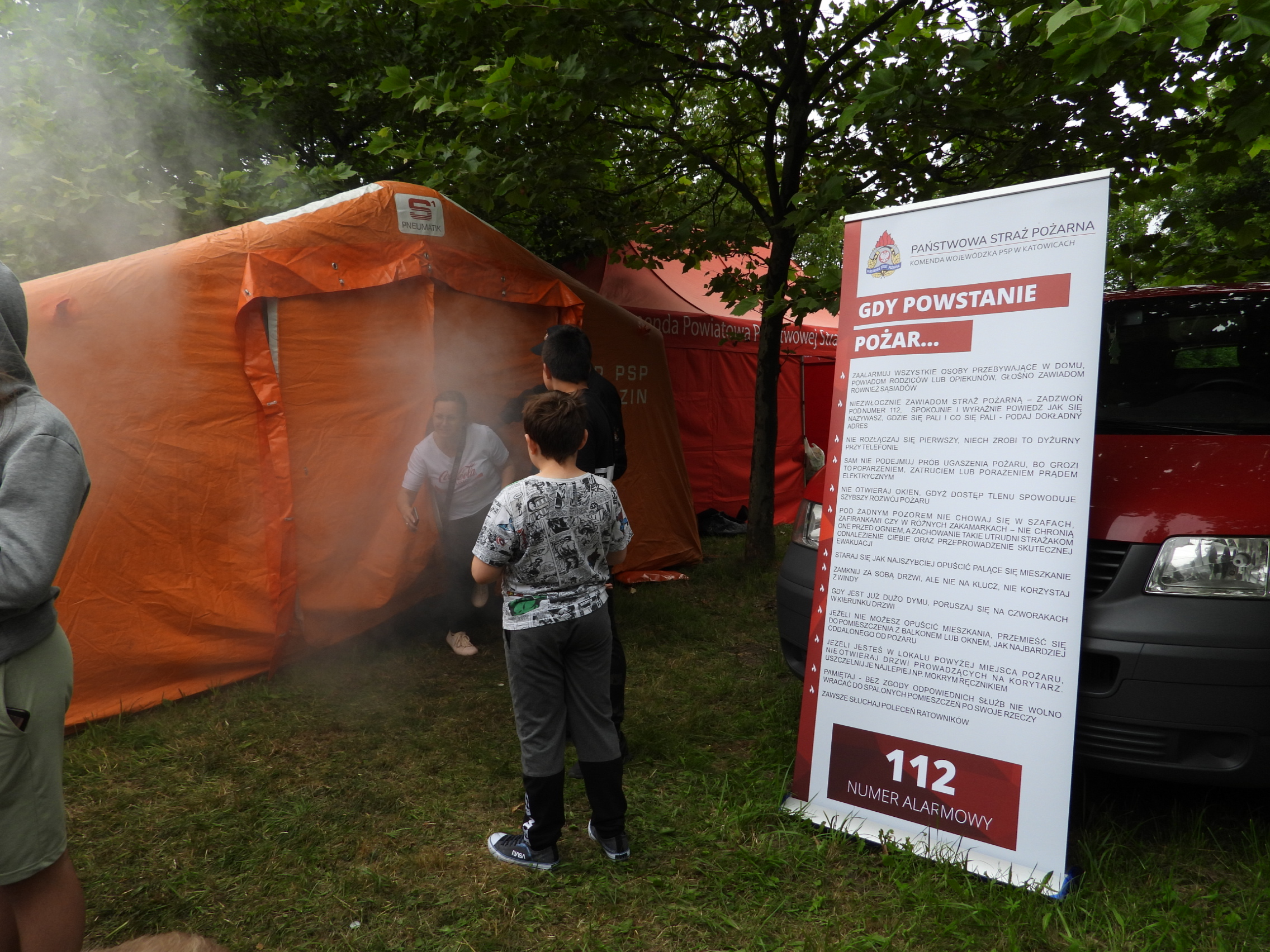Komenda Powiatowa PSP w Będzinie przygotowała namiot wypełniony bezpiecznym dymem. Stanowiło to niewielką, namiastkę prawdziwego zadymienia z jakim strażacy mają do czynienia podczas pożaru w pomieszczeniach.