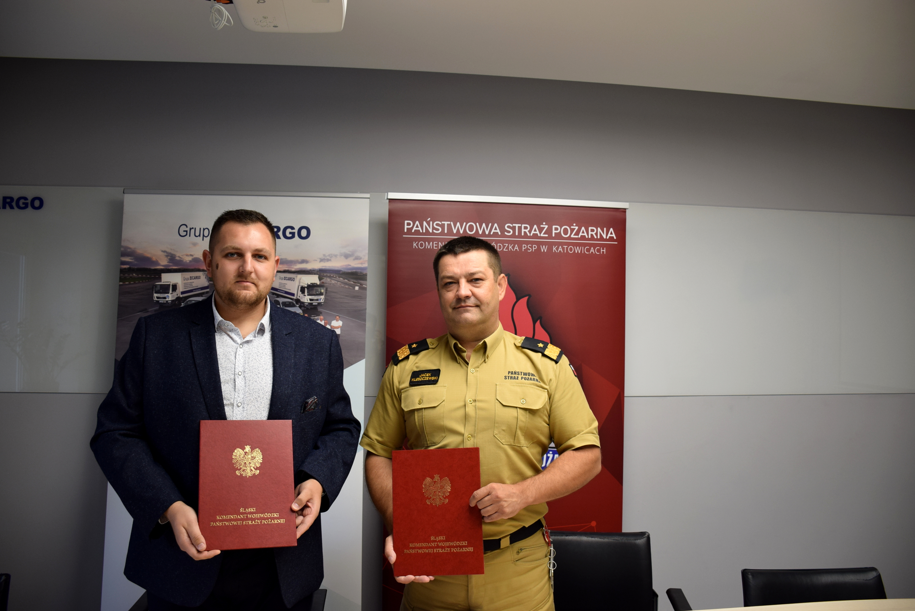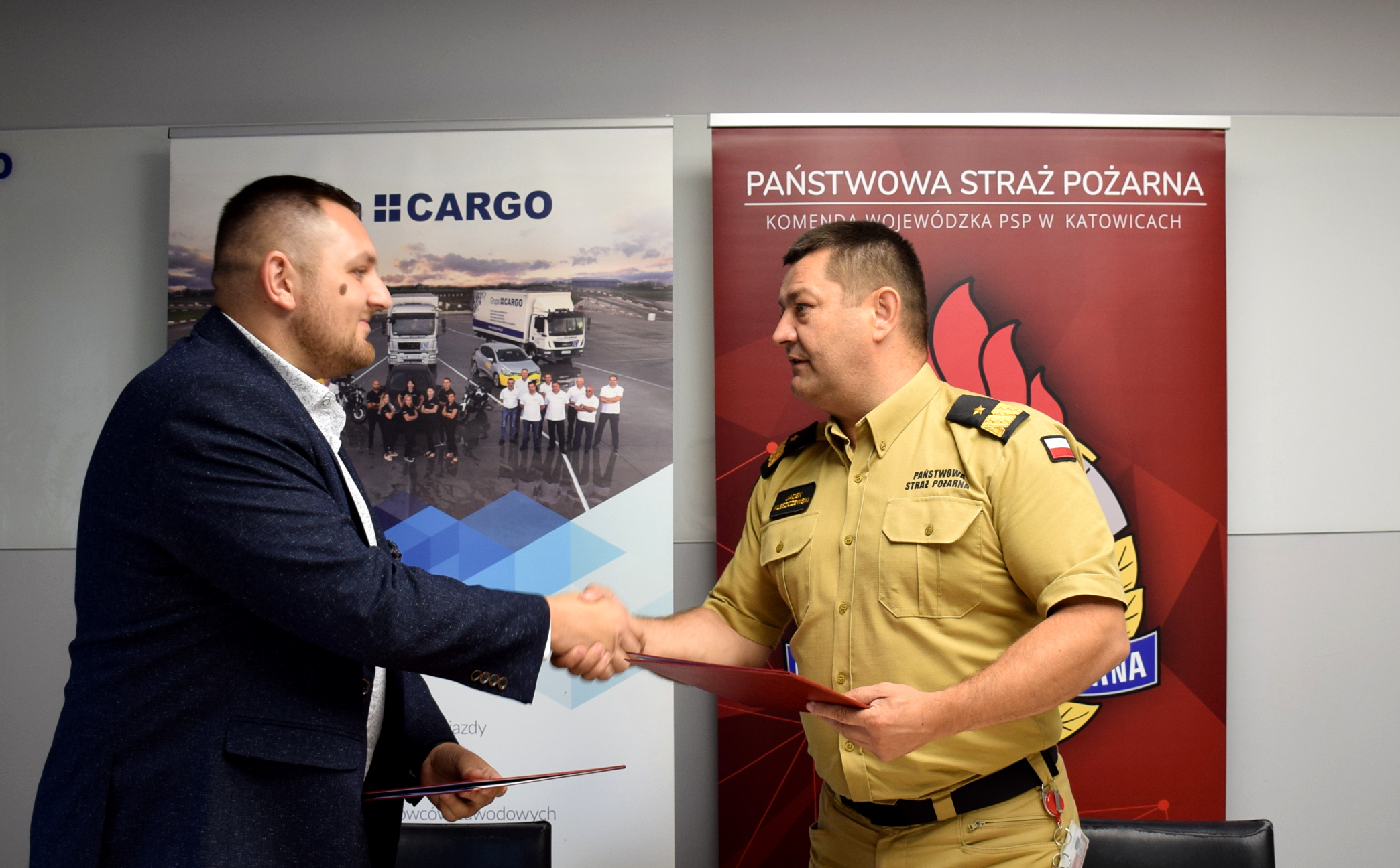22 sierpnia 2022 roku w siedzibie Zarządu Grupy Cargo w Jaworznie, Śląski Komendant Wojewódzki Państwowej Straży Pożarnej - nadbryg. Jacek Kleszczewski oraz Prezes Zarządu Grupy Cargo w Jaworznie - Pan Jakub Palka podpisali porozumienie w sprawie współpracy w zakresie realizacji szkoleń dla funkcjonariuszy Państwowej Straży Pożarnej pn. „Doskonalenie techniki jazdy i bezpieczeństwo na drodze”, dedykowane kierowcom Państwowej Straży Pożarnej, prowadzącym uprzywilejowane pojazdy. Podpisane dzisiaj porozumienie stanowi kontynuację analogicznego dokumentu podpisanego w kwietniu 2019 roku.