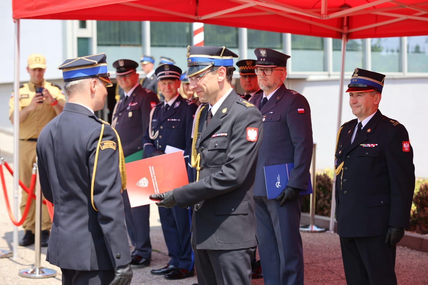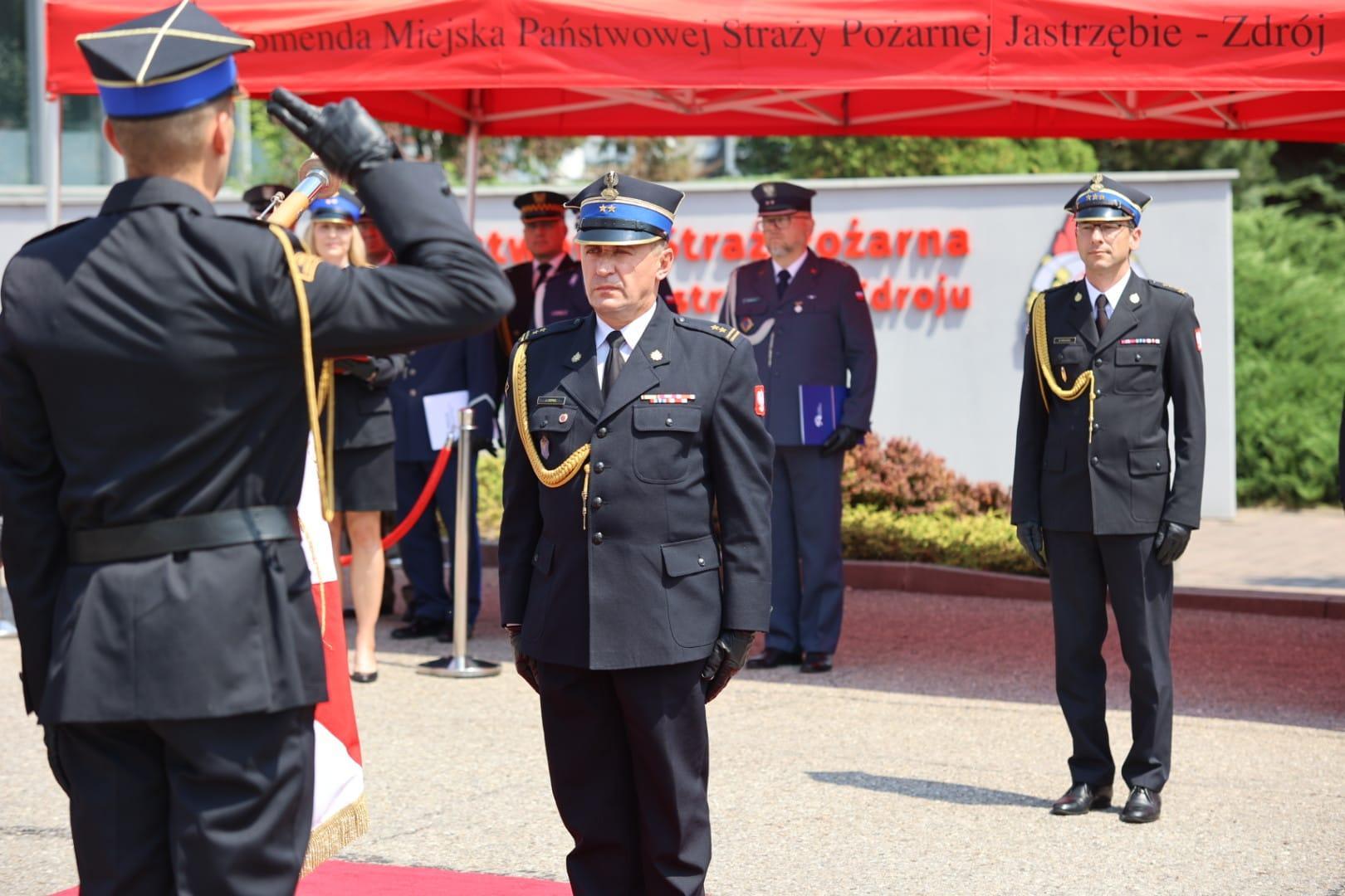 Następnie Śląski Komendant Wojewódzki Państwowej Straży Pożarnej przyjął meldunek o przyjęciu obowiązków Komendanta Miejskiego Państwowej Straży Pożarnej w Jastrzębiu-Zdroju.