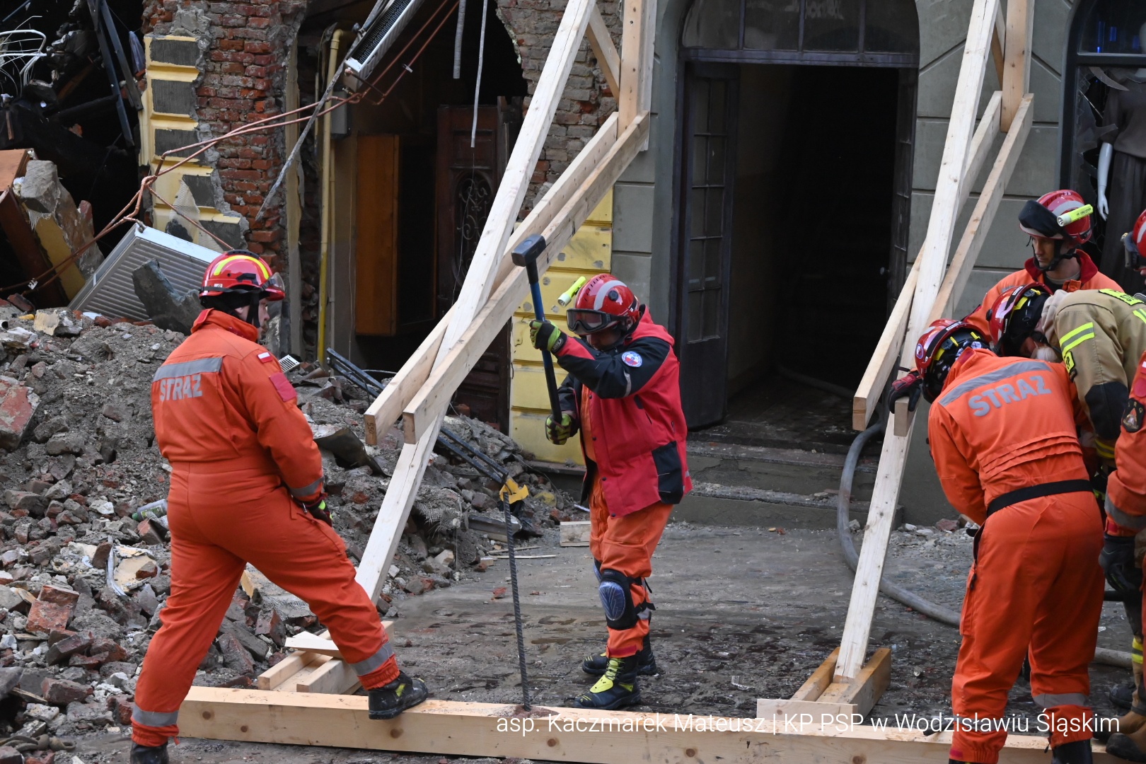 Z uzyskanych informacji w budynku podczas wybuchu mogły znajdować się dwie osoby. Niezwłocznie po ugaszeniu pożaru i ustabilizowaniu przy pomocy stempli ściany sąsiedniej kamienicy strażacy przystąpili do odgruzowywania i przeszukiwania gruzowiska zawalonej kamienicy. Działania były utrudnione ze względu na wydobywające się spod gruzów zarzewia ognia oraz niestabilne elementy konstrukcyjne. Ratownicy prowadzili działania ręcznie oraz przy pomocy specjalistycznego sprzętu, między innymi kamery termowizyjnej i wziernikowej oraz psów poszukiwawczych. W godzinach wieczornych ratownicy znaleźli ciała dwóch osób.