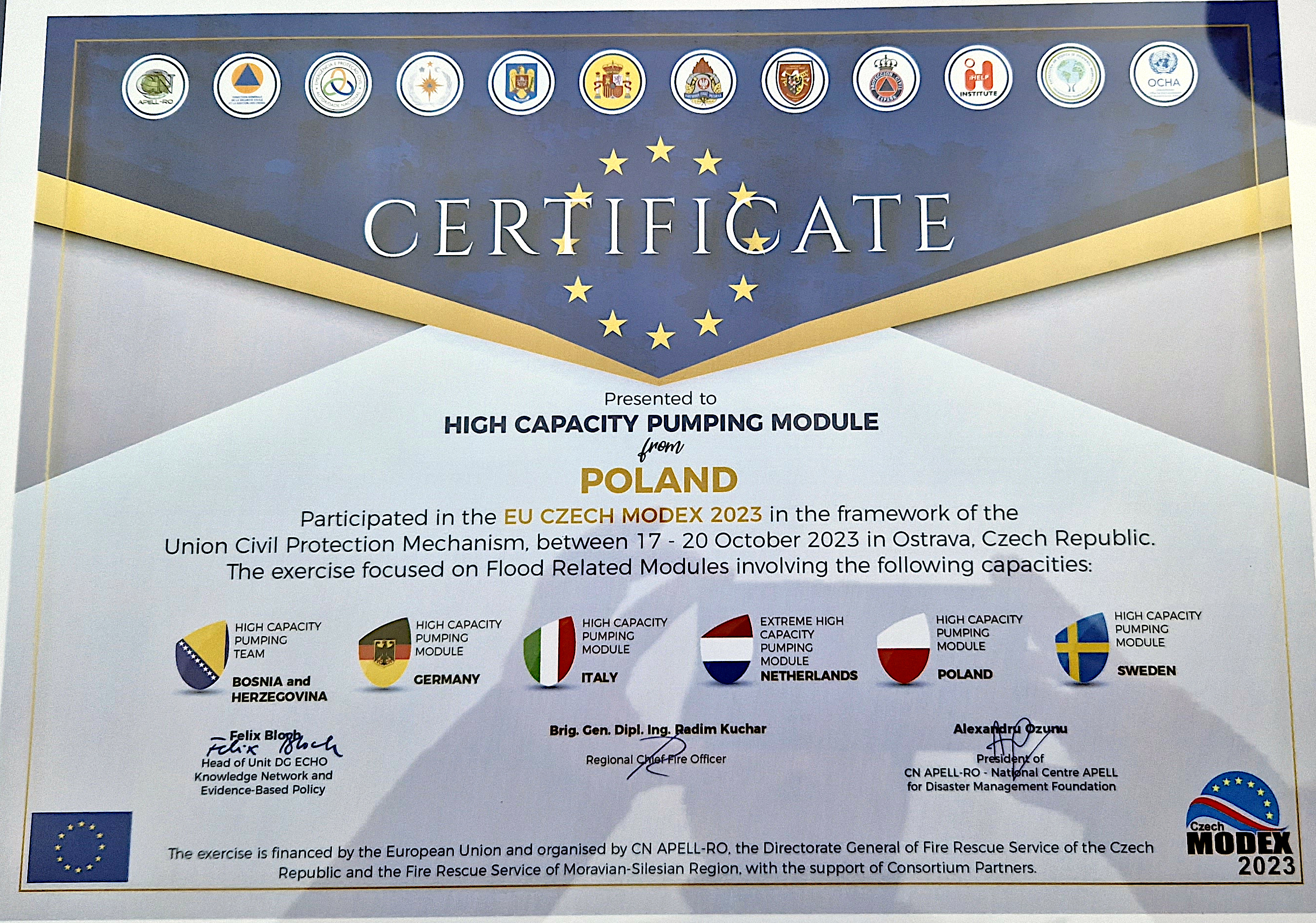 W dniach 17 – 20 października 2023 roku w Ostrawie (Republika Czeska) odbywały się międzynarodowe ćwiczenia ratownicze „EU CZECH MODEX 2023”, w których uczestniczyły zespoły ratownicze wyposażone w pompy wysokiej wydajności HCP (High Capacity Pumping) z Polski, Niemiec, Włoch, Szwecji, Bośni i Hercegowiny oraz z Holandii. Dla polskiego modułu te ćwiczenia były również okazją do przejścia procesu recertyfikacji, polegającego na sprawdzeniu możliwości operacyjnych oraz logistycznych, pod kątem wytycznych stawianych międzynarodowym modułom ratowniczym przez Komisję Europejską. Polski moduł HCP został oceniony bardzo dobrze.