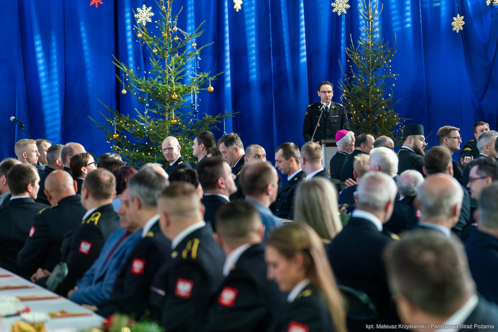 Gospodarz spotkania Śląski Komendant Wojewódzki PSP nadbryg. Wojciech Kruczek, w imieniu kierownictwa powitał zgromadzonych gości, a w swoim świątecznym przesłaniu zwrócił uwagę na istotę tego okresu, który przynosi ze sobą nie tylko magię radości i ciepła, ale również sprzyja refleksji nad relacjami i wartościami, które łączą ludzi. Podkreślił, że święta to nie tylko czas rodzinnych spotkań, ale przede wszystkim okazja do okazywania wdzięczności – zarówno najbliższym, jak i tym, z którymi na co dzień dzielimy zawodowe wyzwania. To okres, w którym warto zatrzymać się na chwilę, docenić bliskich, podziękować współpracownikom oraz skupić się na budowaniu więzi.