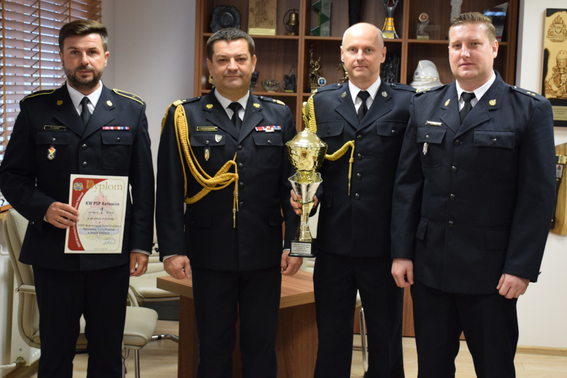 W środę 6 października br. Śląski Komendant Wojewódzki PSP nadbryg. Jacek Kleszczewski spotkał się z reprezentantami woj. śląskiego, którzy zdobyli we wrześniu br. tytuł drużynowych Mistrzów Polski Strażaków w Tenisie Stołowym. Była to okazja, by raz jeszcze pogratulować zwycięzcom najwyższego miejsca w klasyfikacji. W spotkaniu uczestniczyli mł. kpt. Dariusz Steuer z KM PSP Gliwice, st. sekc. Jarosław Tomicki z KM PSP Gliwice oraz asp. Sebastian Lubaś z KM PSP Katowice.