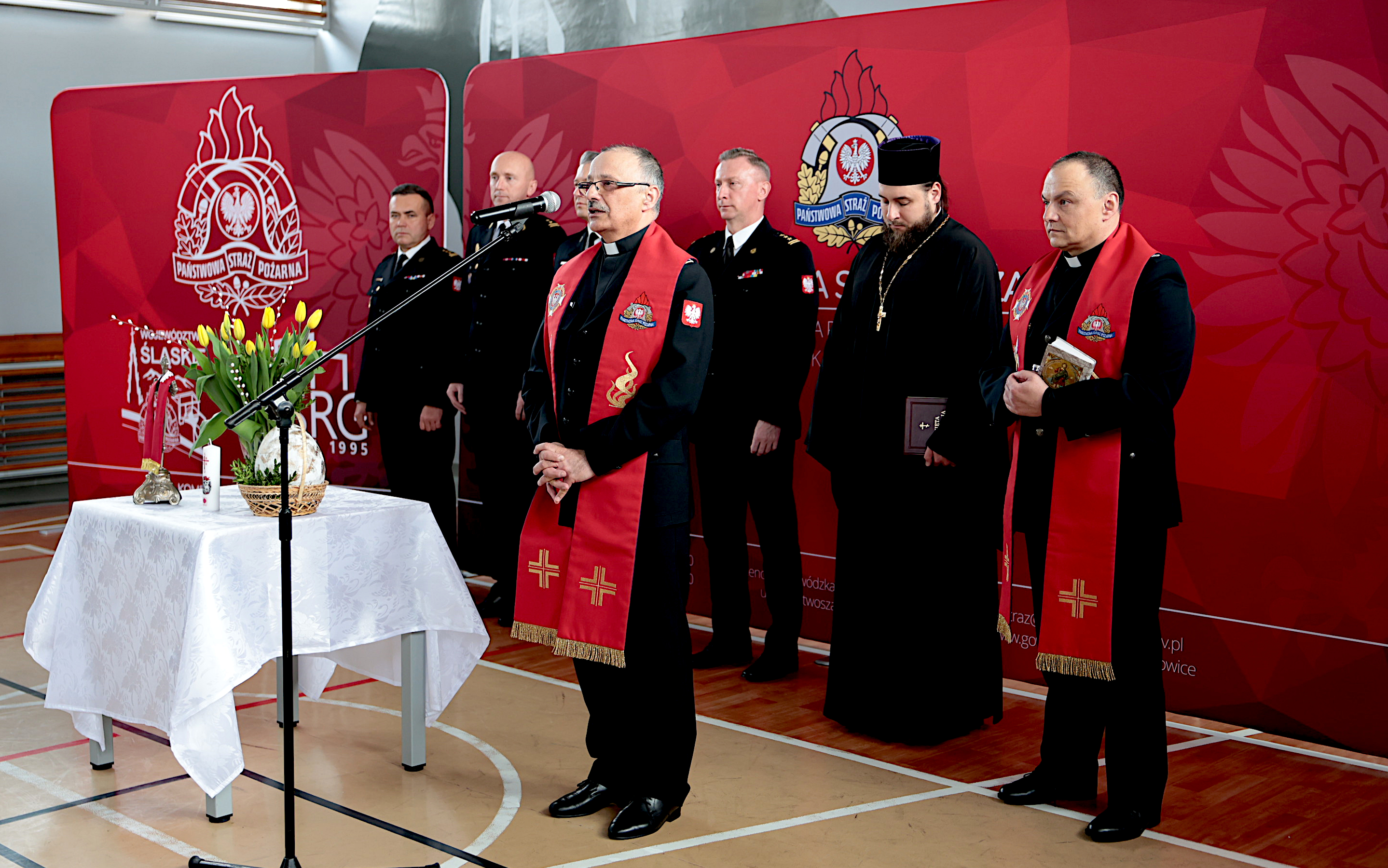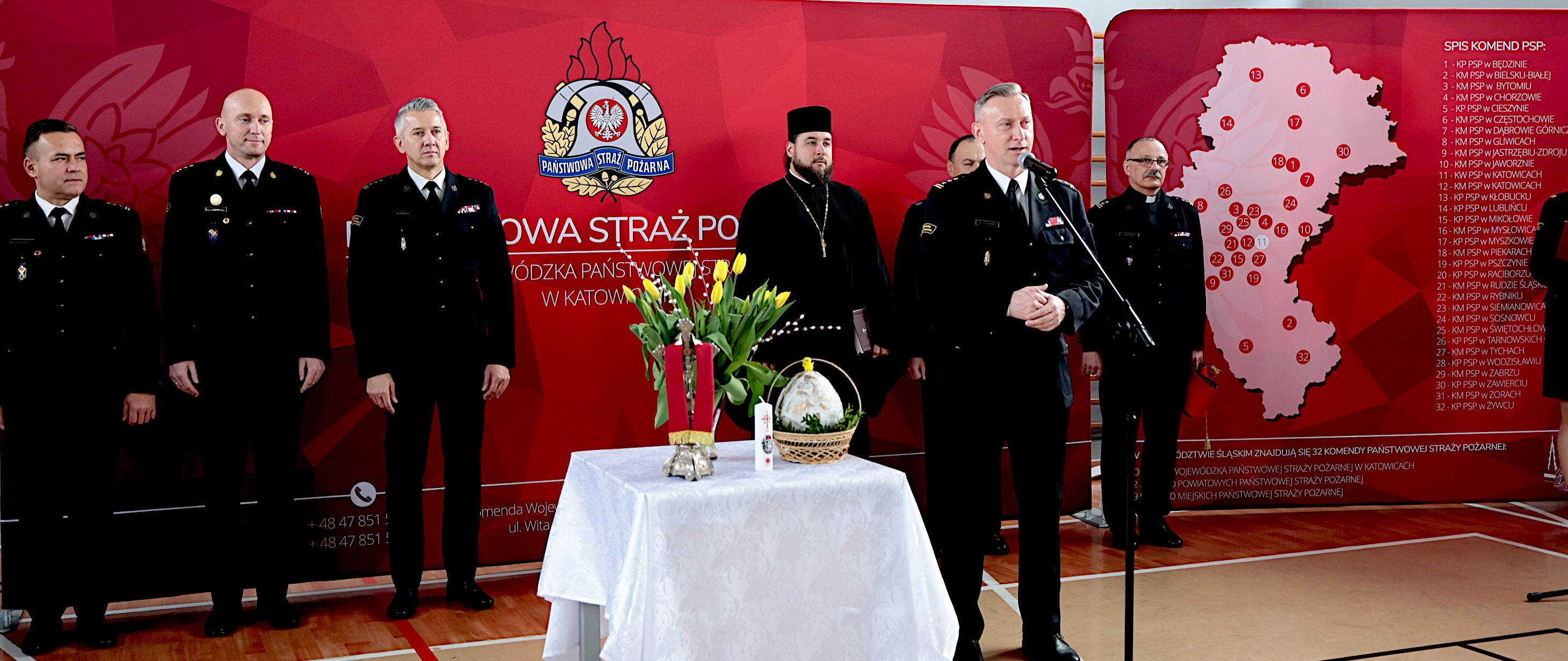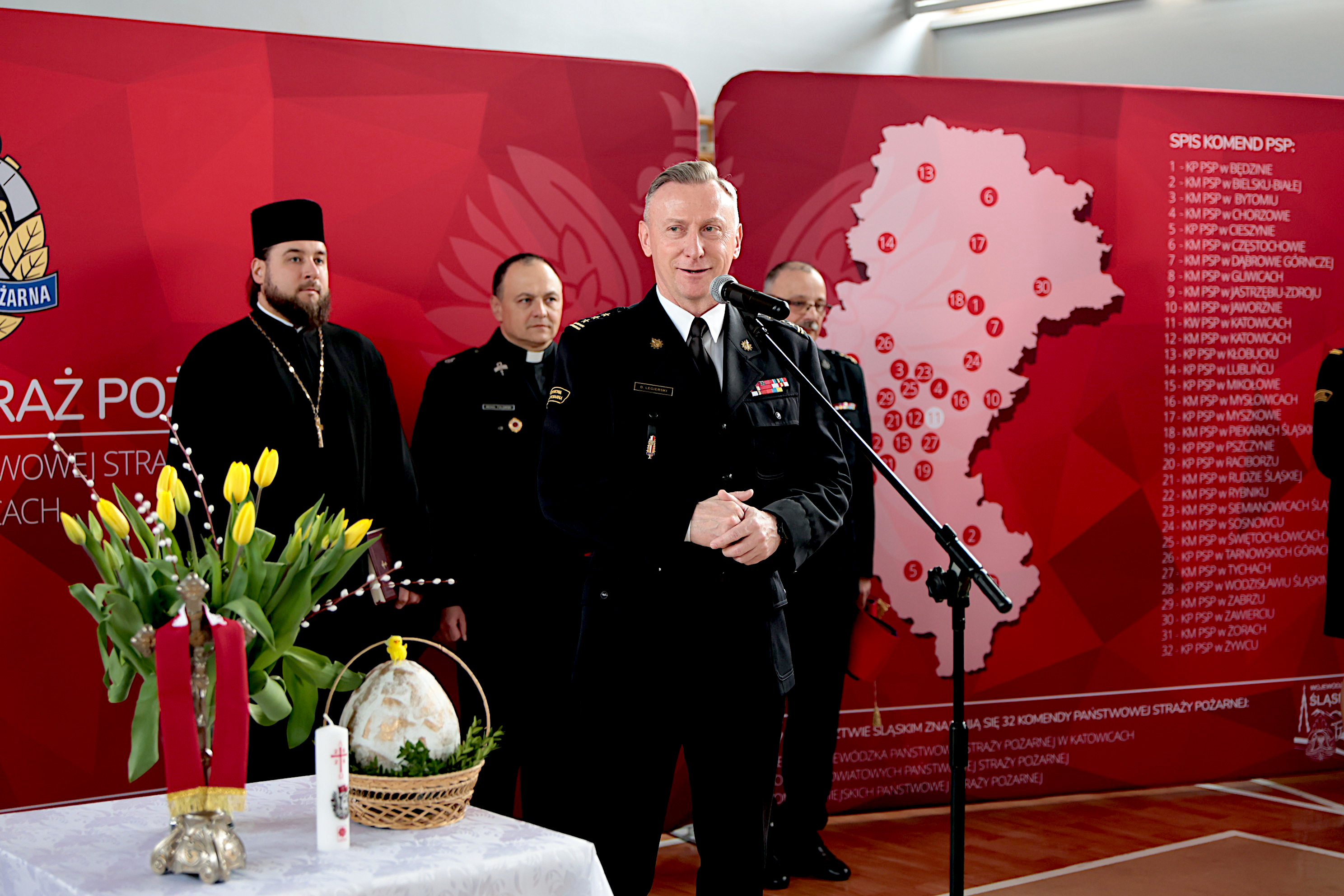 Śląski Komendant Wojewódzki PSP - st. bryg. Damian Legierski przywitał zaproszonych gości, następnie w imieniu kierownictwa życzył wszystkim spokoju, odpoczynku od codziennych spraw i spędzenia zbliżających się świąt w gronie najbliższych. Na zakończenie swojego wystąpienia zaprosił do wspólnej modlitwy. Obecni na spotkaniu kapelani: ks. bryg. Adam Glajcar kapelan krajowy strażaków wyznania ewangelicko – augsburskiego, ks. Michał Palowski kapelan wojewódzki strażaków wyznania rzymsko – katolickiego oraz ks. Marcin Bielawski – kapelan wojewódzki strażaków wyznania prawosławnego udzielili duszpasterskiego błogosławieństwa, po którym poświęcono tradycyjne pokarmy wielkanocne.