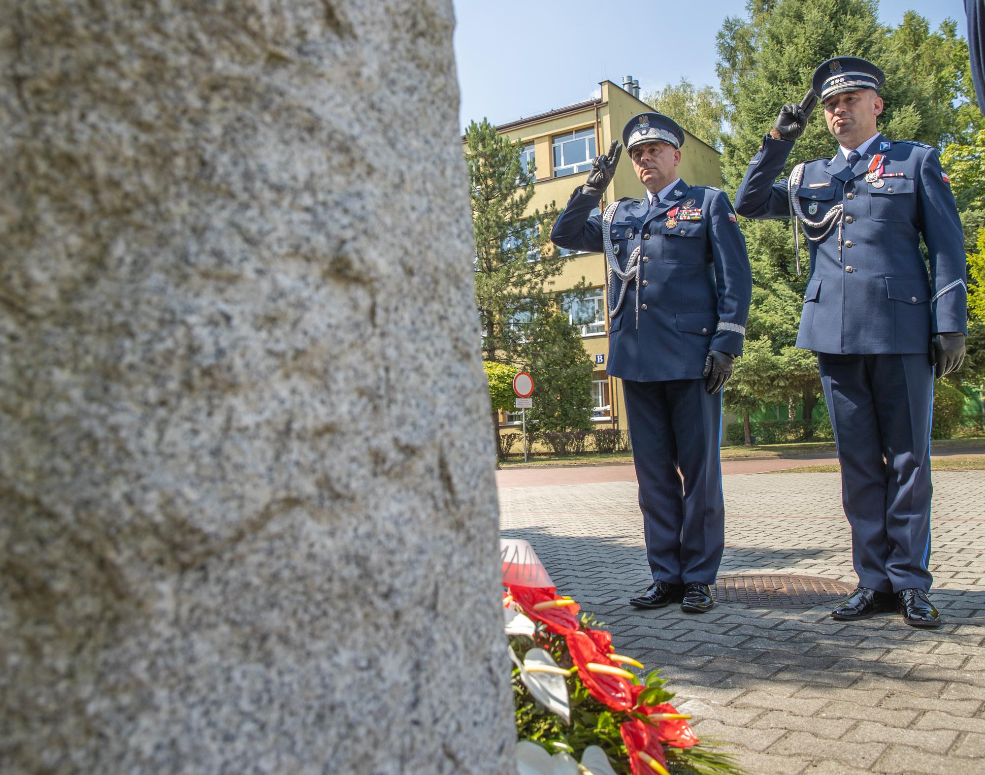 Pod obeliskiem upamiętniającym policjantów województwa śląskiego zamordowanych przez NKWD w 1940 roku, wieniec złożyli Zastępca Komendanta Głównego Policji nadinsp. dr Rafał Kochańczyk i Komendant Szkoły Policji w Katowicach insp. Rafał Stanisławski.
