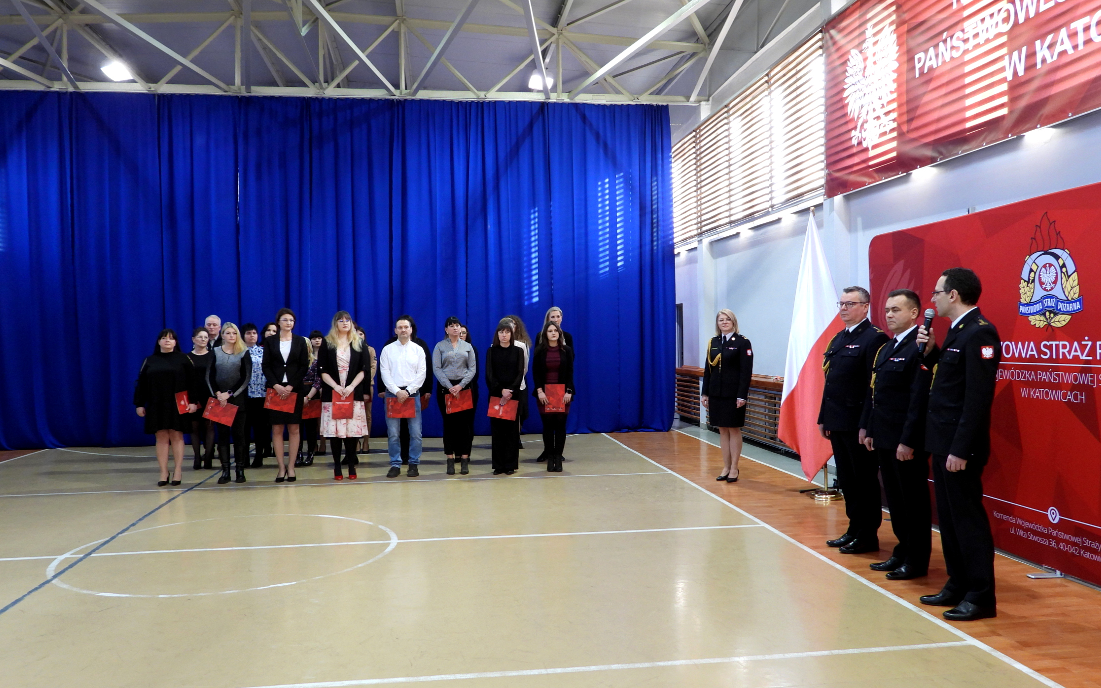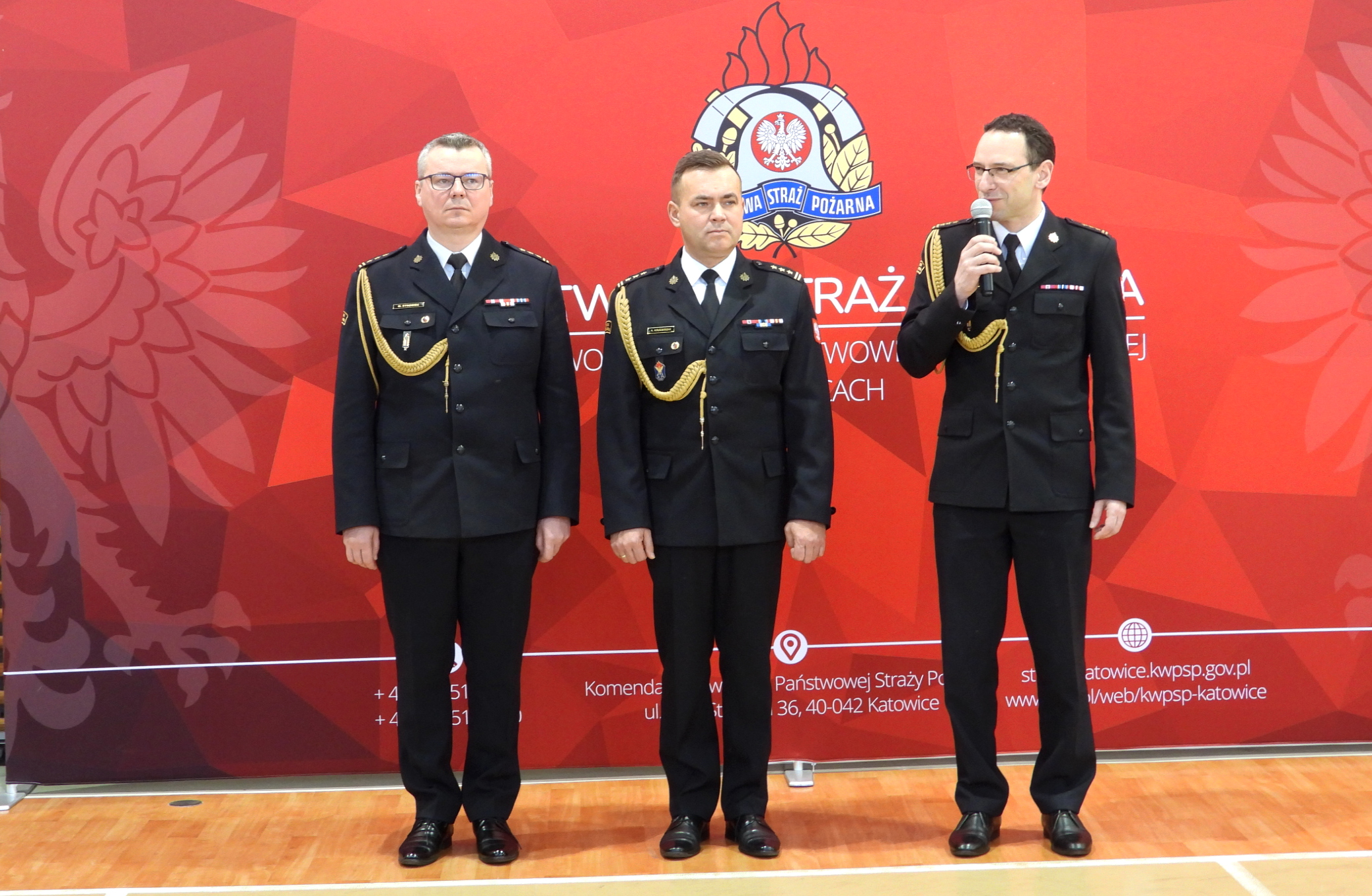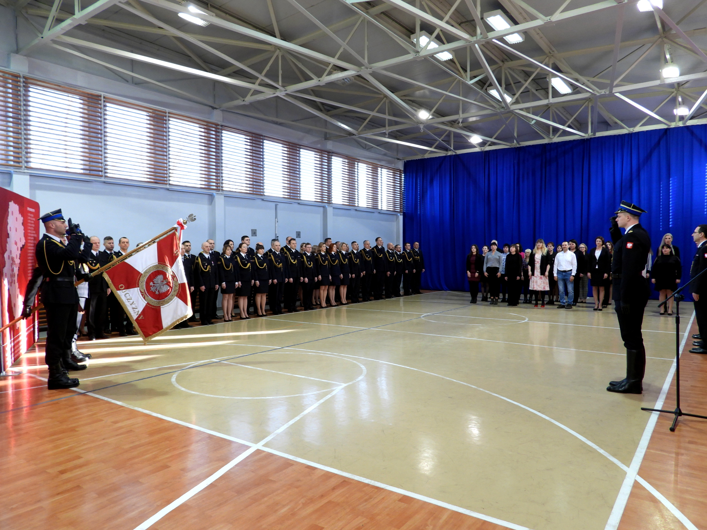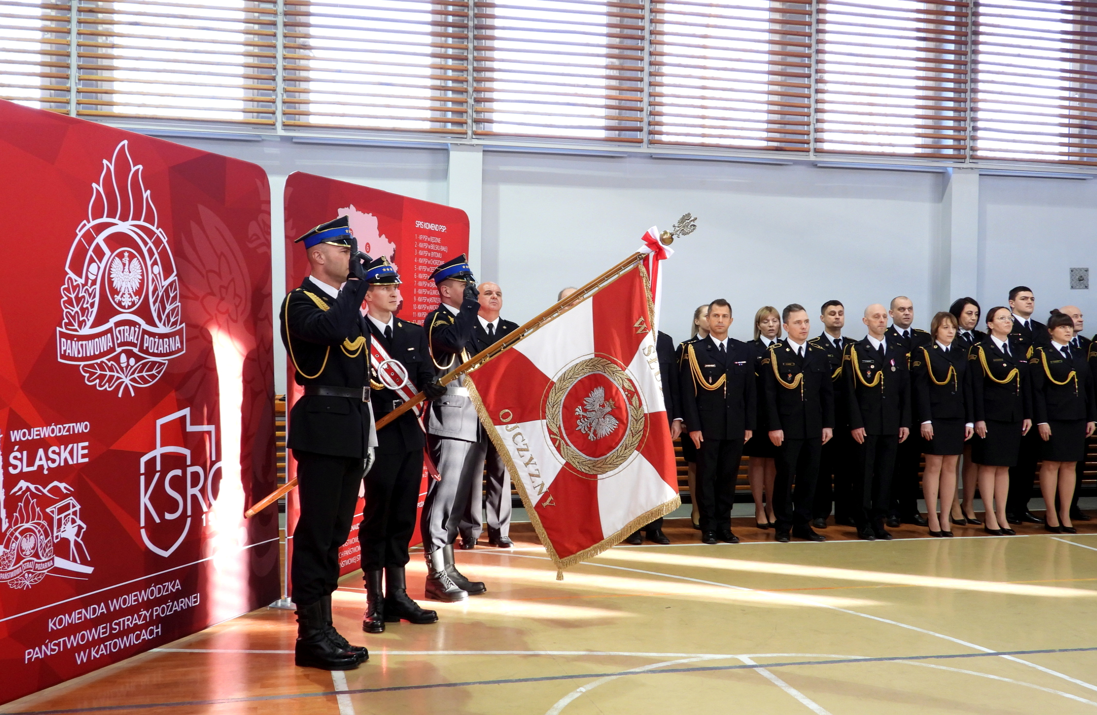 Uroczystość rozpoczęła się od złożenia meldunku Śląskiemu Komendantowi Wojewódzkiemu PSP st.bryg. Wojciechowi Kruczkowi przez dowódcę uroczystości mł. bryg. Macieja Skulicha, wprowadzenia sztandaru i odegrania hymnu państwowego.