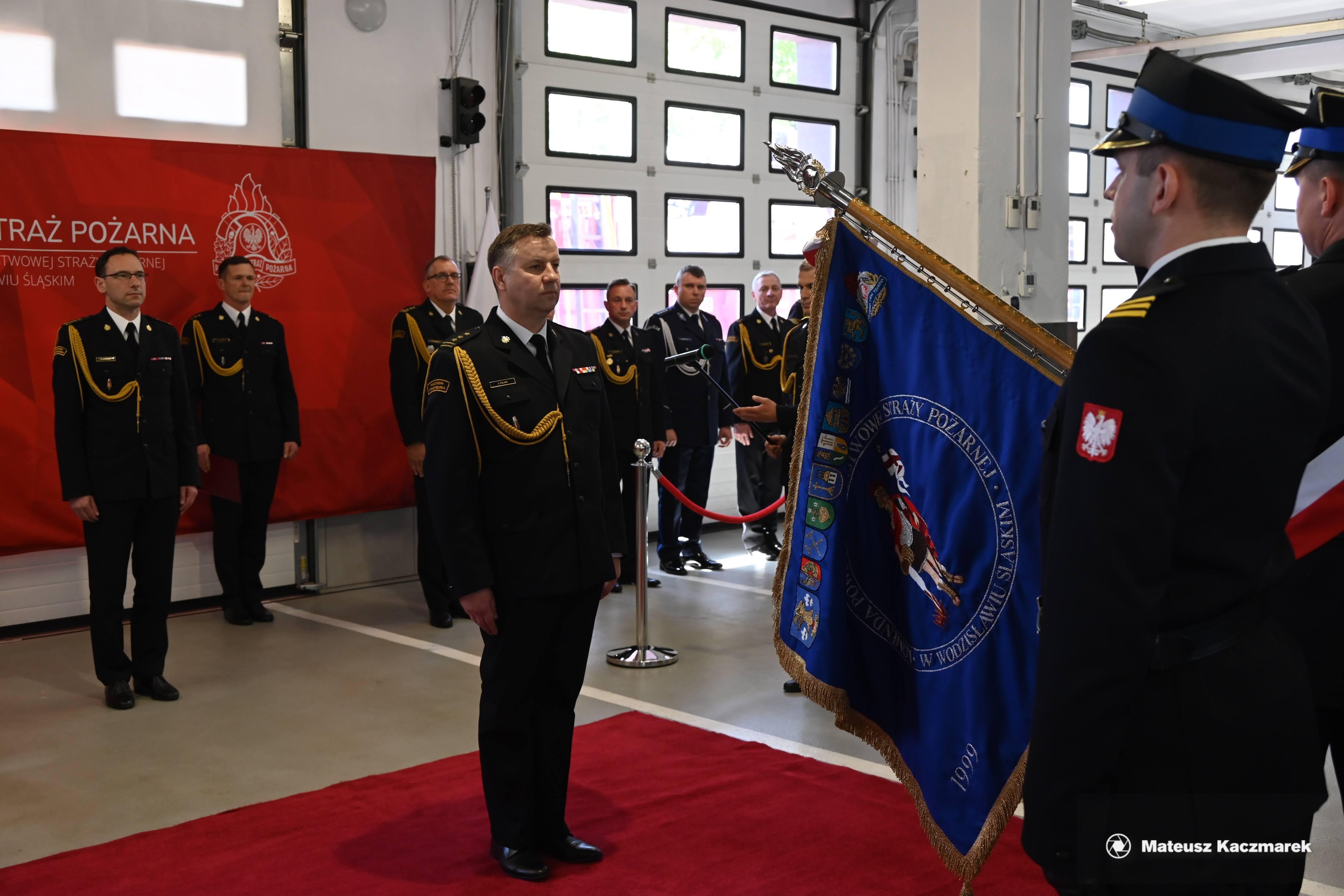 Następnie, po oddaniu honorów sztandarowi, st. bryg. Jacek Filas złożył Śląskiemu Komendantowi Wojewódzkiemu PSP meldunek o przyjęciu obowiązków Komendanta Powiatowego PSP w Wodzisławiu Śląskim.