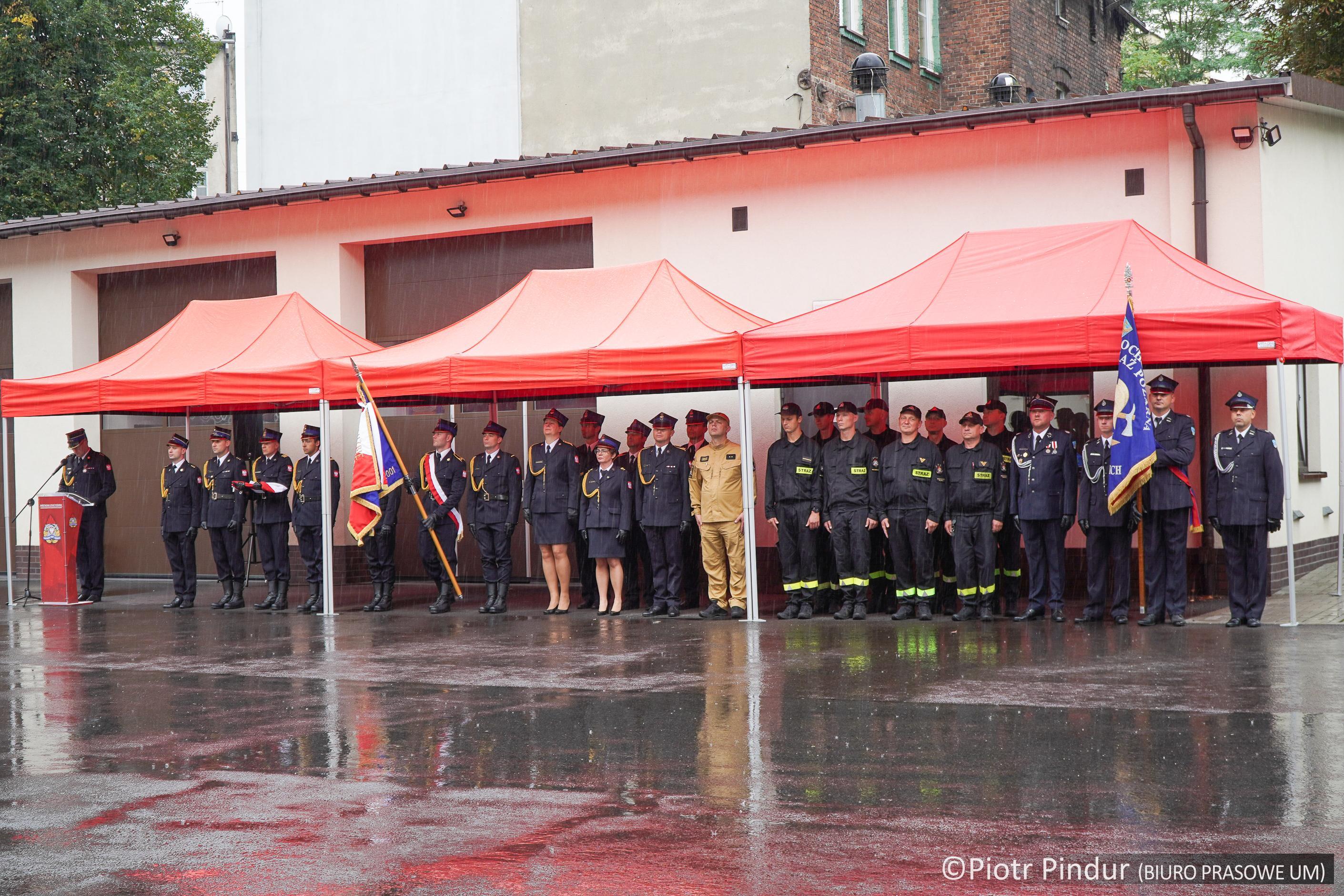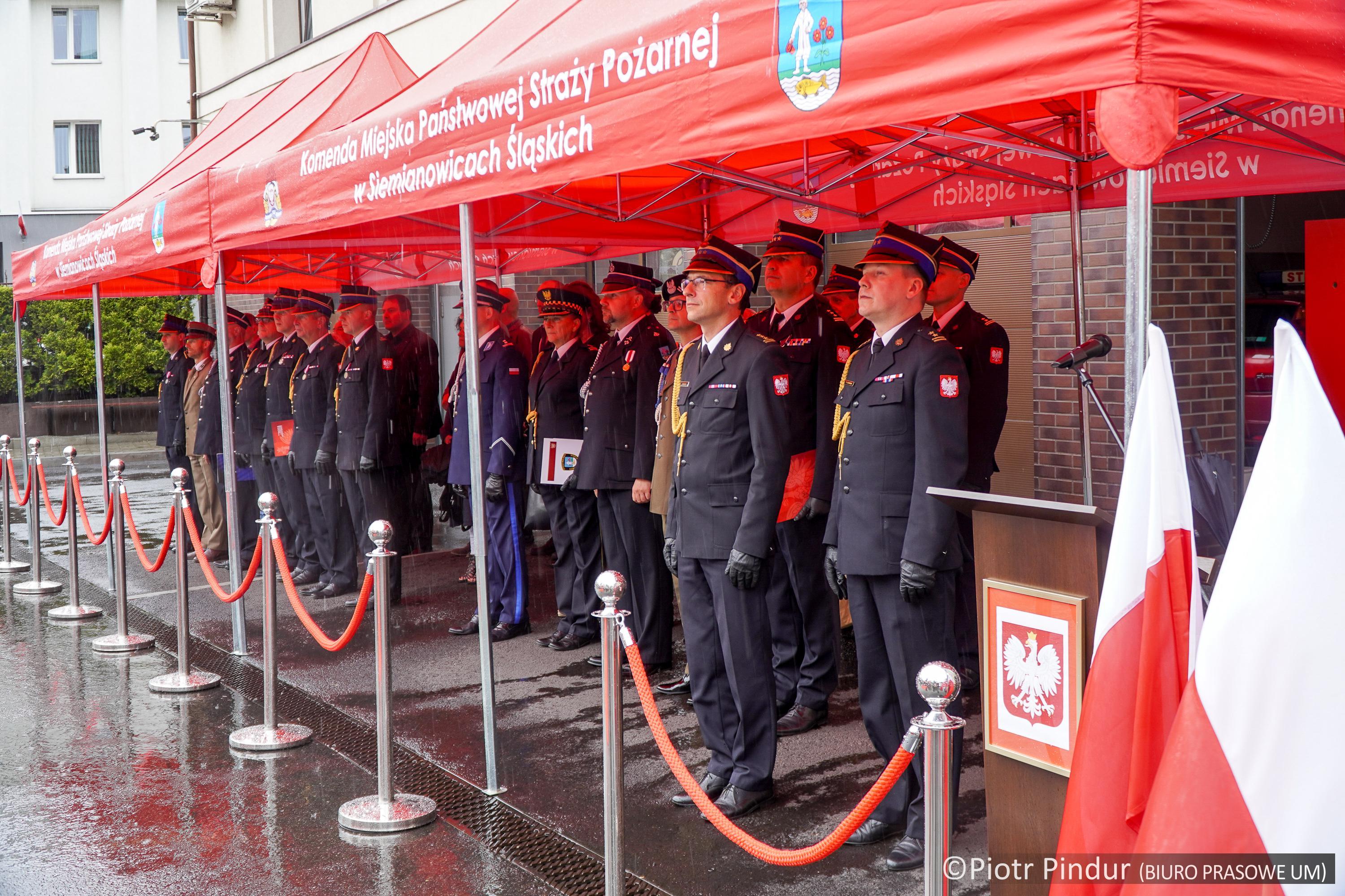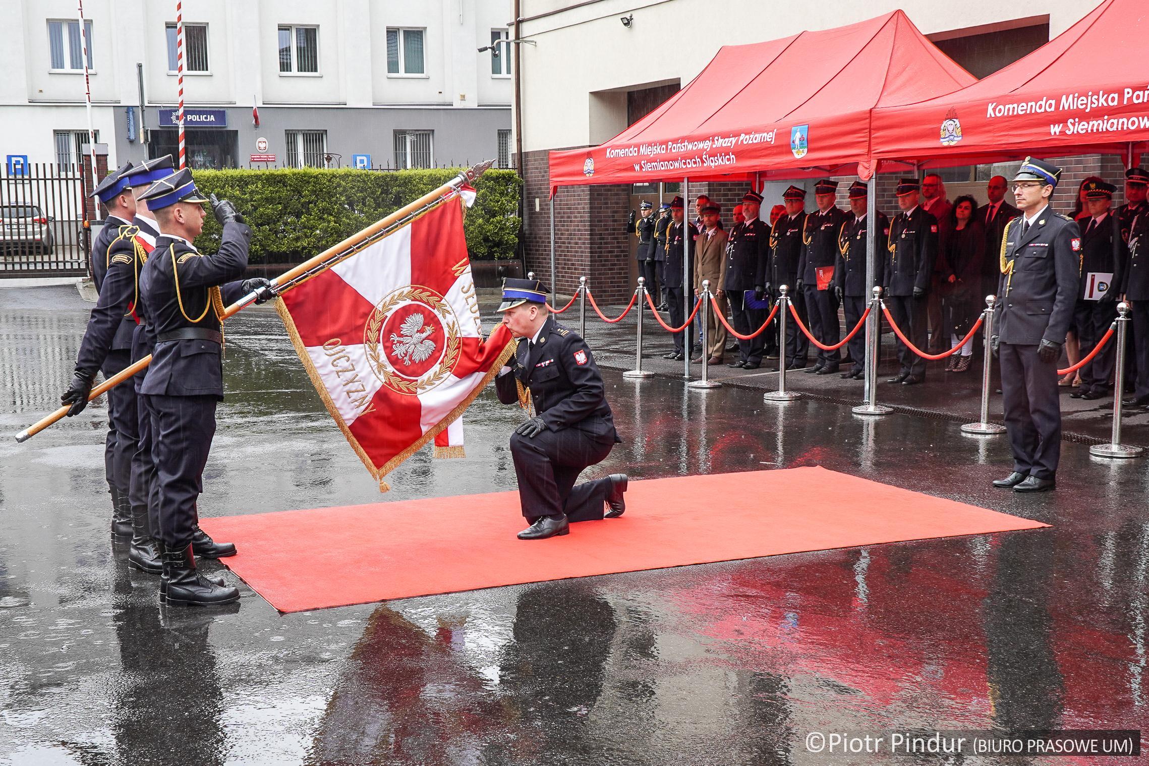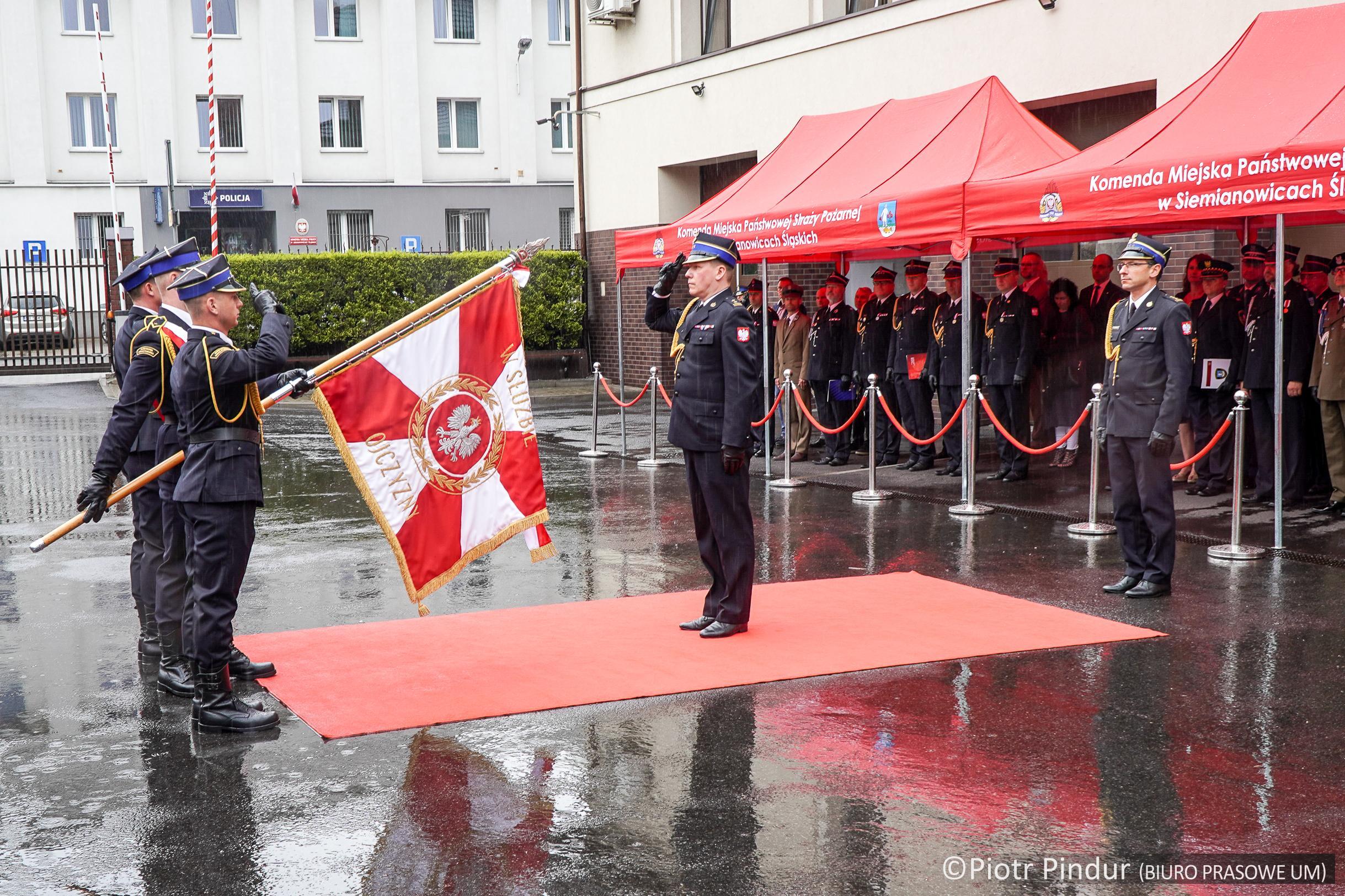 Uroczystość rozpoczęła się wprowadzeniem sztandaru Komendy Miejskiej PSP w Siemianowicach Śląskich i złożeniem meldunku Śląskiemu Komendantowi Wojewódzkiemu PSP st. bryg. Wojciechowi Kruczkowi przez dowódcę uroczystości st. kpt. Kamila Kwandransa, po czym nastąpiło uroczyste podniesienie flagi państwowej przy akompaniamencie hymnu państwowego.