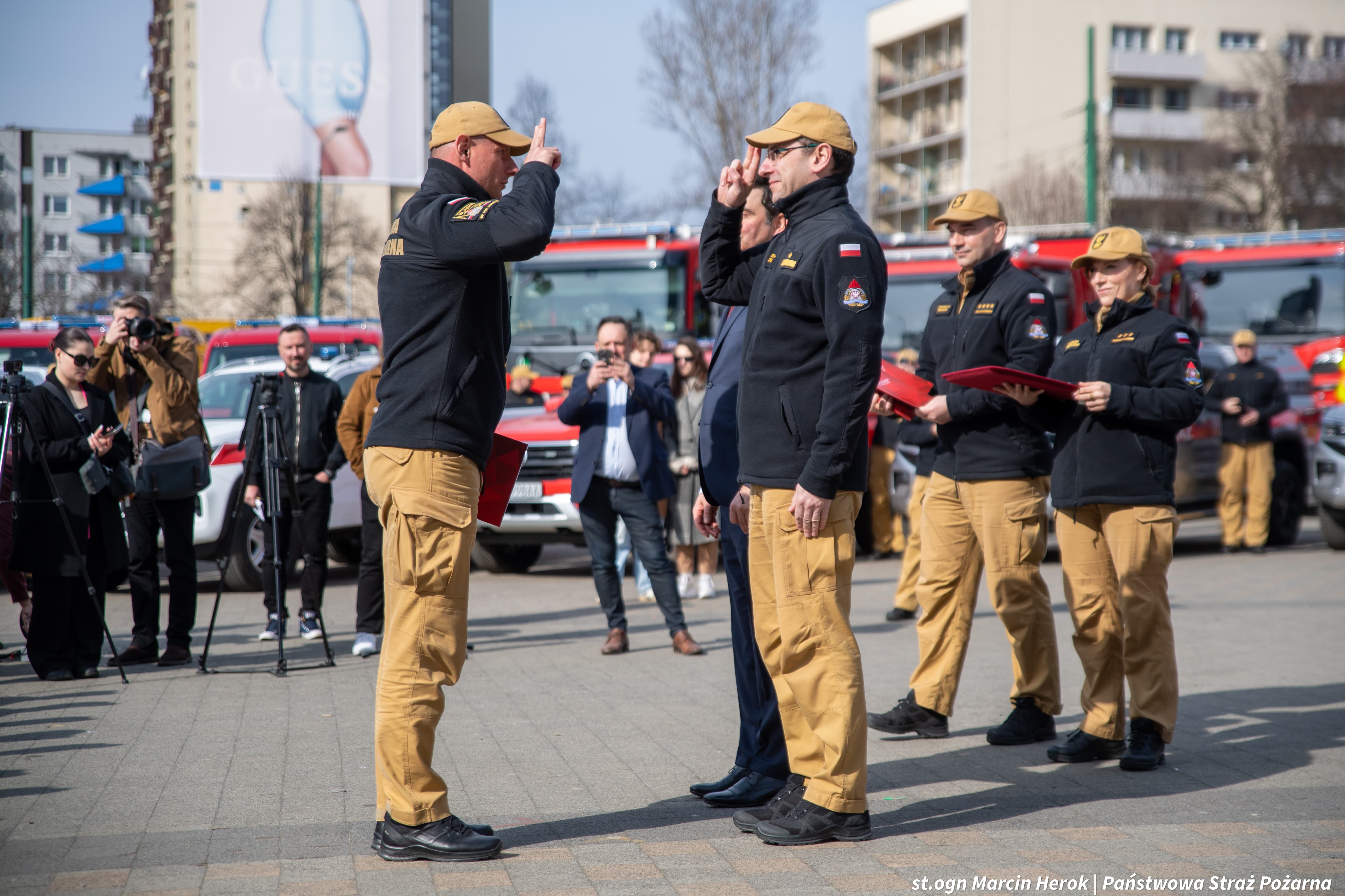 W uroczystości wzięli udział: Pani Gabriela Morawska-Stanecka - Senator RP, Pan Mateusz Bochenek – Poseł na Sejm RP, Pan Marek Wójcik - Wojewoda Śląski, nadbryg. Wojciech Kruczek - Komendant Główny Państwowej Straży Pożarnej, Pan Wojciech Saługa - Marszałek Województwa Śląskiego, st. bryg. Damian Legierski - Śląski Komendant Wojewódzki PSP, Pani Katarzyna Błaszczyk - Domańska - Dyrektor Generalny Śląskiego Urzędu Wojewódzkiego i Pan Maciej Stachura– Wiceprezydent Miasta Katowice.