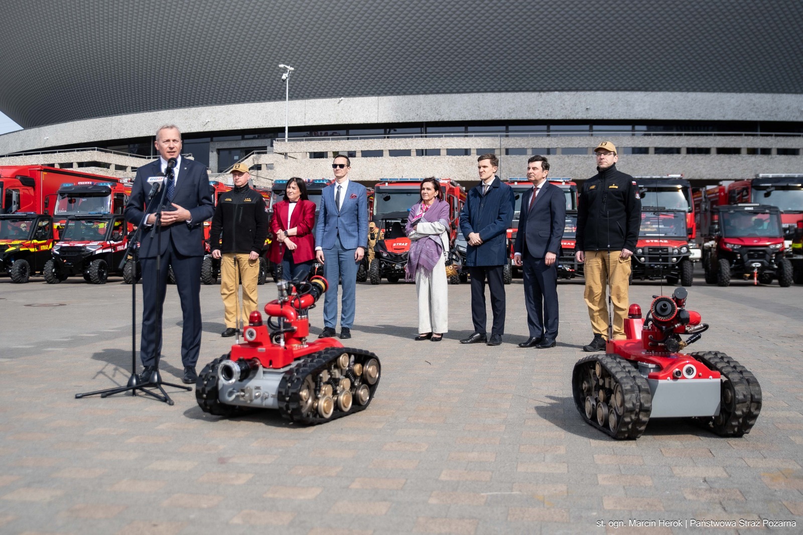 Po przekazaniu zakupionego sprzętu głos zabrał Pan Marek Wójcik – Wojewoda Śląski, który w swoim wystąpieniu podkreślił celowość zrealizowanych zakupów, a do funkcjonariuszy i pracowników cywilnych komend PSP woj. śląskiego, którzy te zakupy i inwestycje realizowali zwrócił się słowami „… Myślę, że dziś obserwując ten sprzęt tutaj na placu przed Spodkiem, wszyscy Państwo macie uczucie satysfakcji z tej pracy, którą wykonaliście, często bardzo ciężkiej ...”.