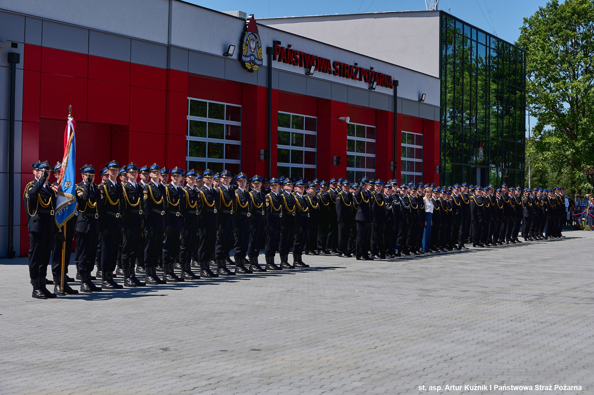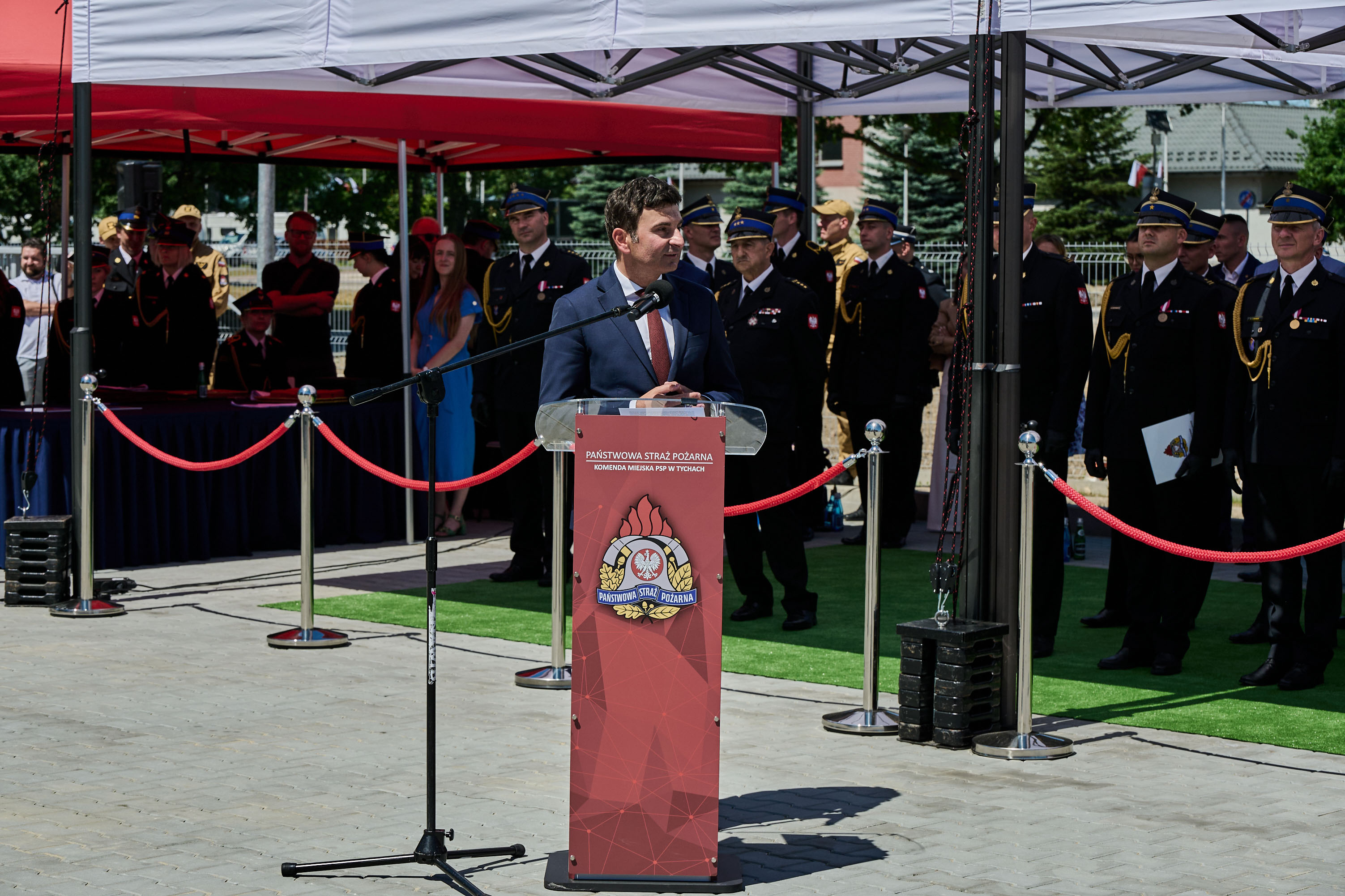 Komendant Miejski PSP w Tychach - st. bryg. Wojciech Rapka, powitał przybyłych gości, a w swoim przemówieniu podkreślił, że nadanie sztandaru stanowi nie tylko symboliczny gest, ale także wyraz uznania dla służby, poświęcenia i zaangażowania strażaków, a dzisiejsza uroczystość jest również okazją do świętowania otwarcia nowego obiektu jednostki ratowniczo-gaśniczej. Na zakończenie Komendant wyraził wdzięczność wszystkim, którzy przyczynili się do realizacji tego przedsięwzięcia, oraz złożył gratulacje osobom wyróżnionym i awansowanym.