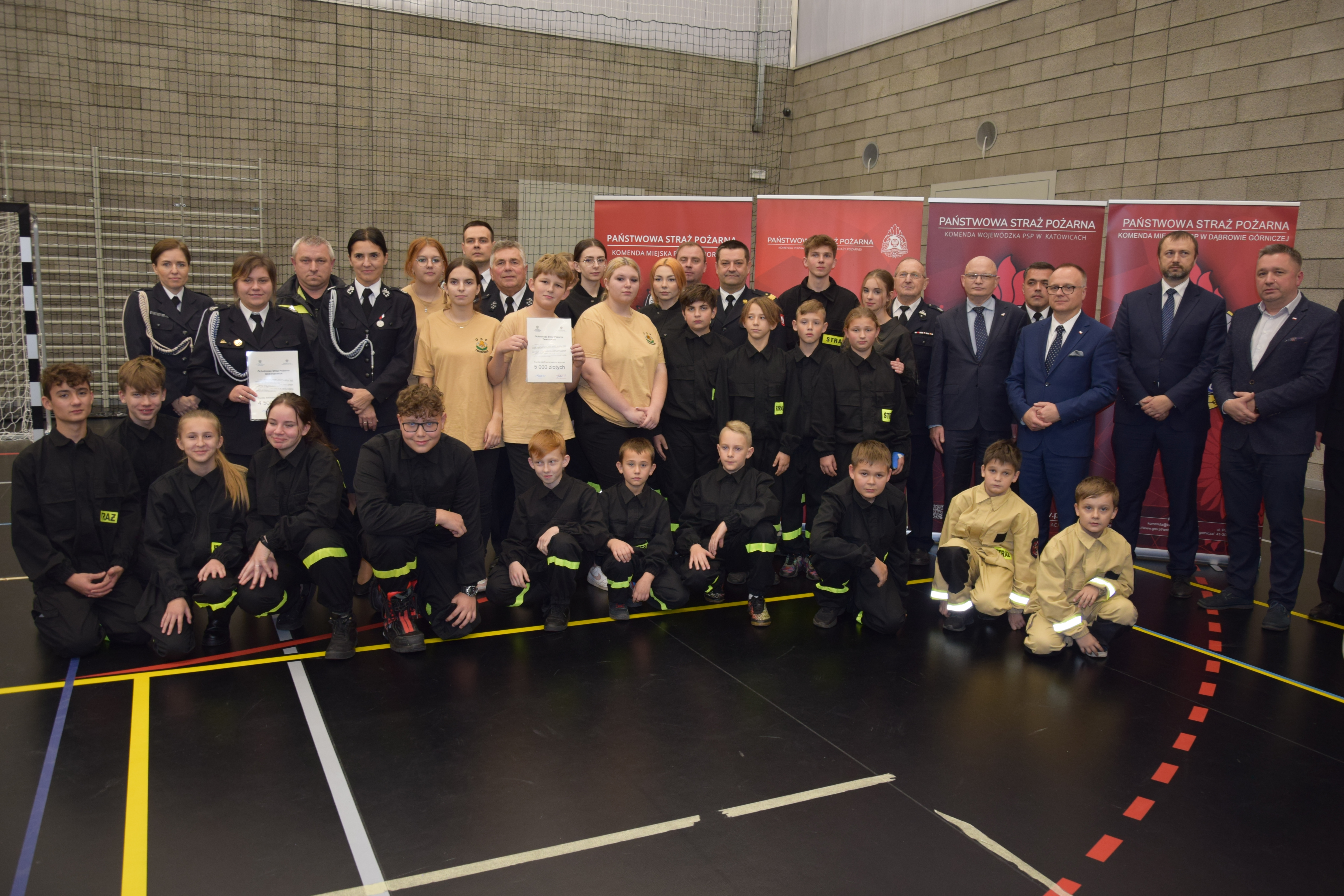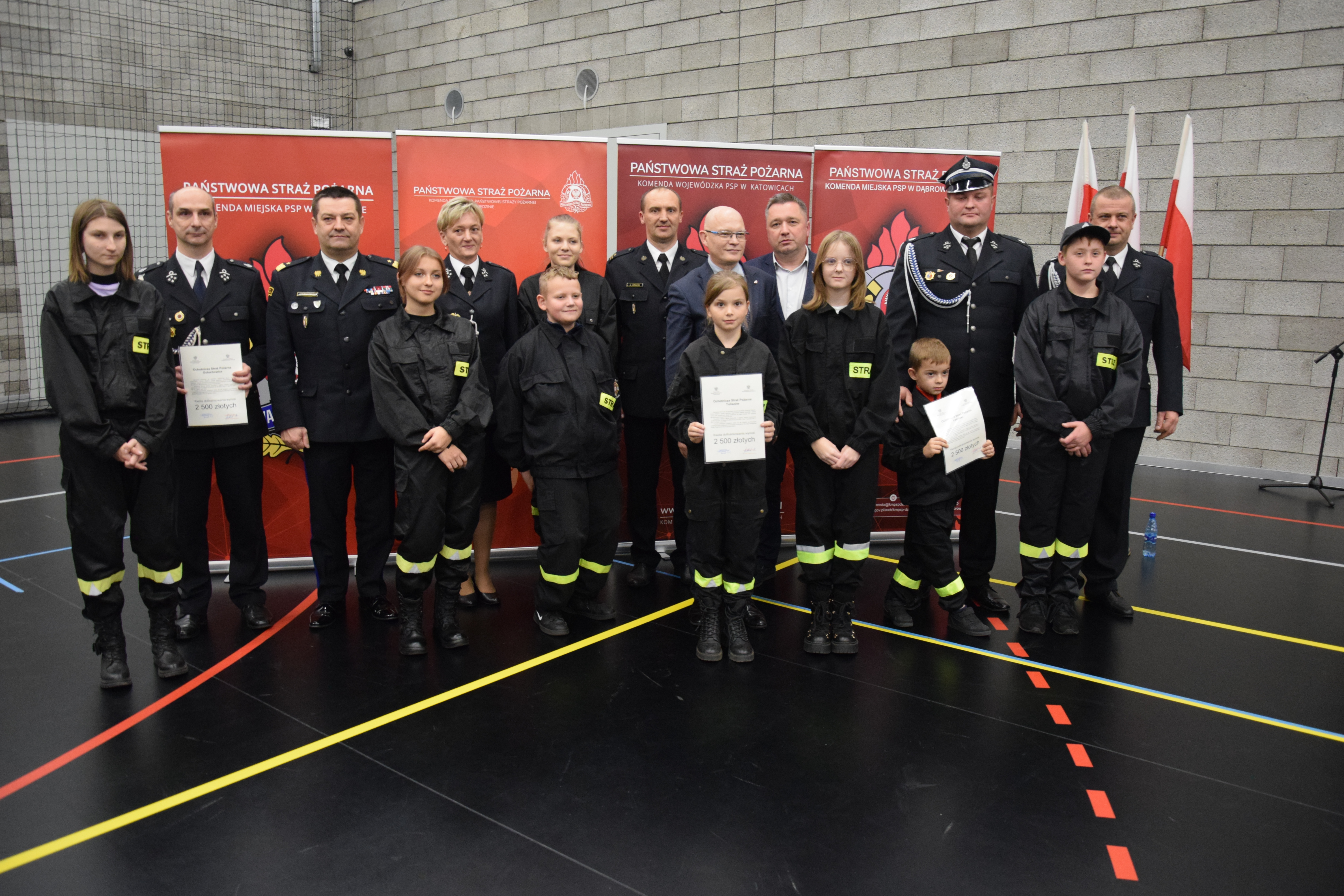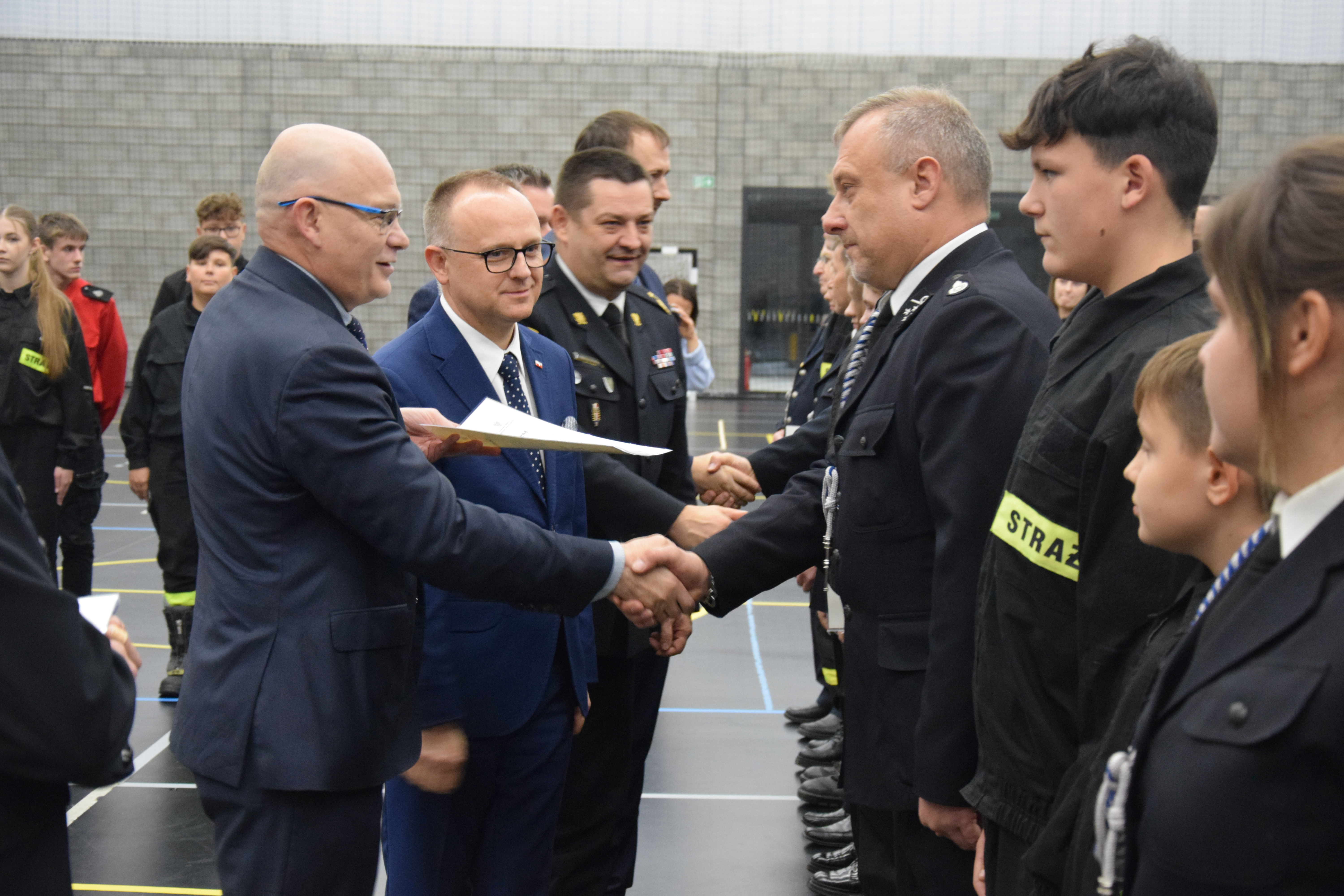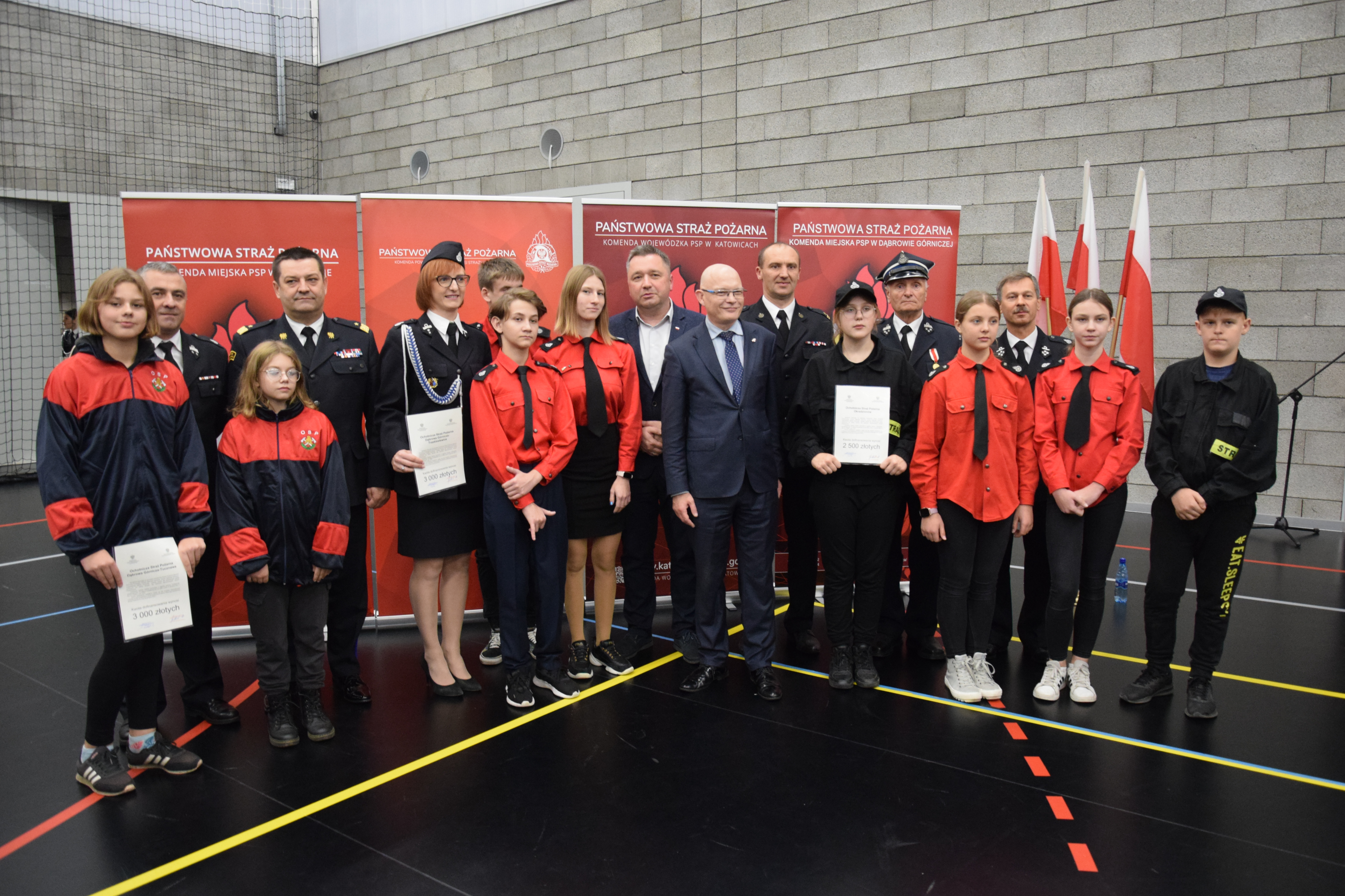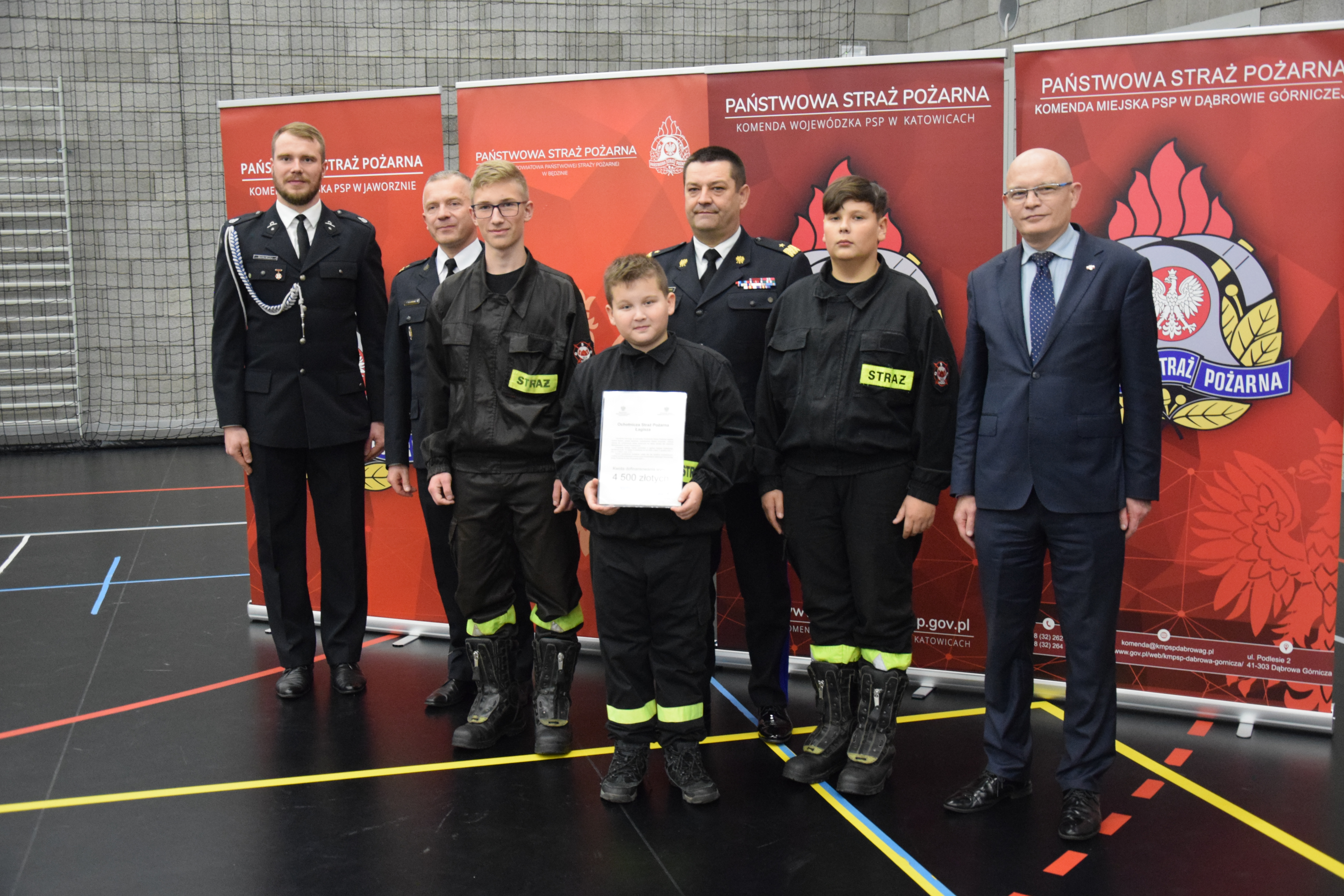 Uroczystość wręczenia promes dotacji celowej dla ochotniczych straży pożarnych na zakup sprzętu dla członków Młodzieżowych Drużyn Pożarniczych z powiatu będzińskiego, Jaworzna oraz Dąbrowy Górniczej