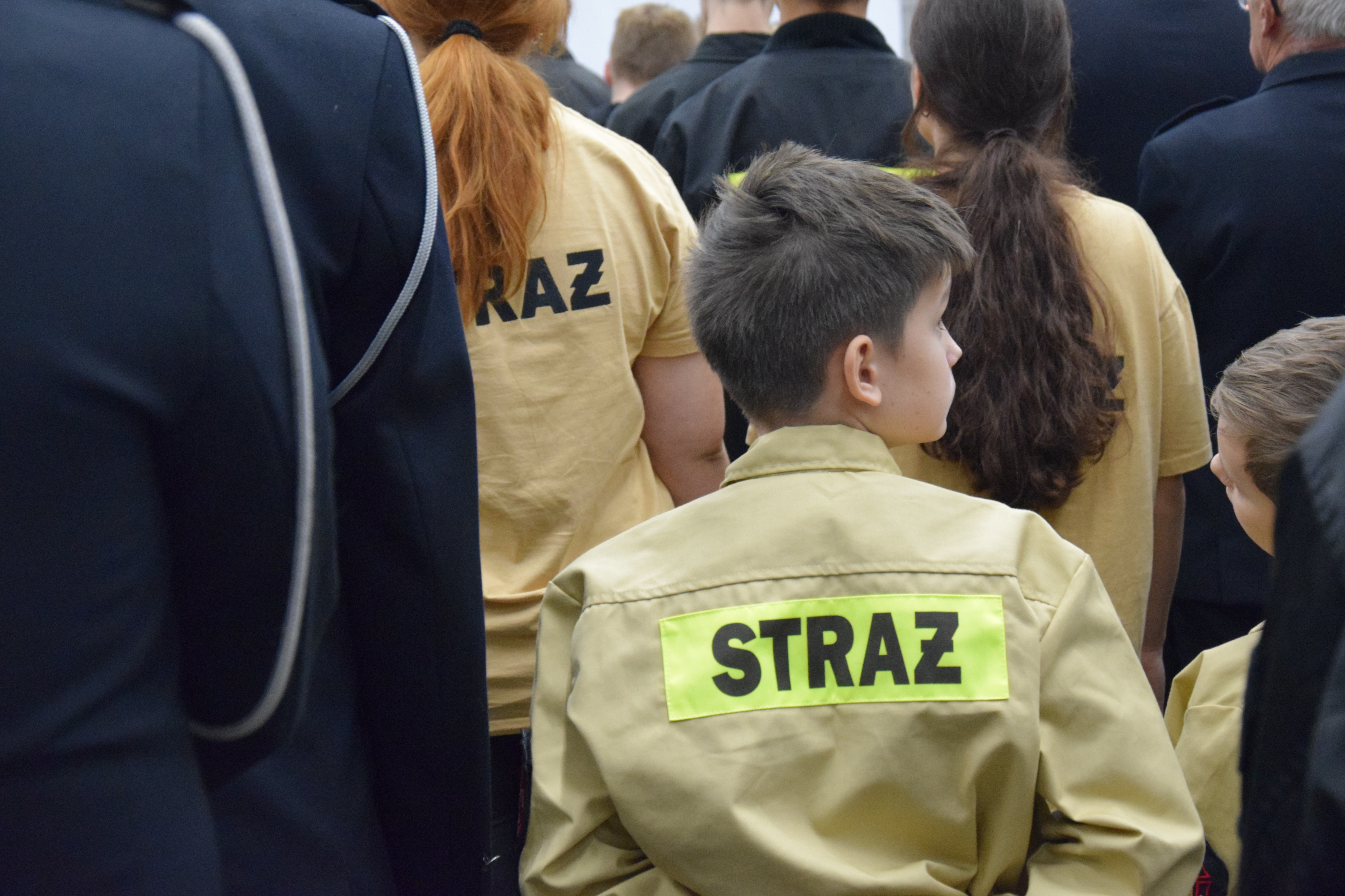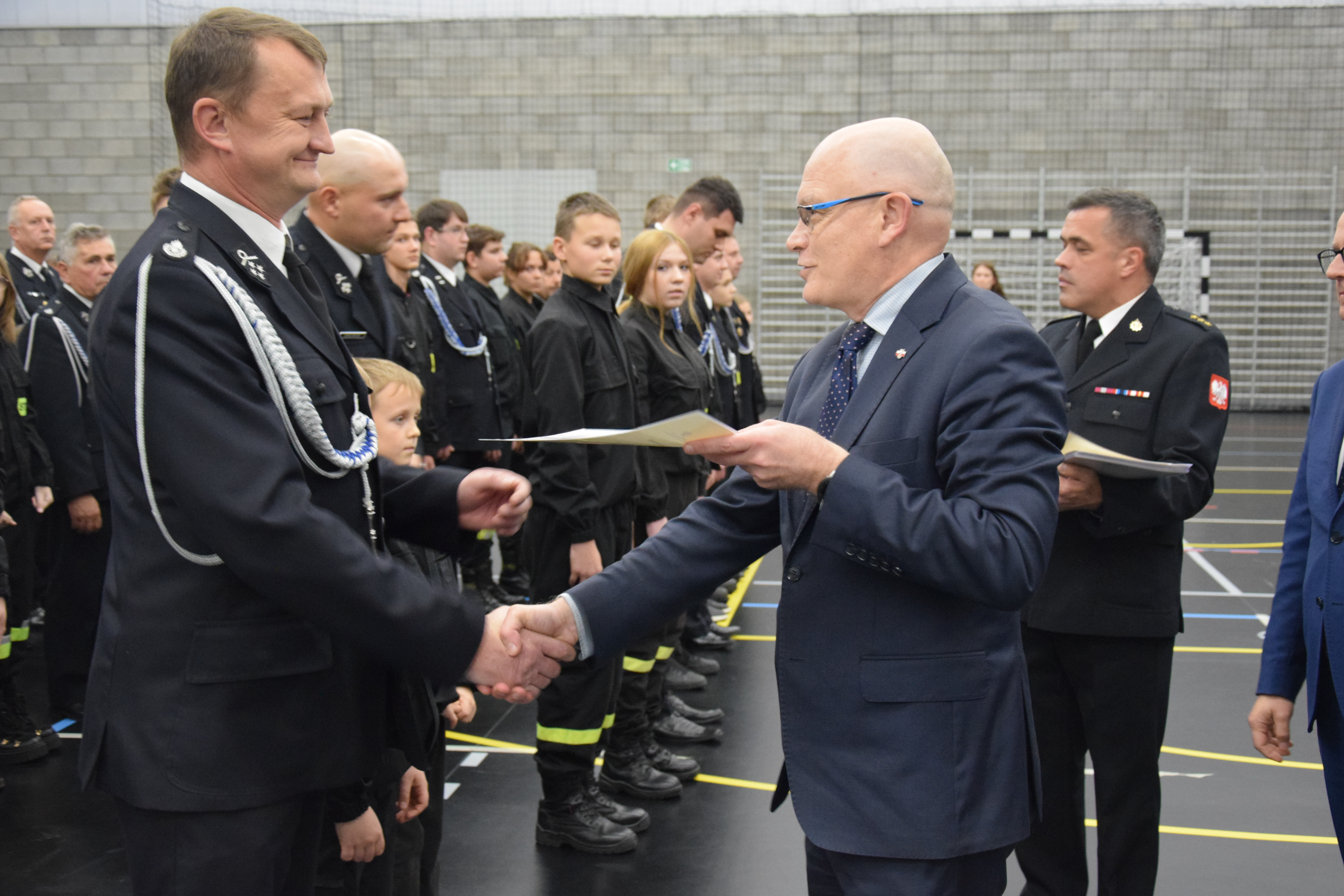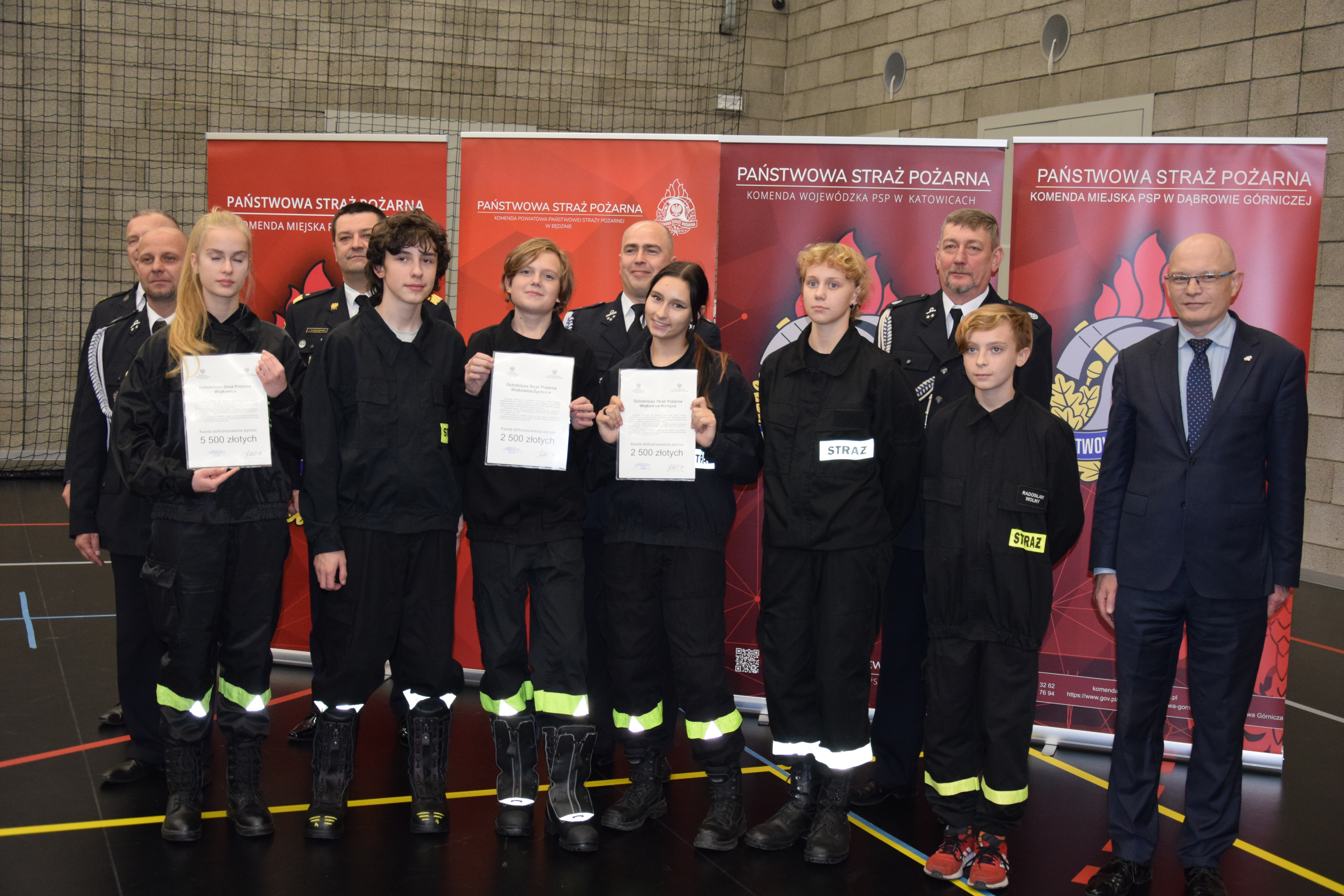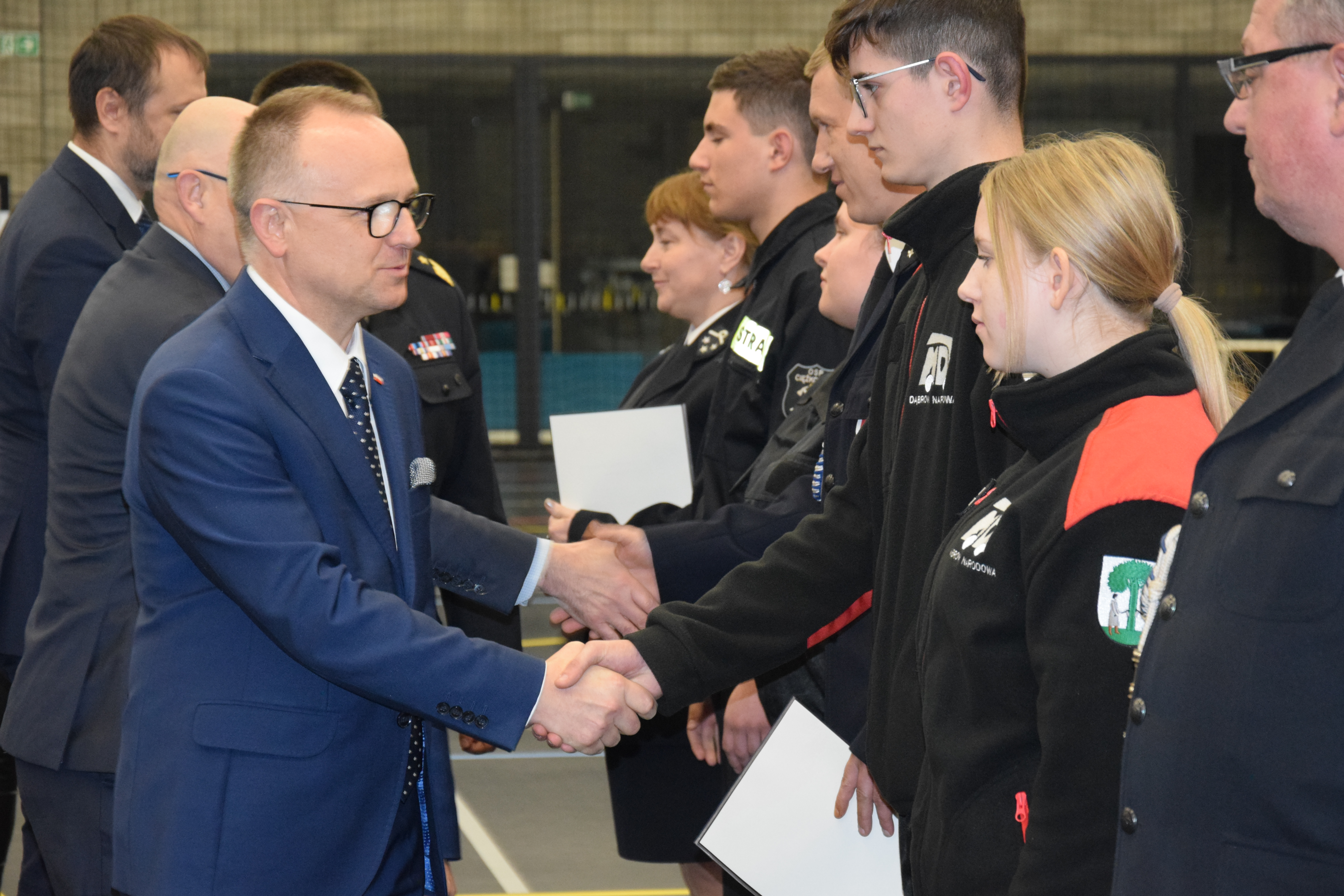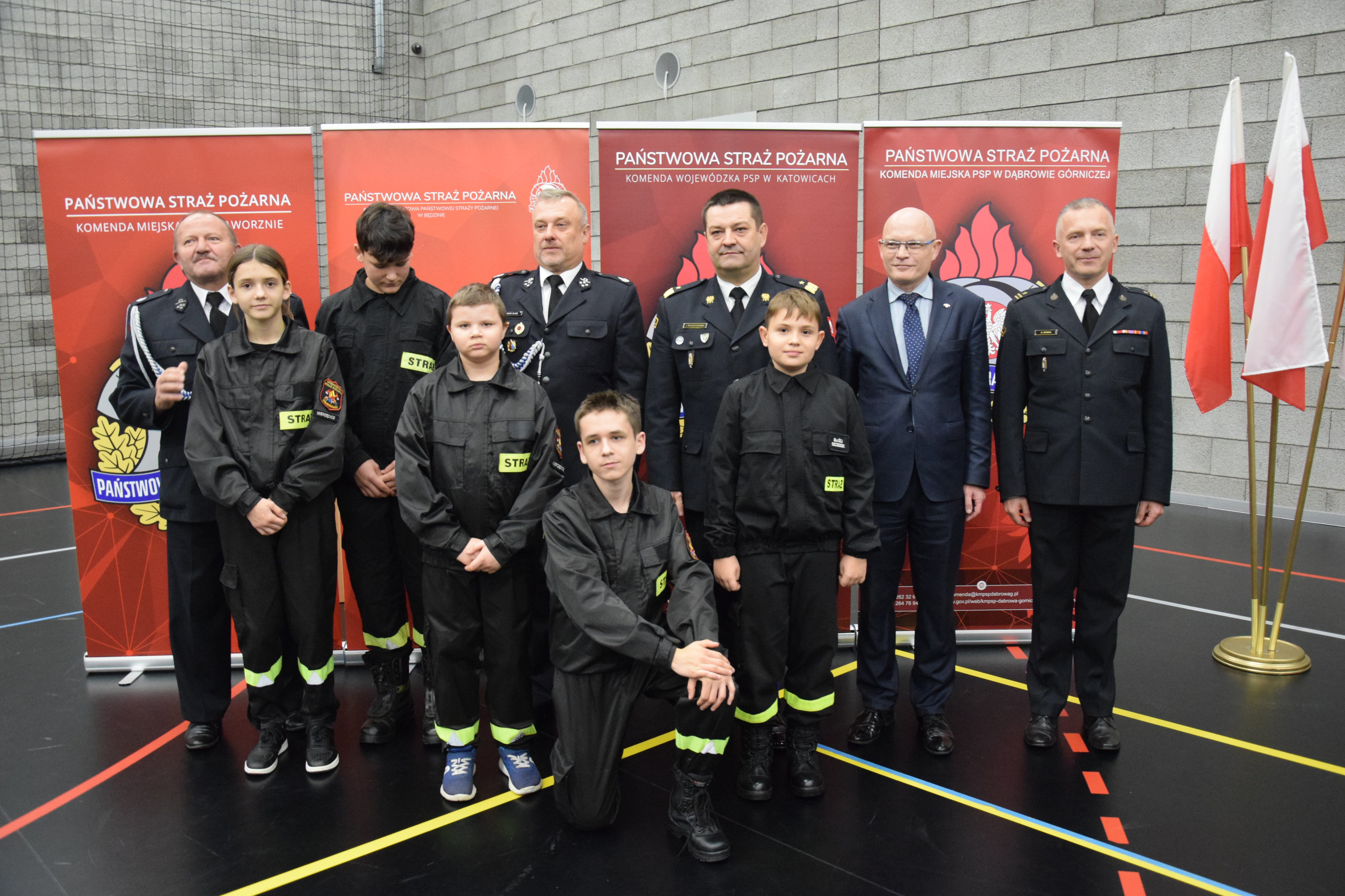 Uroczystość wręczenia promes dotacji celowej dla ochotniczych straży pożarnych na zakup sprzętu dla członków Młodzieżowych Drużyn Pożarniczych z powiatu będzińskiego, Jaworzna oraz Dąbrowy Górniczej