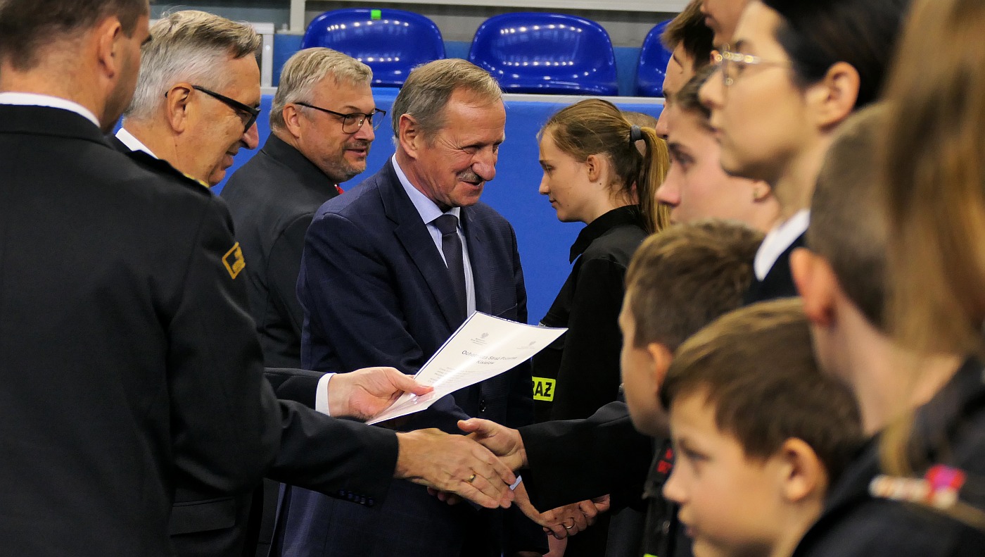 Uroczystość wręczenia promes dotacji celowej dla Ochotniczych Straży Pożarnych na zakup sprzętu dla członków Młodzieżowych Drużyn Pożarniczych z terenu powiatu cieszyńskiego