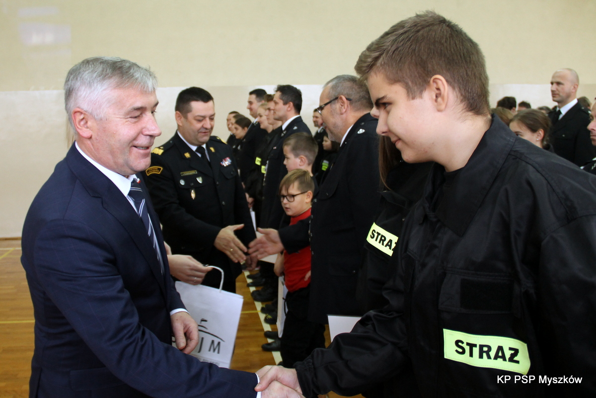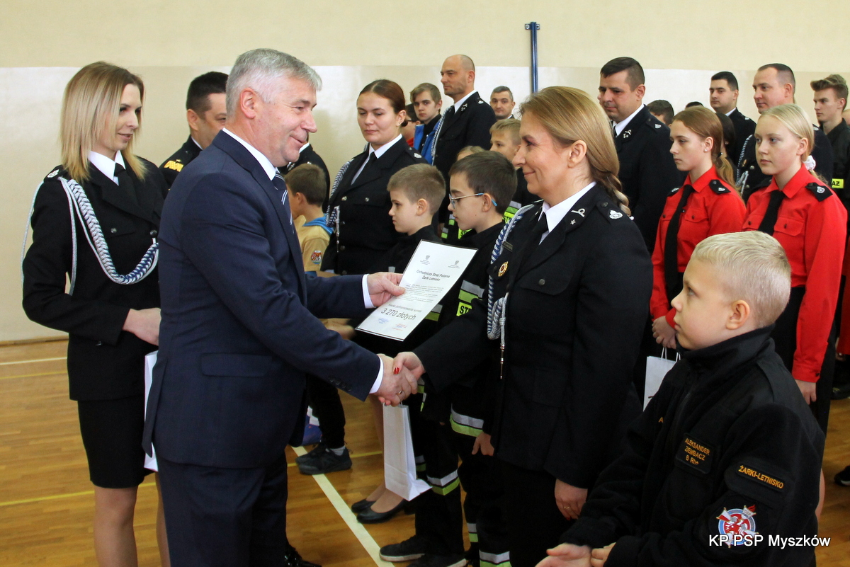 Uroczystość wręczenia promes dotacji celowej dla Ochotniczych Straży Pożarnych na zakup sprzętu dla członków Młodzieżowych Drużyn Pożarniczych z terenu powiatu myszkowskiego
